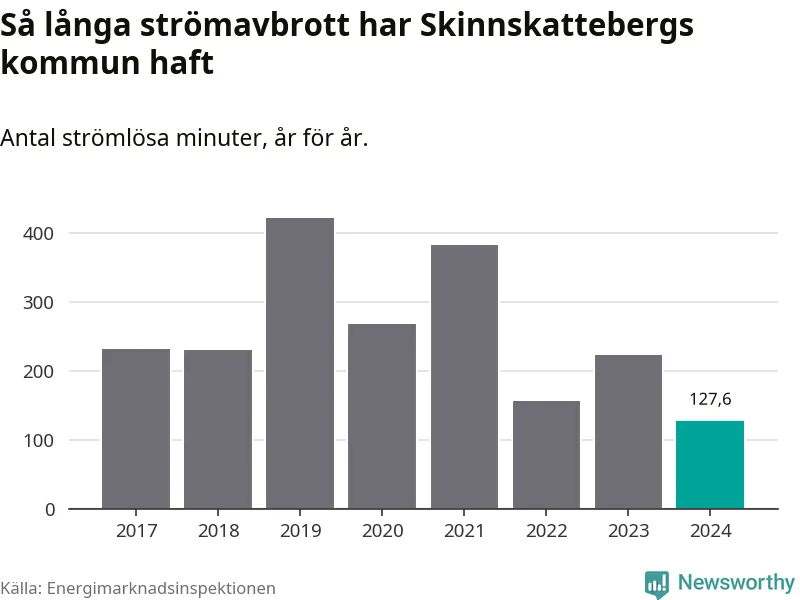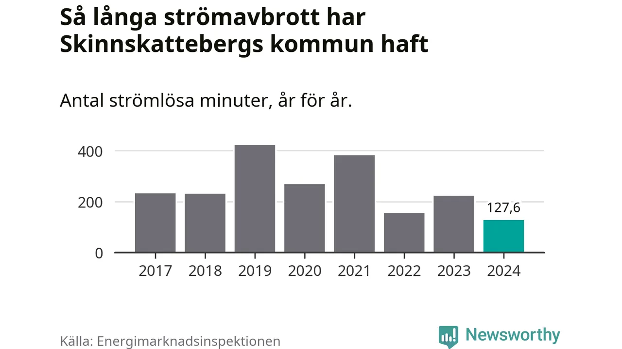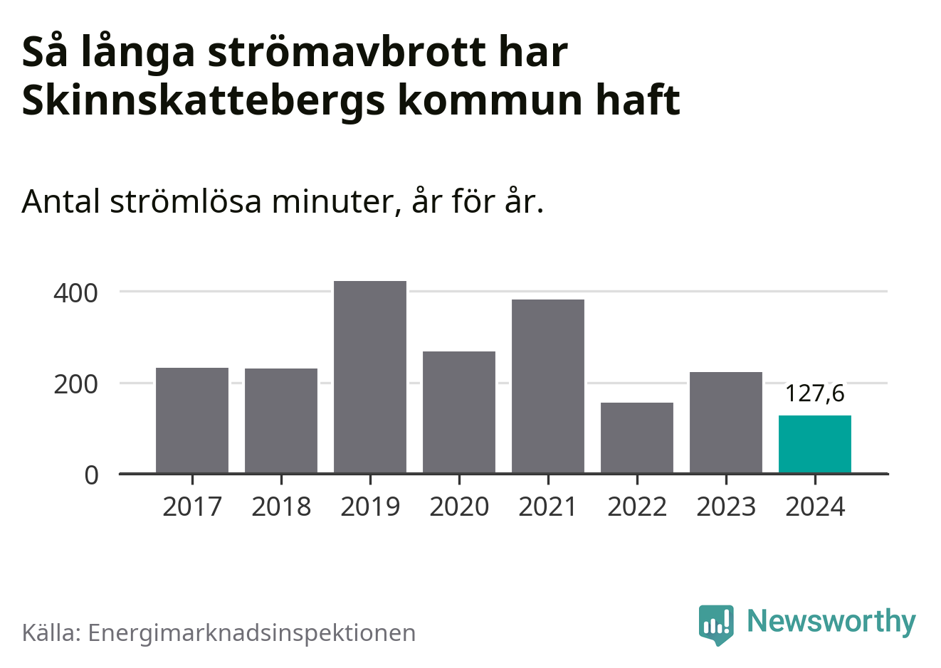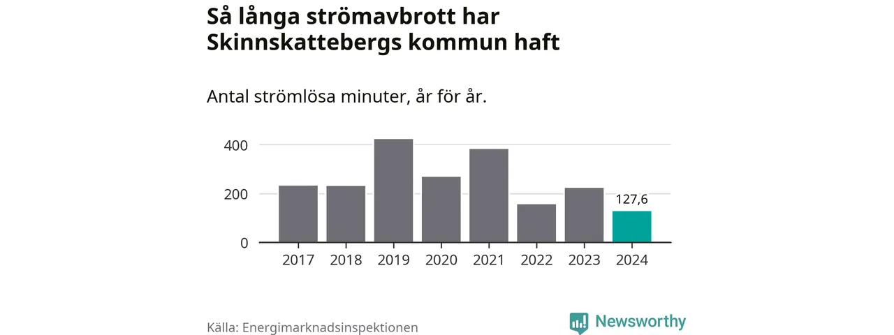 Antalet strömavbrott och total strömlös tid varierar något från år till år i Skinnskattebergs kommun. Mest tid utan ström (i alla fall under perioden 2017–2024) fick Skinnskattebergsborna genomleva under 2019 – sju timmar och tre minuter. Det är tre timmar och elva minuter längre än under ett normalår.