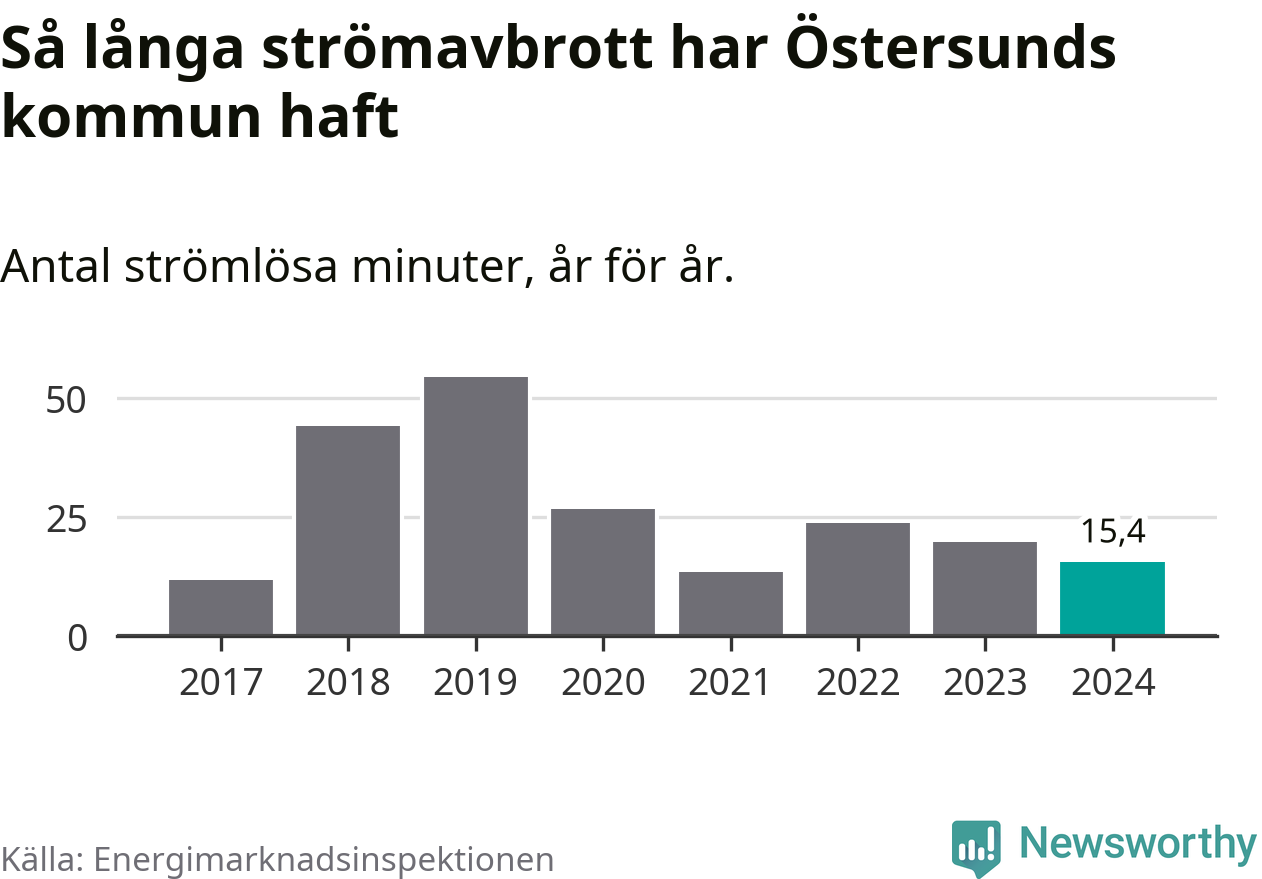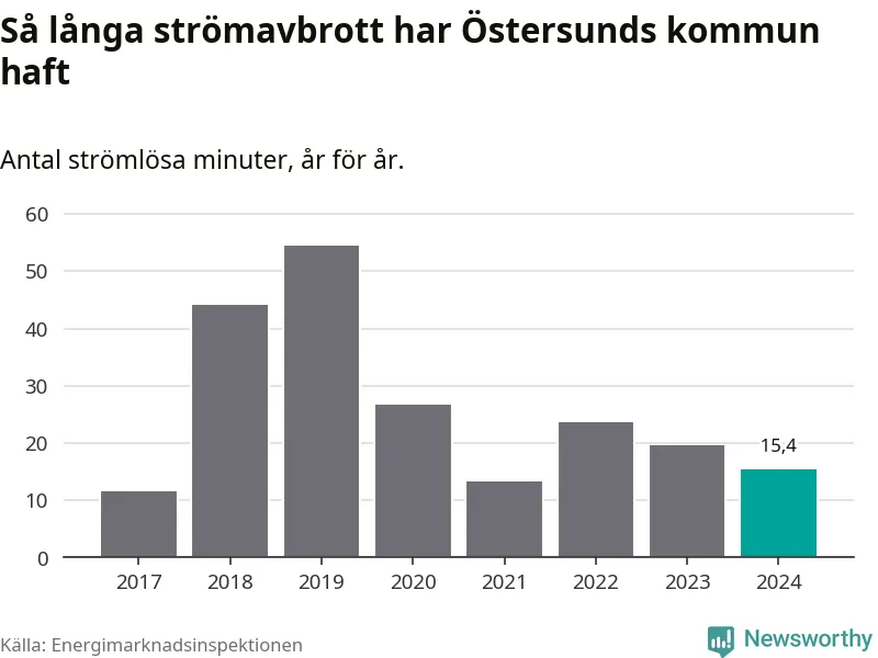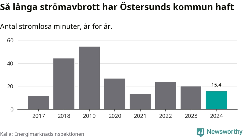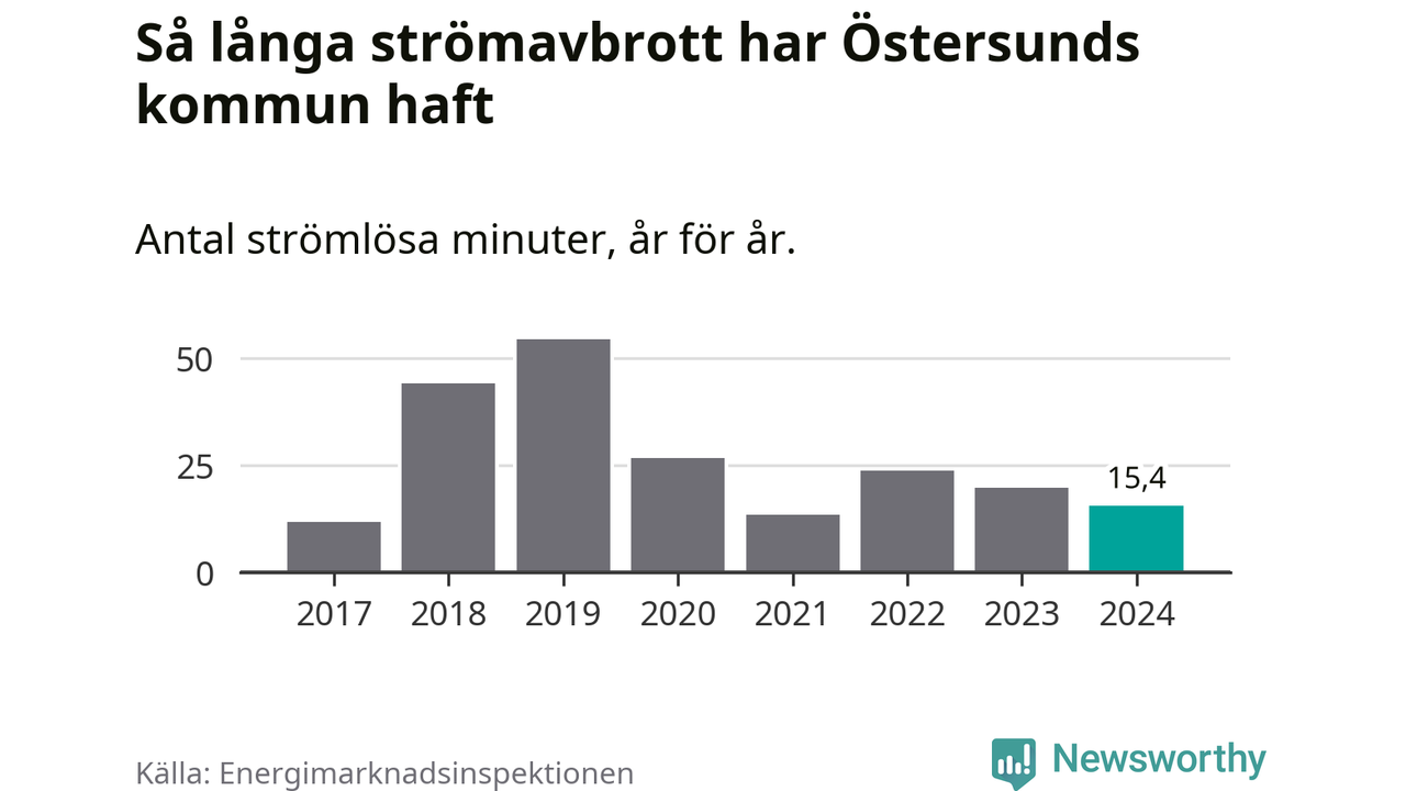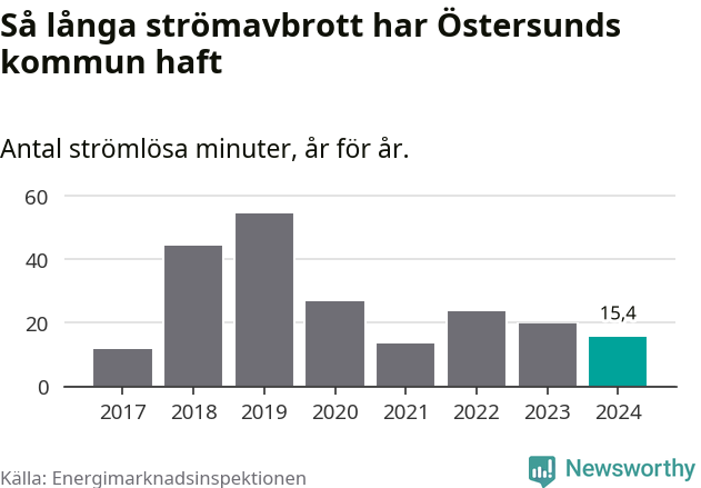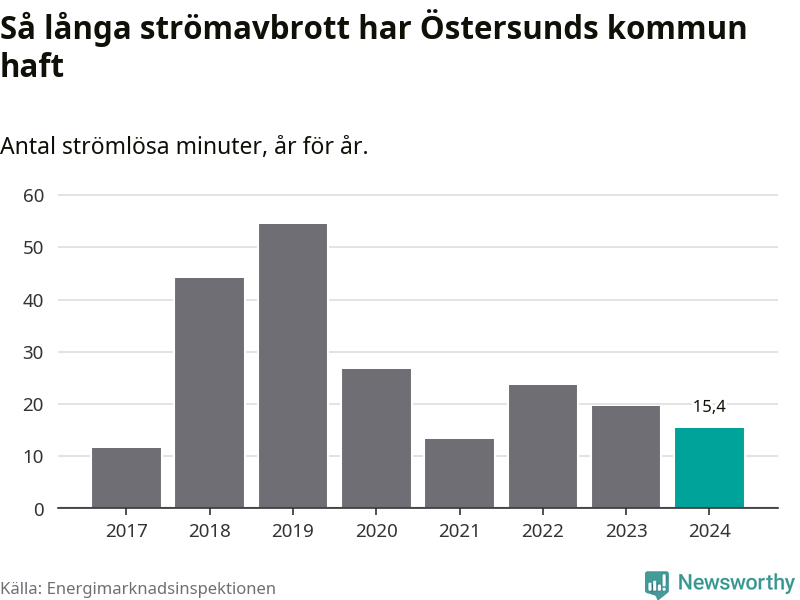 Antalet strömavbrott och total strömlös tid varierar något från år till år i Östersunds kommun. Mest tid utan ström (i alla fall under perioden 2017–2024) fick Östersundsborna genomleva under 2019 – 54 minuter. Det är 33 minuter längre än under ett normalår.
