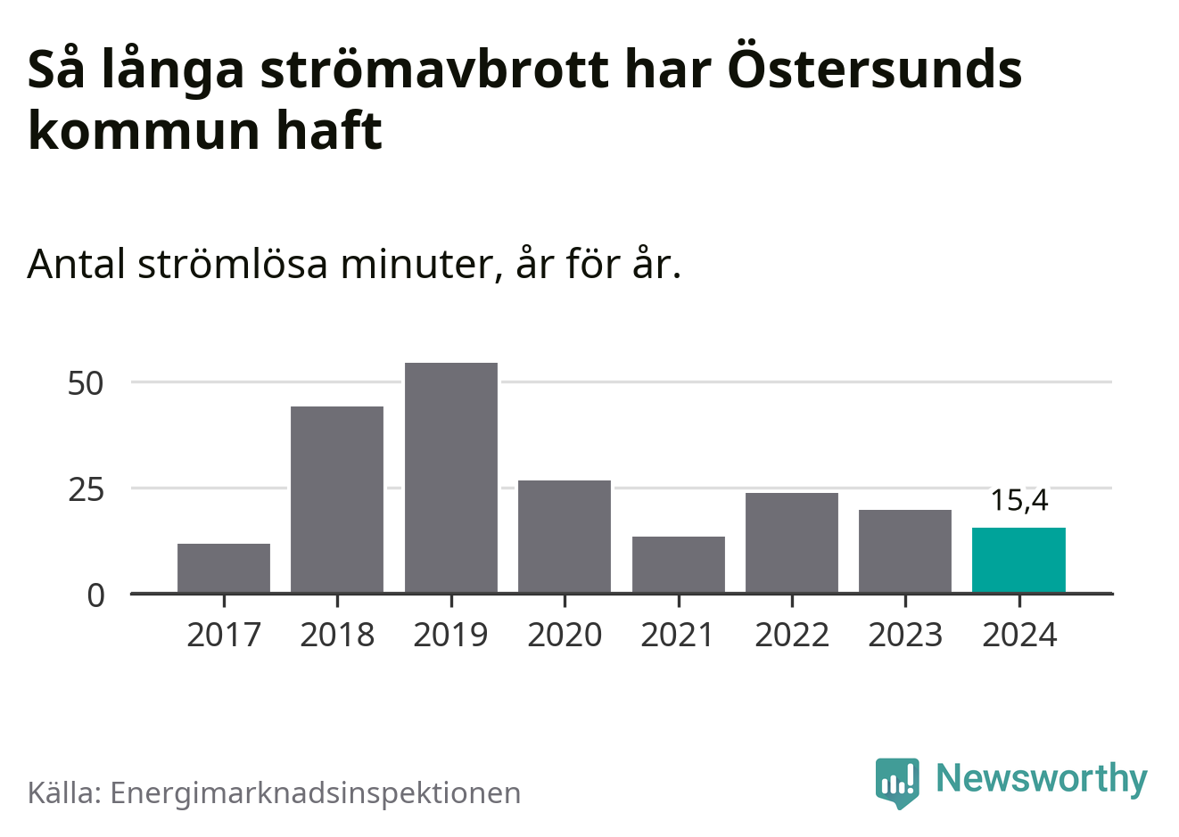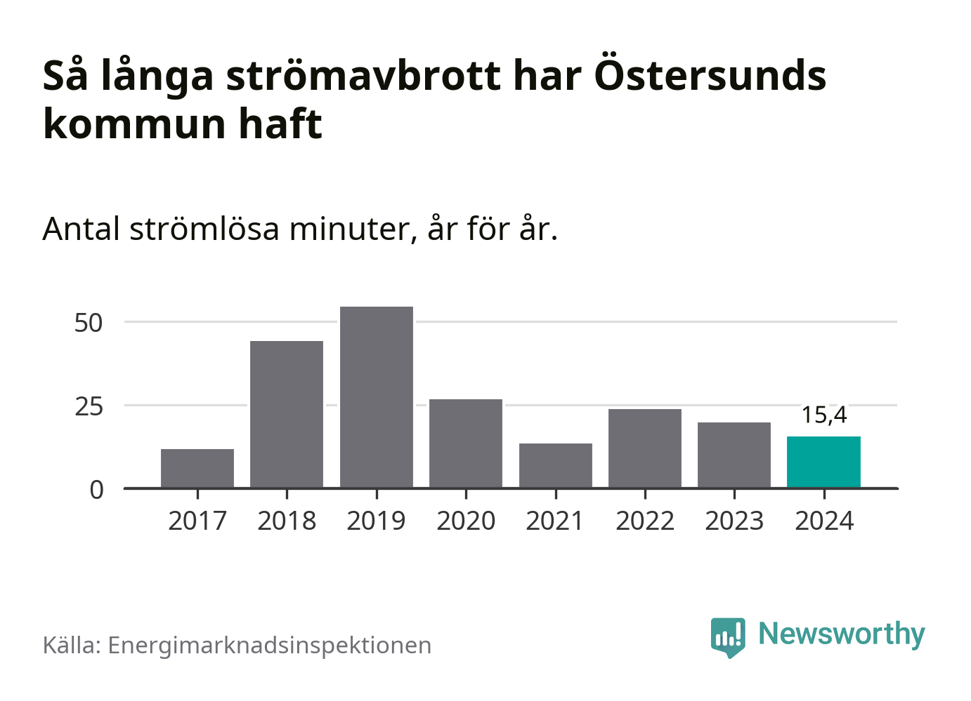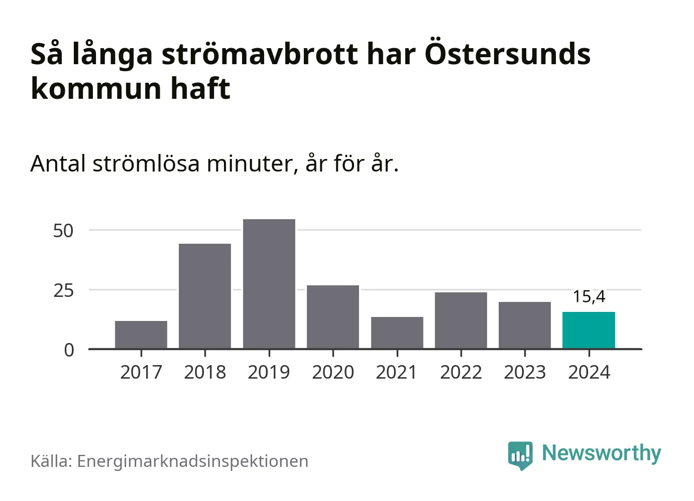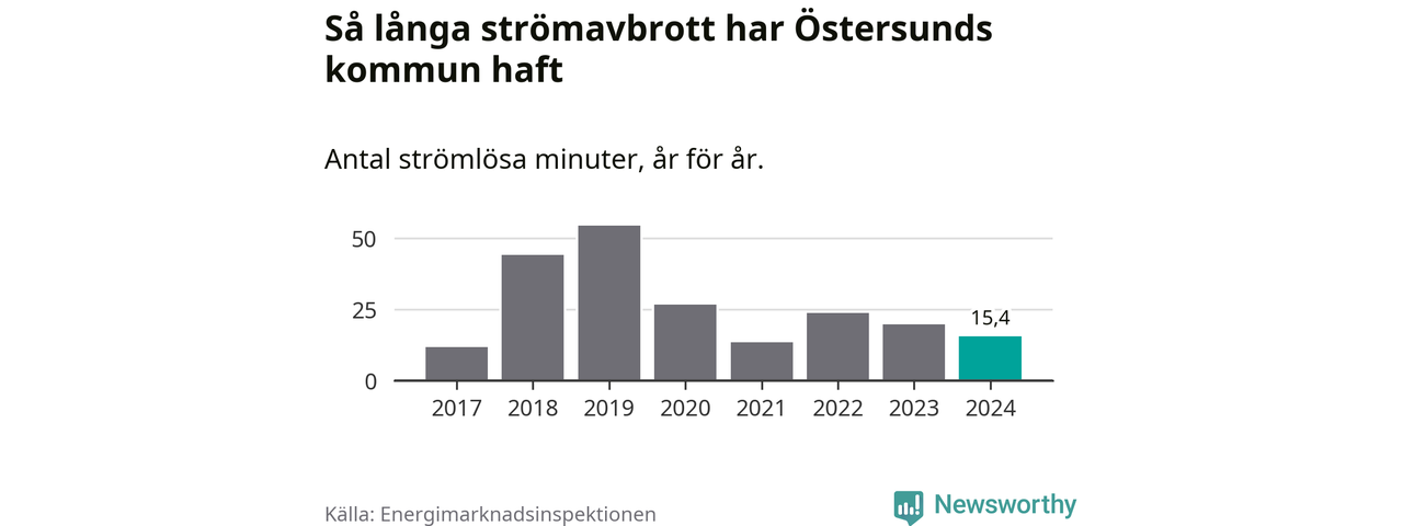 Antalet strömavbrott och total strömlös tid varierar något från år till år i Östersunds kommun. Mest tid utan ström (i alla fall under perioden 2017–2024) fick Östersundsborna genomleva under 2019 – 54 minuter. Det är 33 minuter längre än under ett normalår.