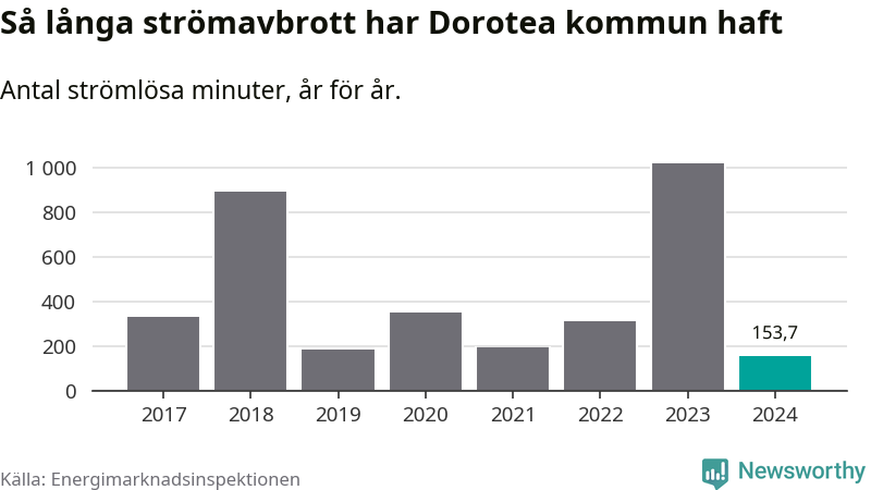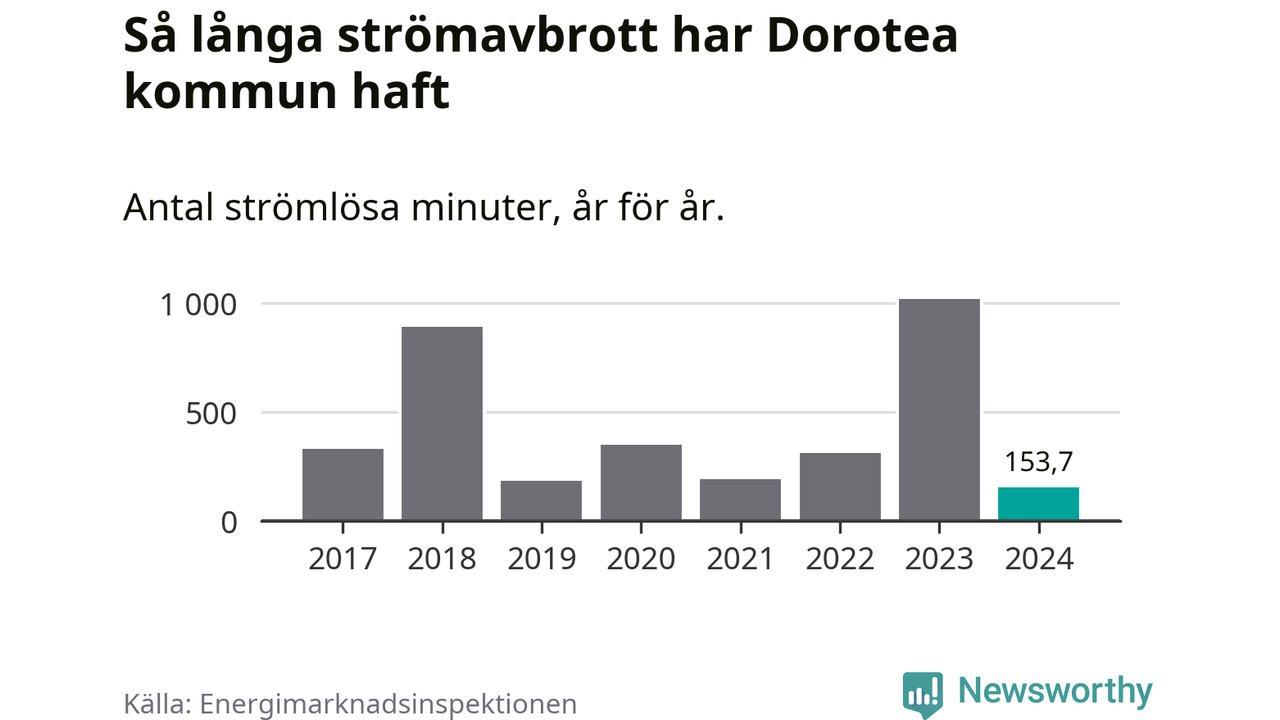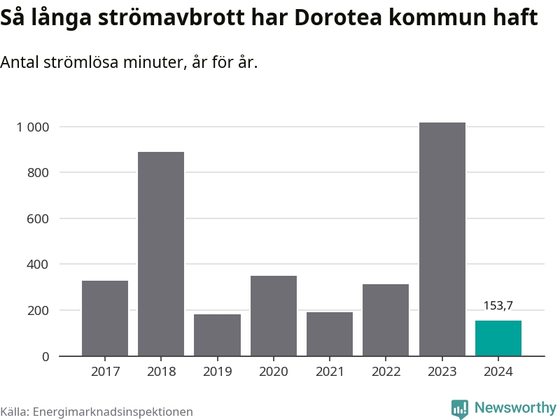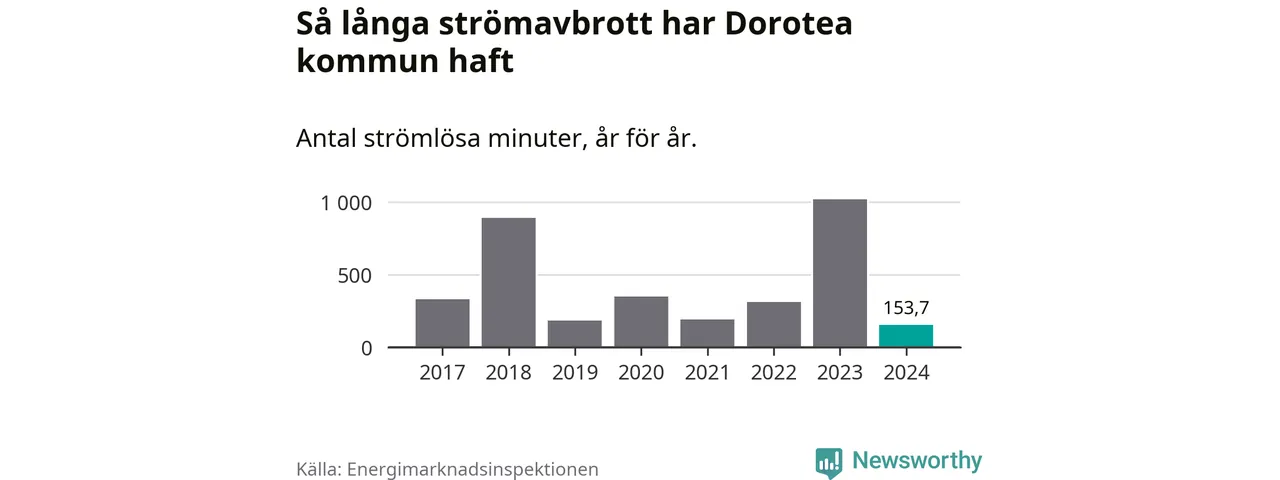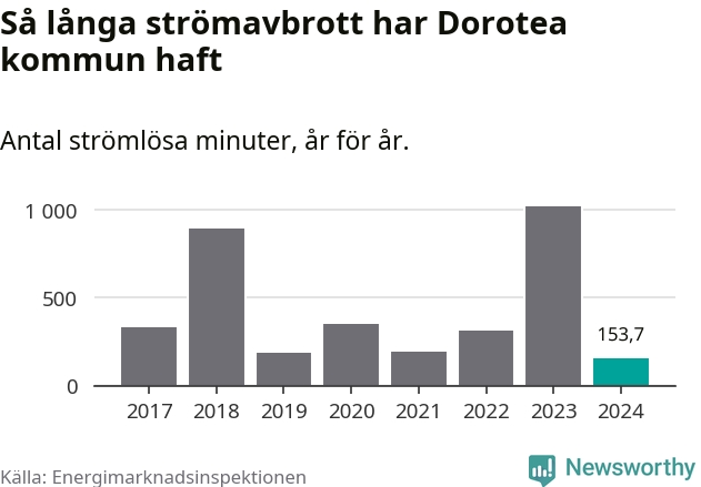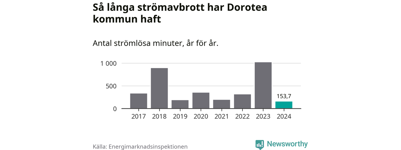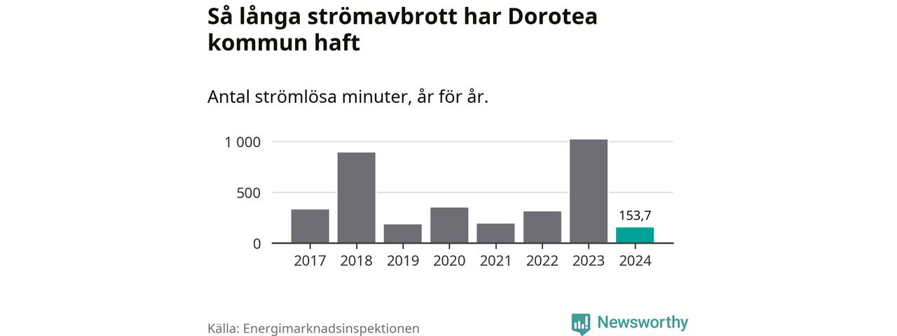 Antalet strömavbrott och total strömlös tid varierar från år till år i Dorotea kommun. Mest tid utan ström (i alla fall under perioden 2017–2024) fick Doroteaborna genomleva under 2023 – 16 timmar och 58 minuter. Det är elva timmar och 37 minuter längre än under ett normalår.