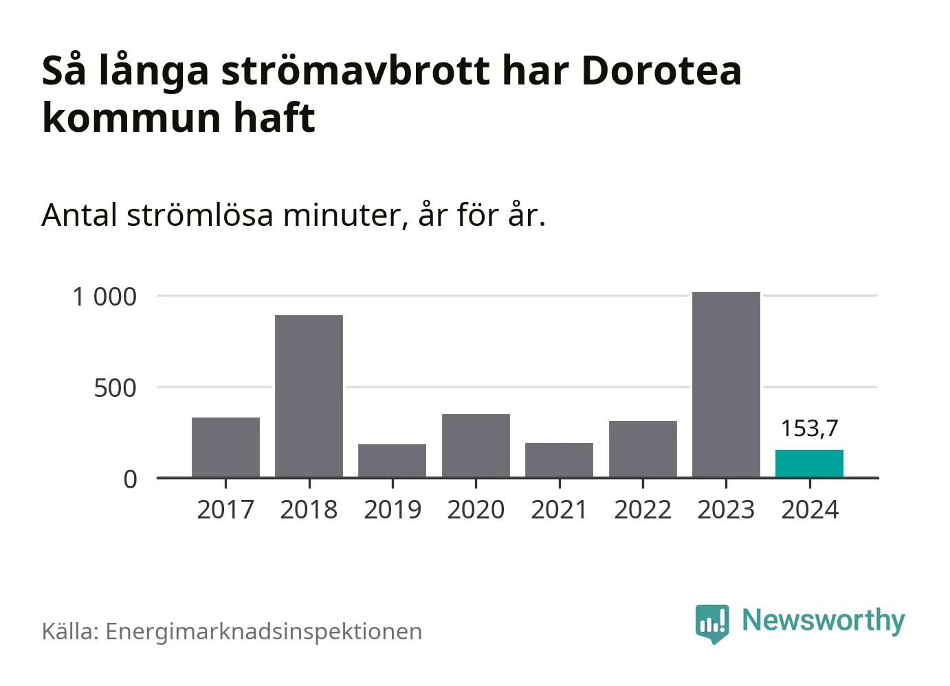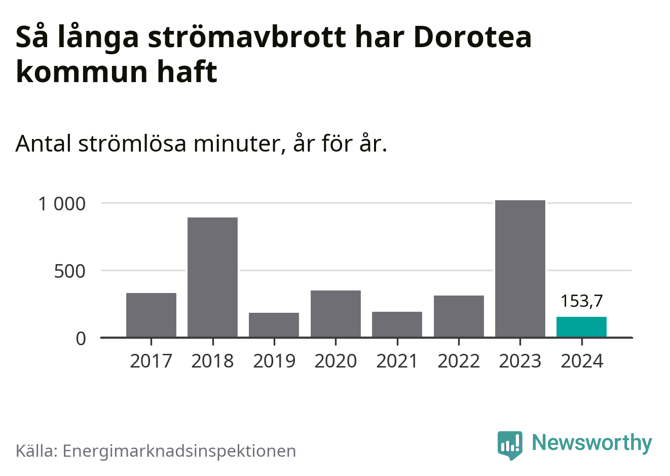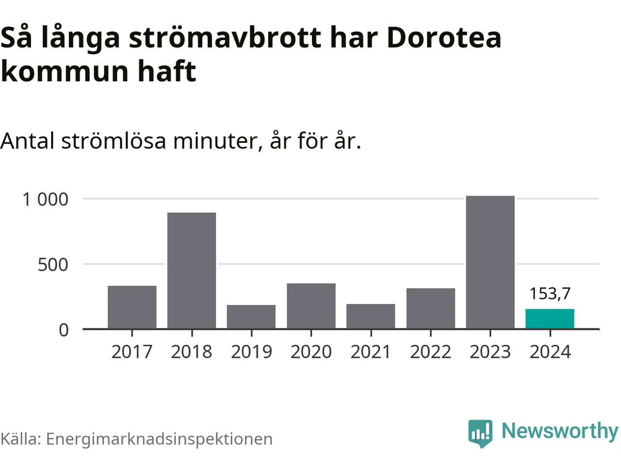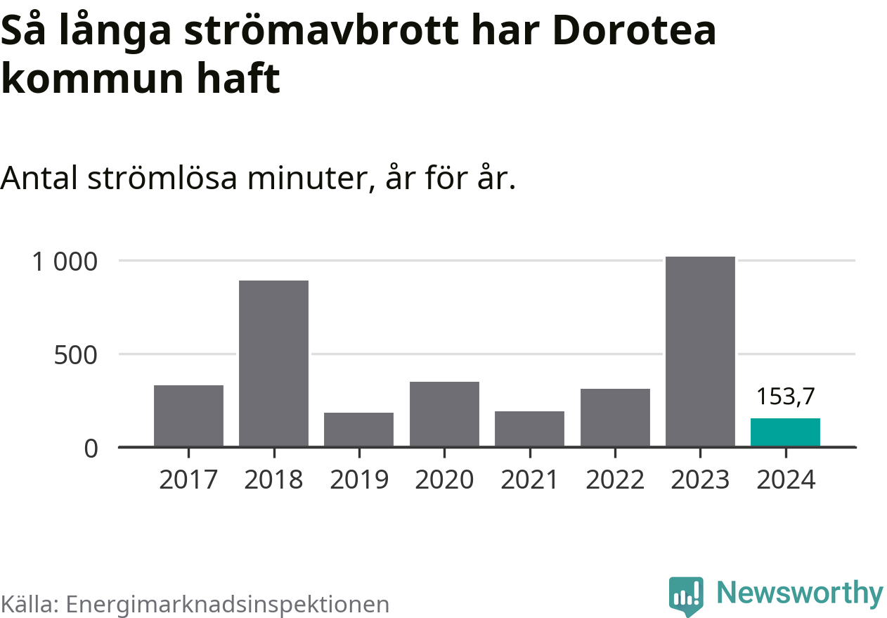 Antalet strömavbrott och total strömlös tid varierar från år till år i Dorotea kommun. Mest tid utan ström (i alla fall under perioden 2017–2024) fick Doroteaborna genomleva under 2023 – 16 timmar och 58 minuter. Det är elva timmar och 37 minuter längre än under ett normalår.
