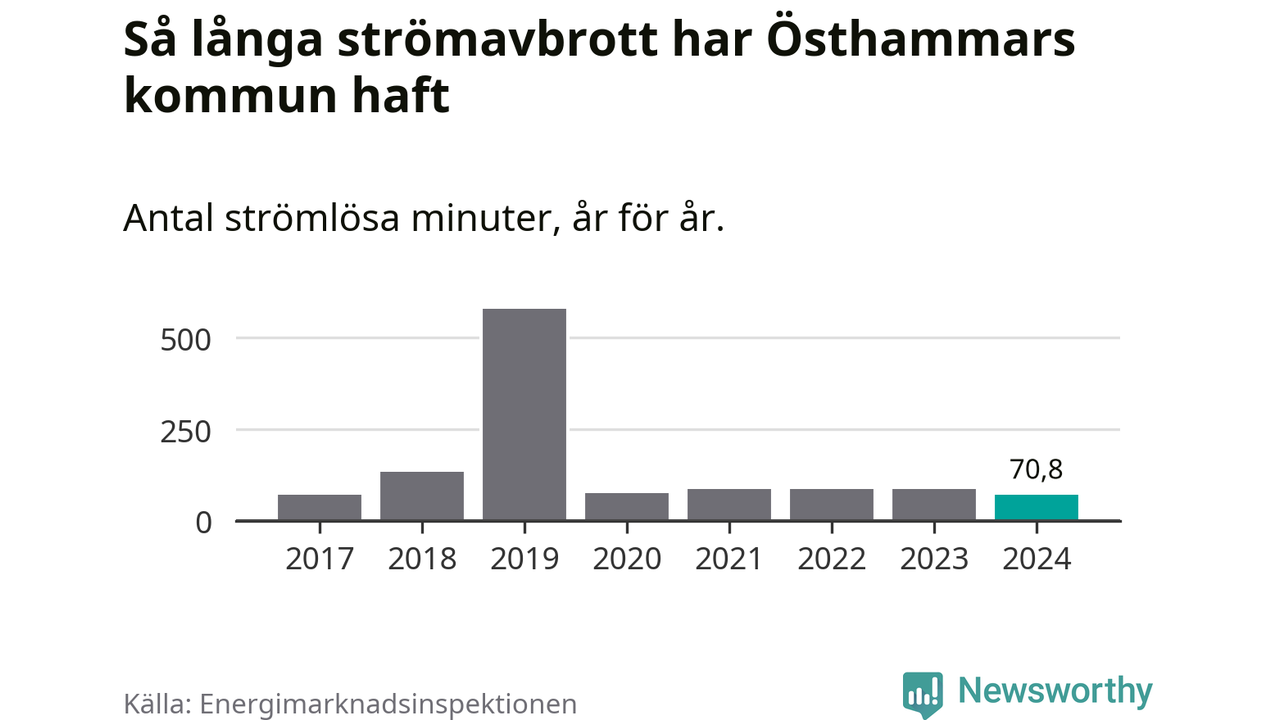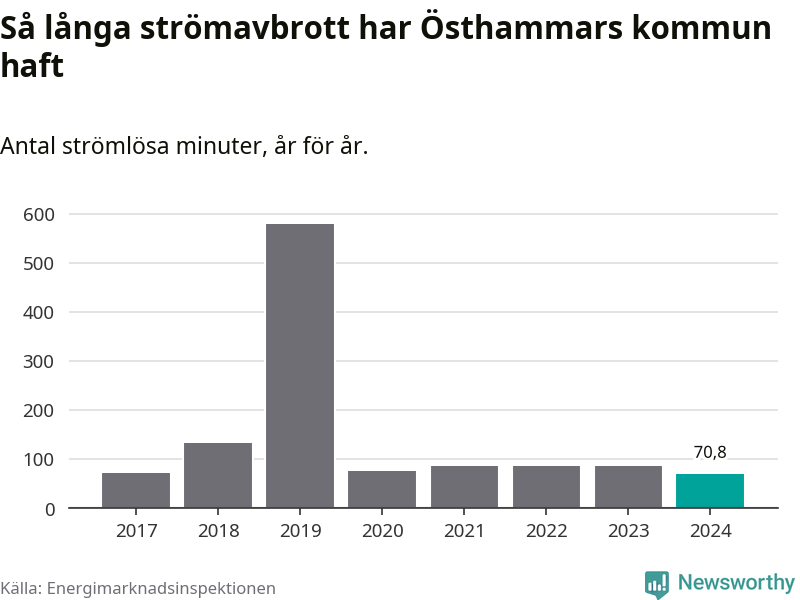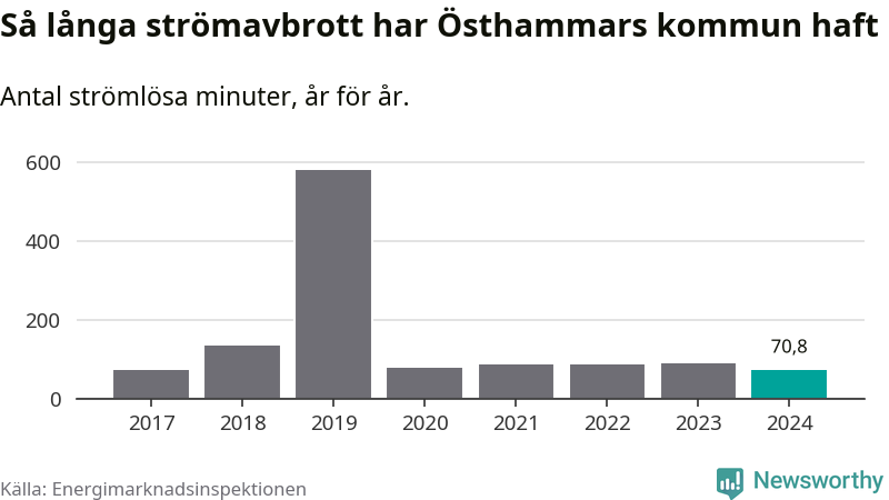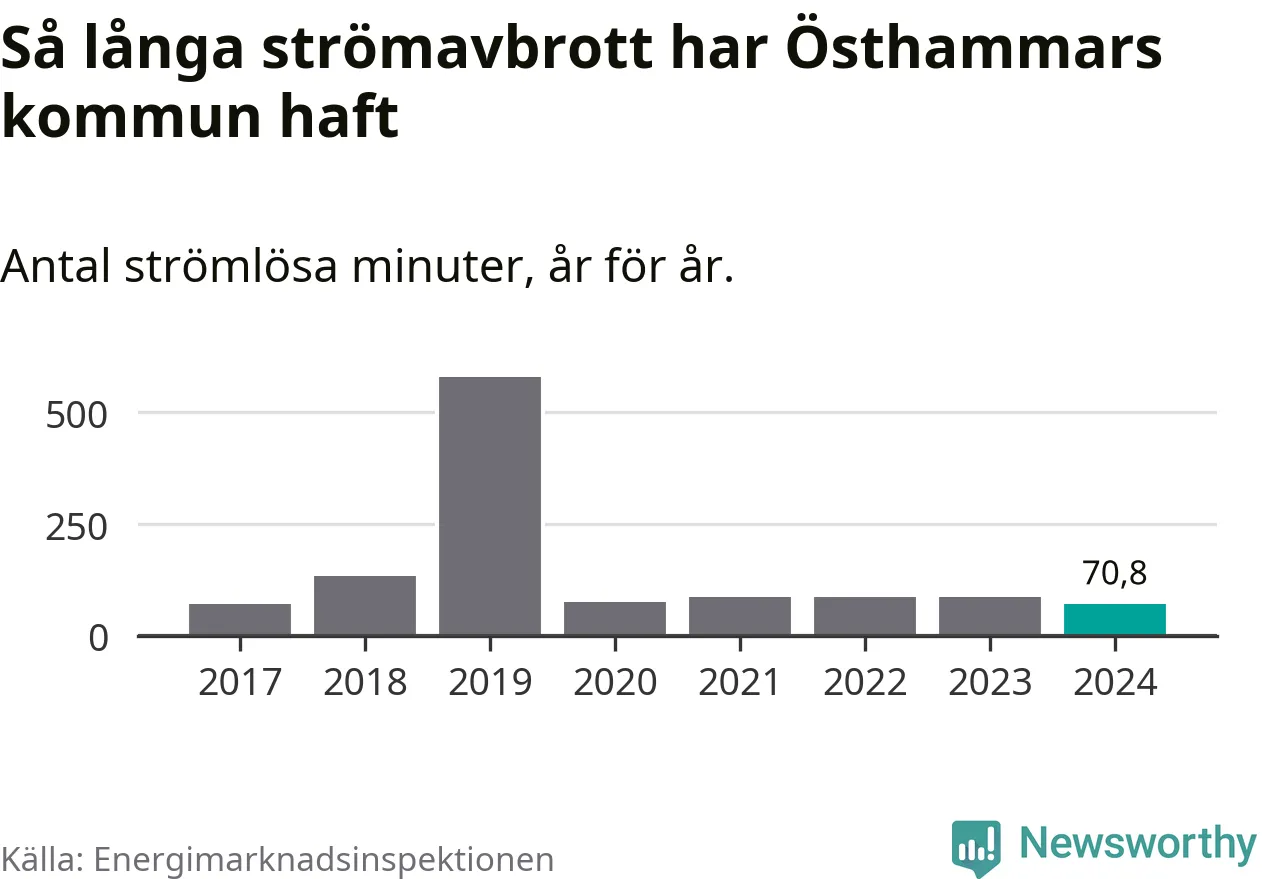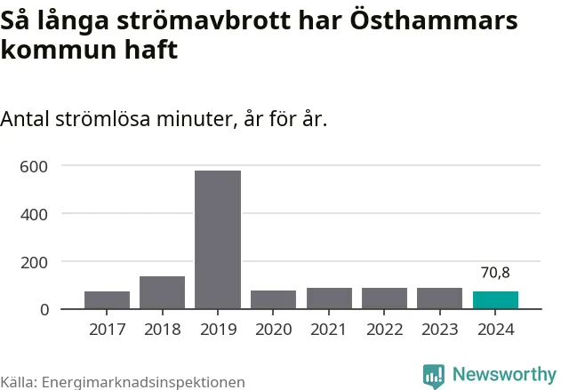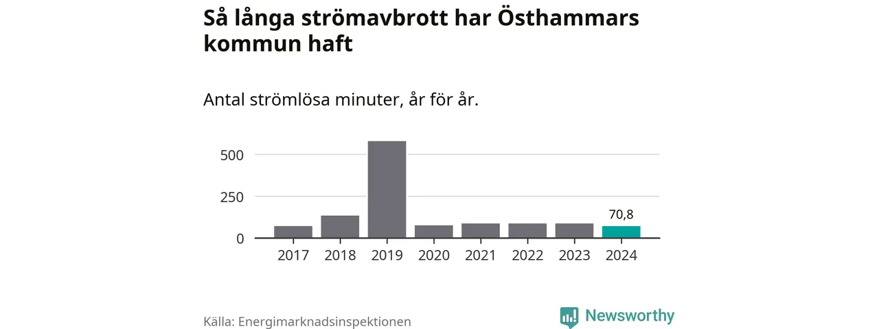 Antalet strömavbrott och total strömlös tid varierar från år till år i Östhammars kommun. Mest tid utan ström (i alla fall under perioden 2017–2024) fick Östhammarborna genomleva under 2019 – nio timmar och 39 minuter. Det är ungefär lika lång tid som det tar att se hela serien "Band of brothers".
