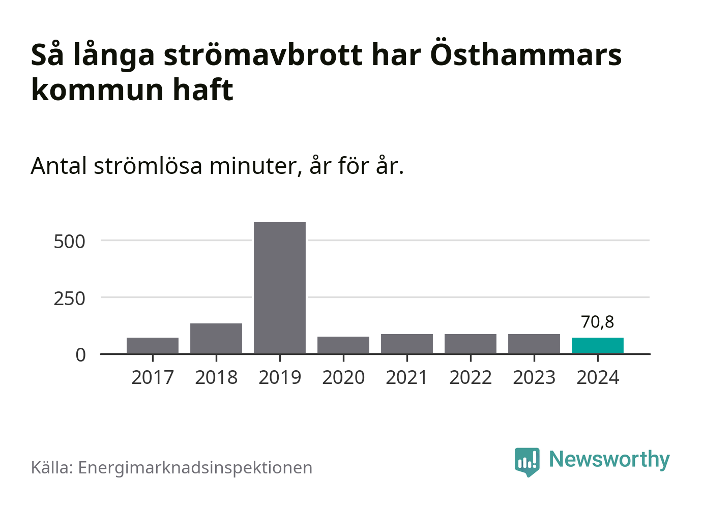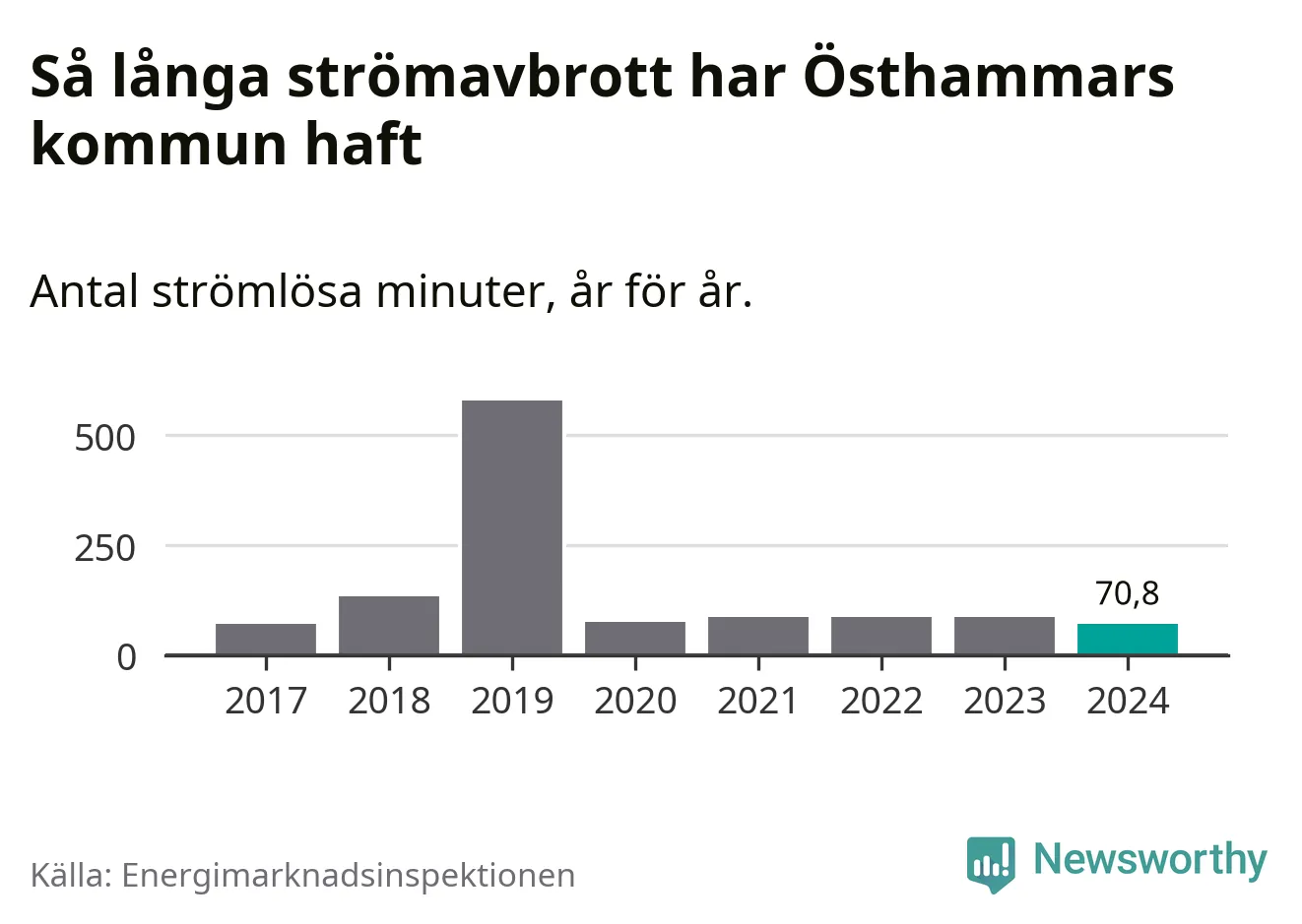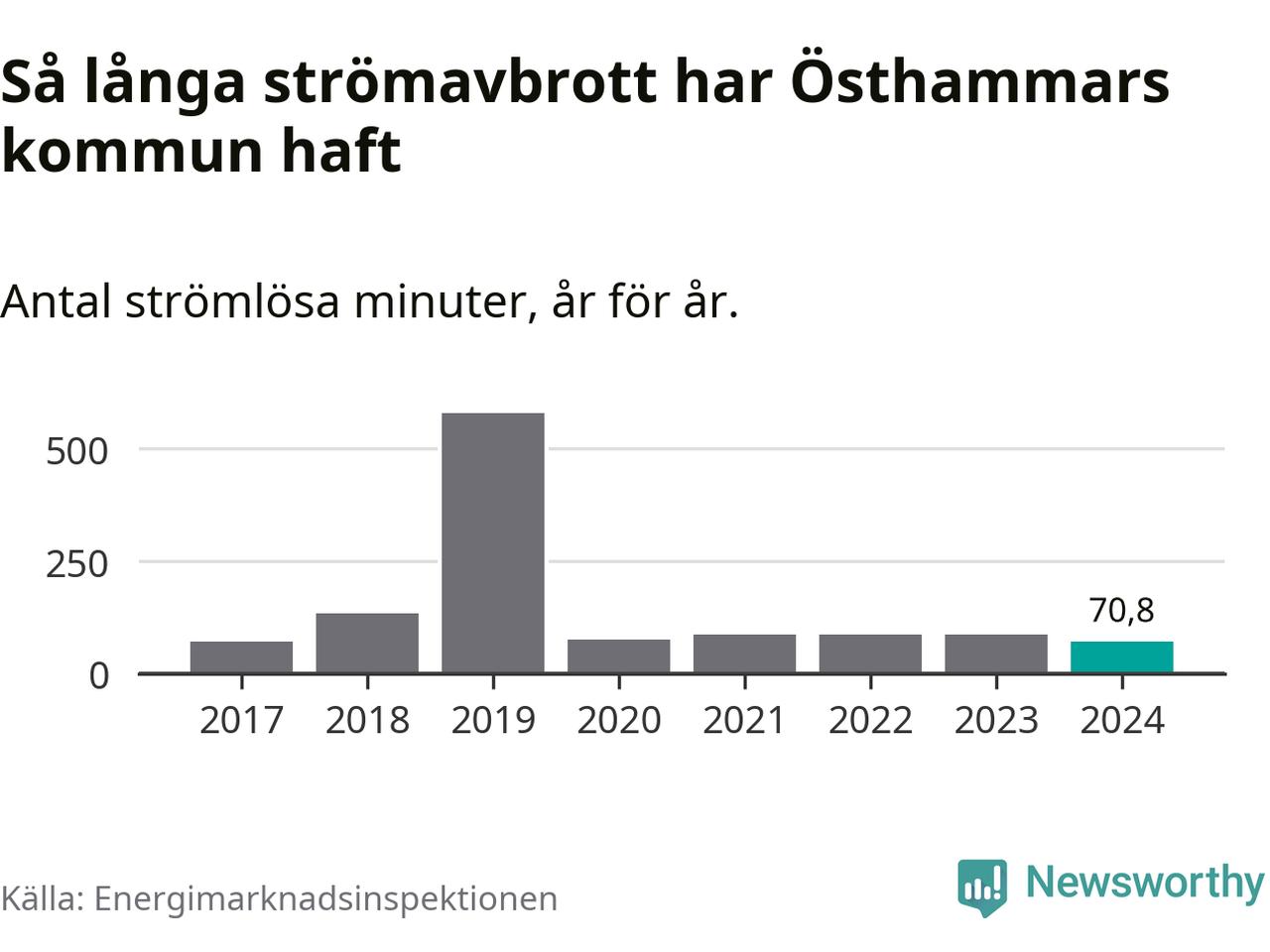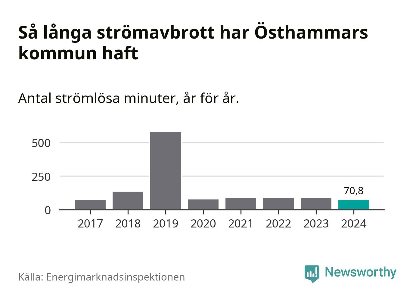 Antalet strömavbrott och total strömlös tid varierar från år till år i Östhammars kommun. Mest tid utan ström (i alla fall under perioden 2017–2024) fick Östhammarborna genomleva under 2019 – nio timmar och 39 minuter. Det är ungefär lika lång tid som det tar att se hela serien "Band of brothers".