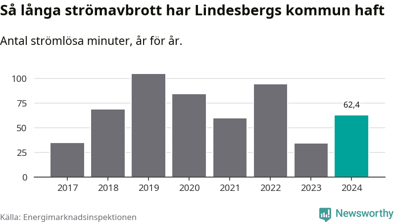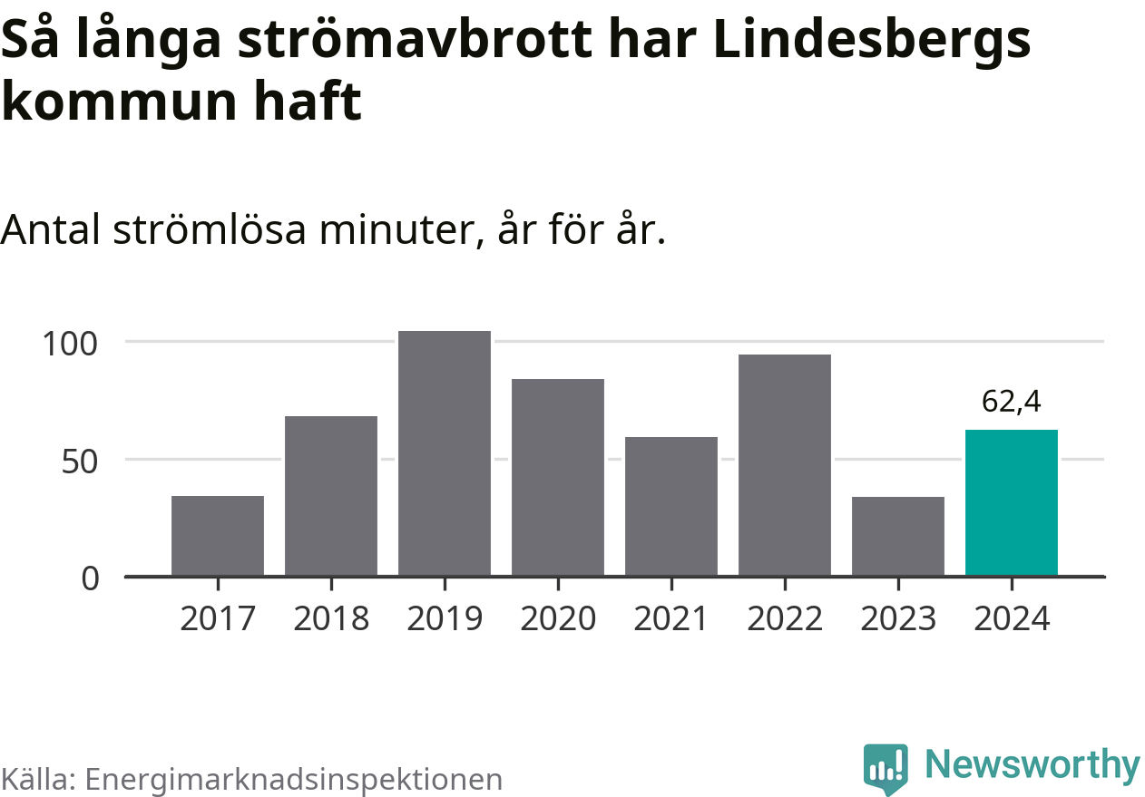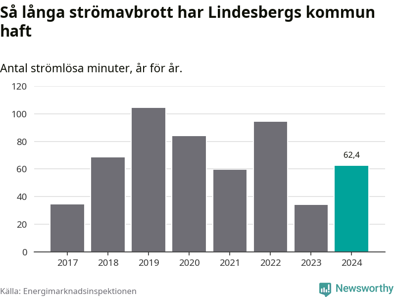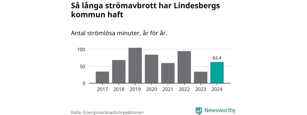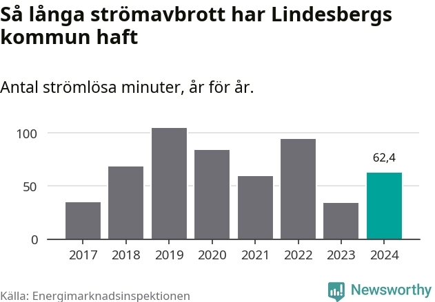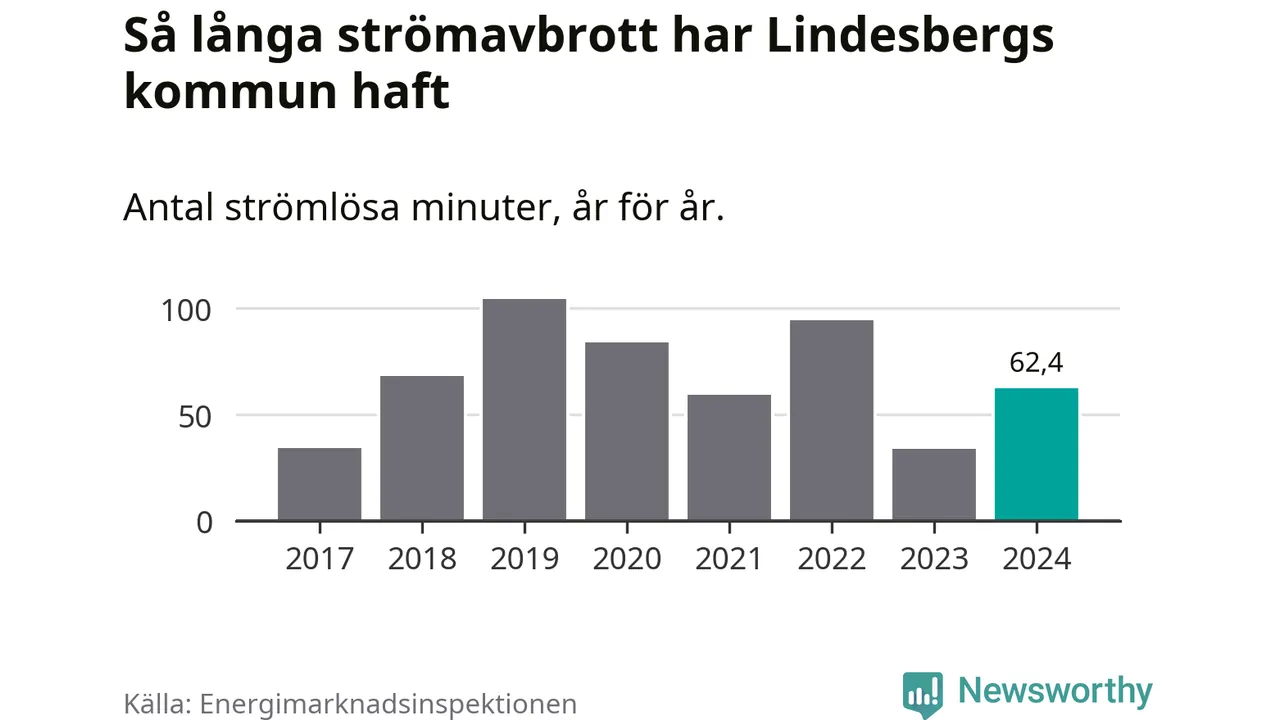 Antalet strömavbrott och total strömlös tid varierar något från år till år i Lindesbergs kommun. Mest tid utan ström (i alla fall under perioden 2017–2024) fick Lindesbergsborna genomleva under 2019 – en timme och 44 minuter. Det är 39 minuter längre än under ett normalår.
