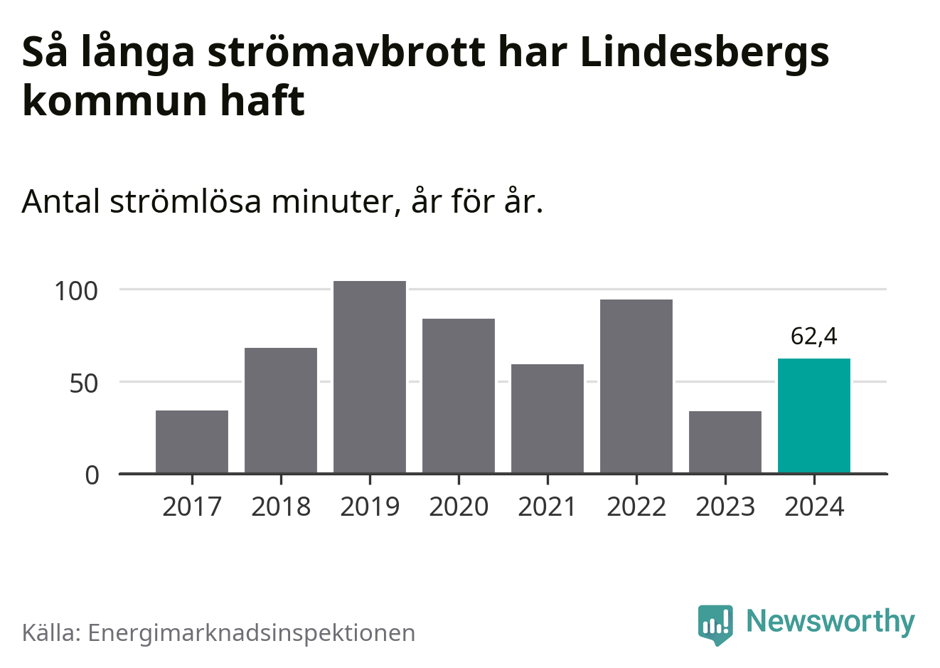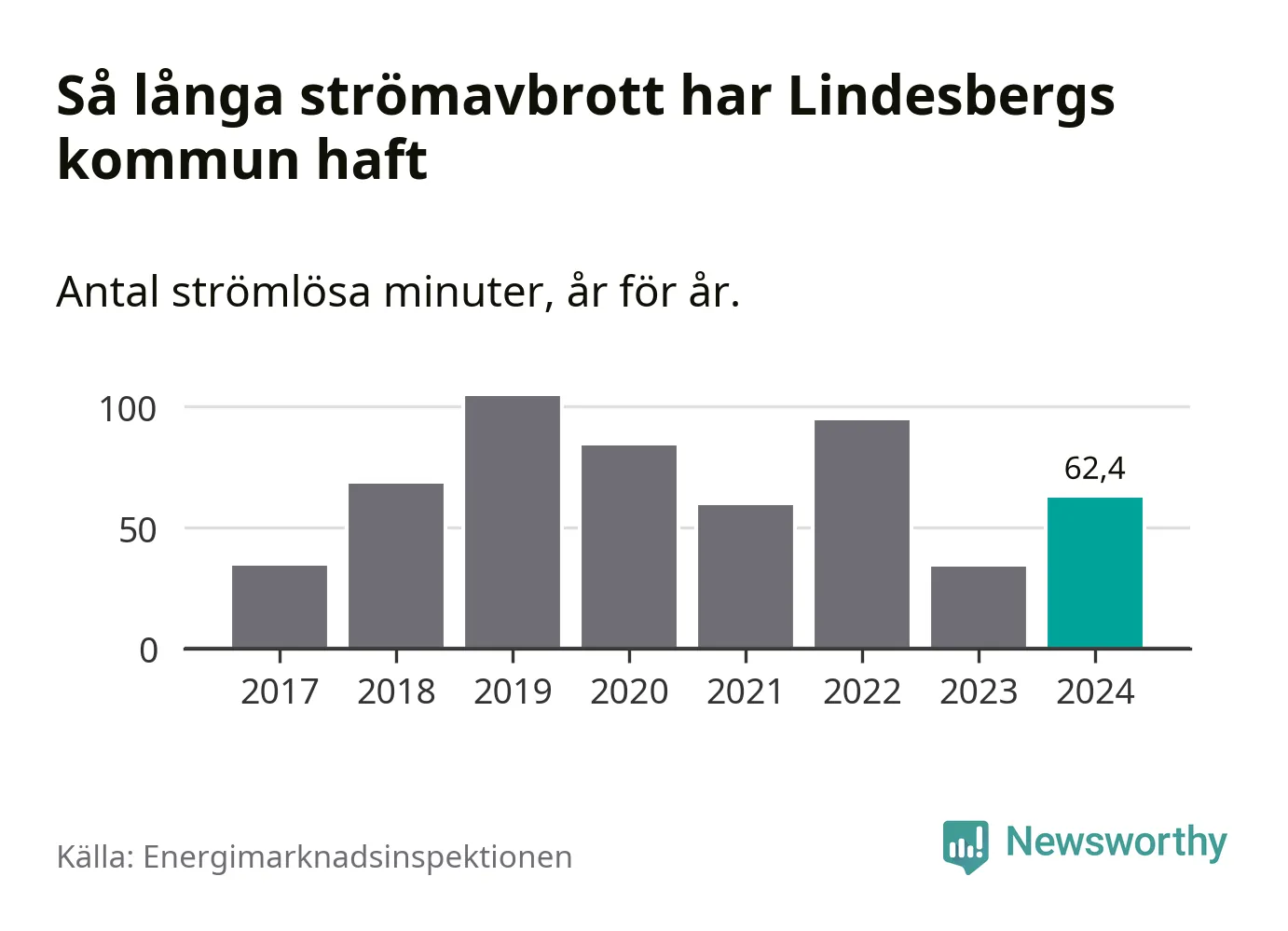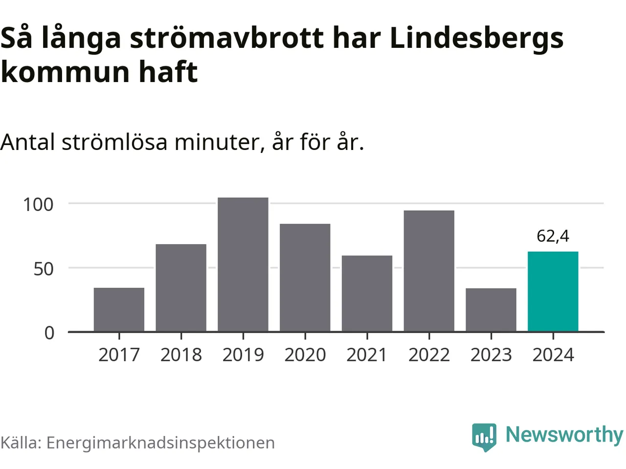 Antalet strömavbrott och total strömlös tid varierar något från år till år i Lindesbergs kommun. Mest tid utan ström (i alla fall under perioden 2017–2024) fick Lindesbergsborna genomleva under 2019 – en timme och 44 minuter. Det är 39 minuter längre än under ett normalår.