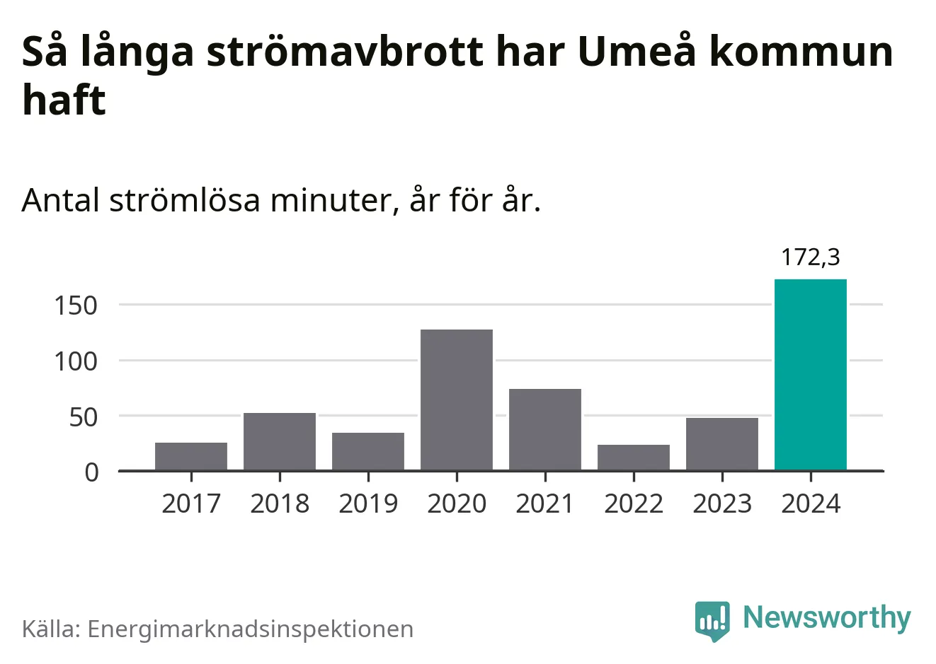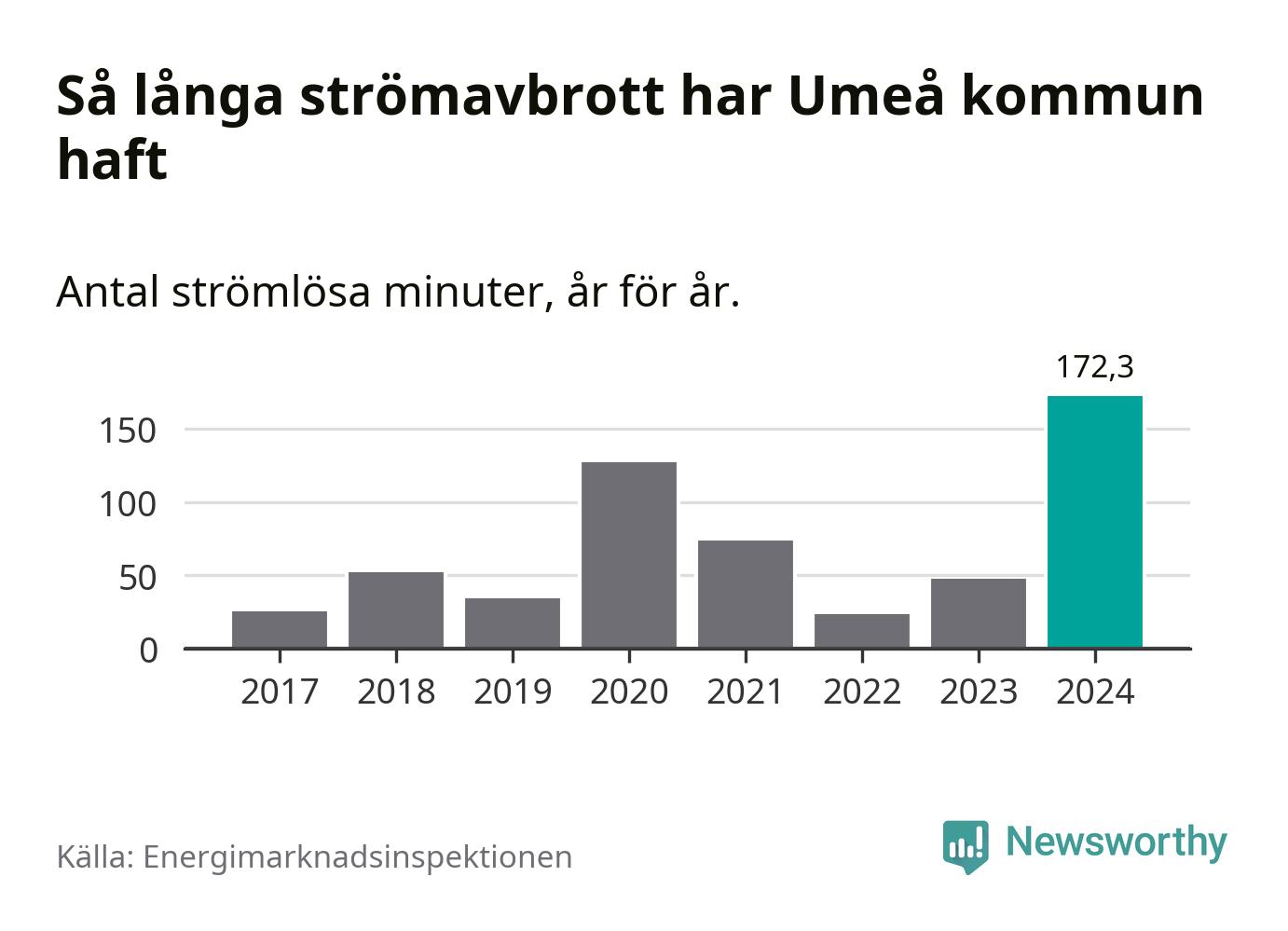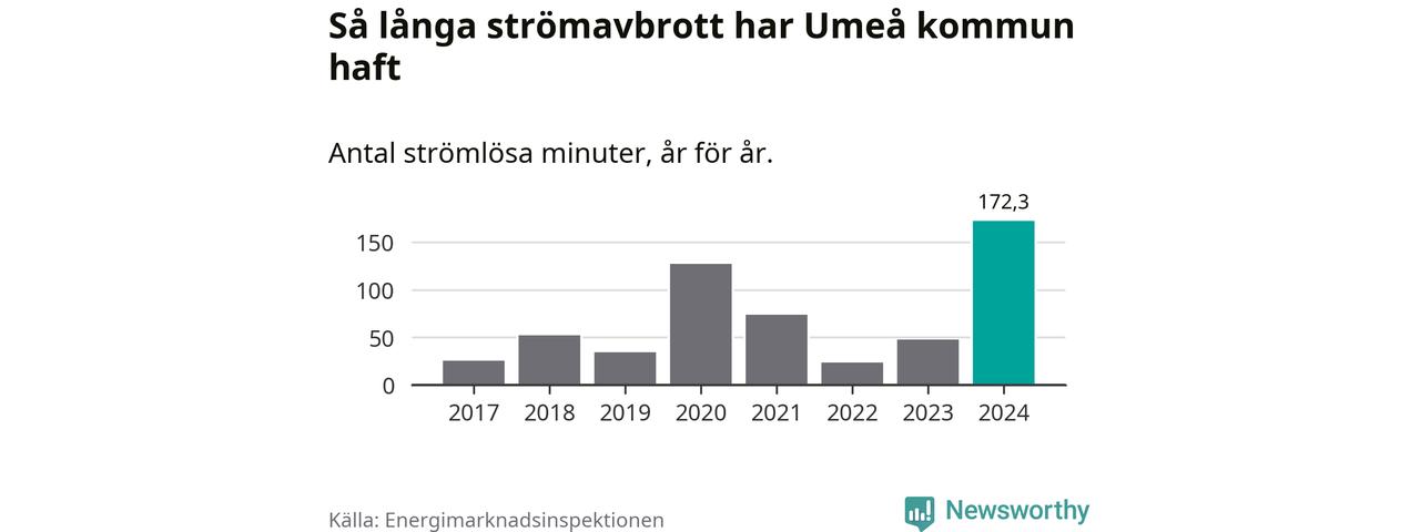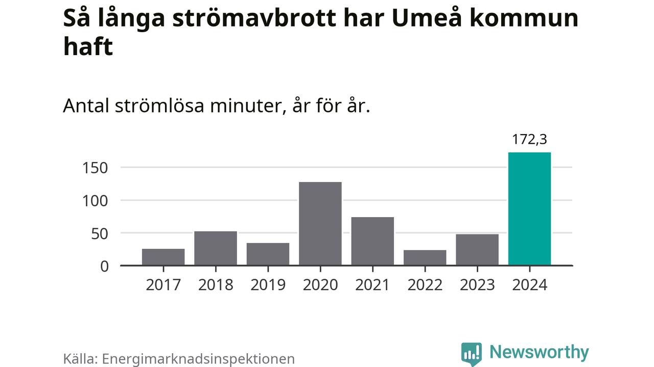 Antalet strömavbrott och total strömlös tid varierar från år till år i Umeå kommun. Mest tid utan ström (i alla fall under perioden 2017–2024) fick Umeåborna genomleva under 2024 – två timmar och 52 minuter. Det är två timmar och två minuter längre än under ett normalår.
