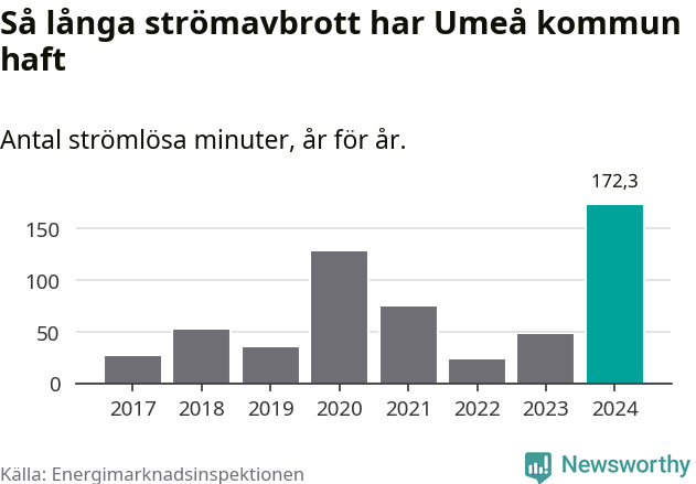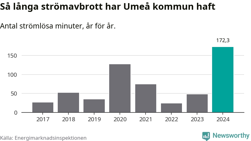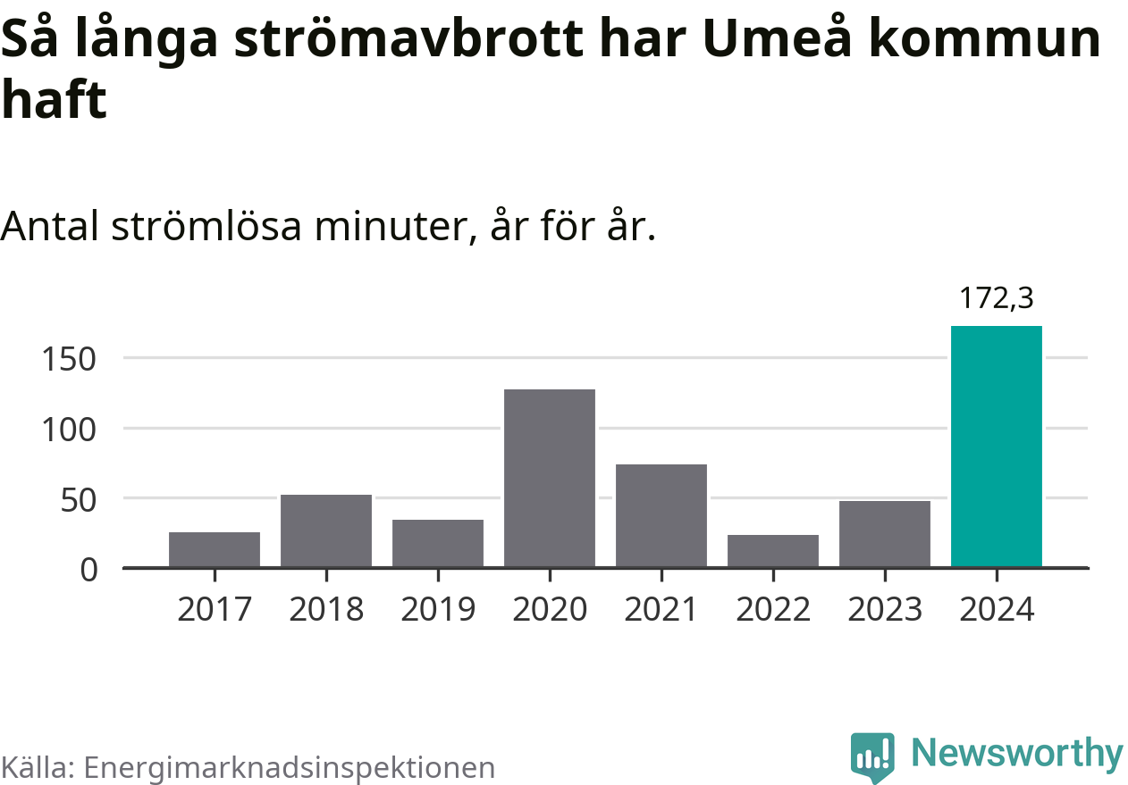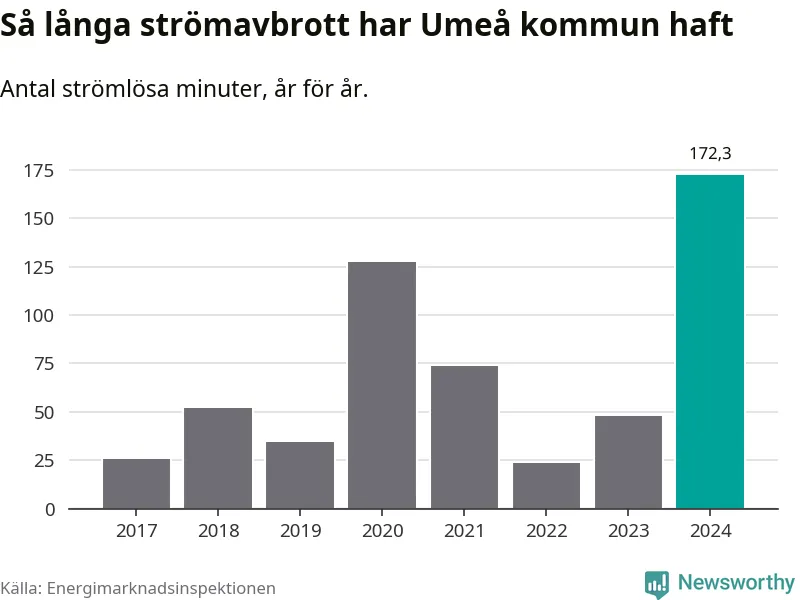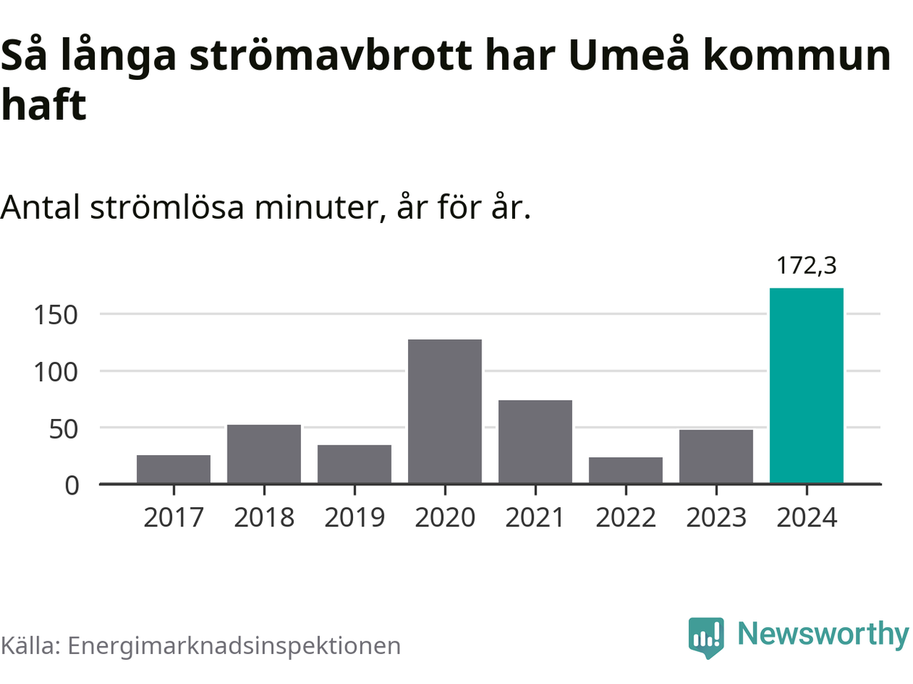 Antalet strömavbrott och total strömlös tid varierar från år till år i Umeå kommun. Mest tid utan ström (i alla fall under perioden 2017–2024) fick Umeåborna genomleva under 2024 – två timmar och 52 minuter. Det är två timmar och två minuter längre än under ett normalår.