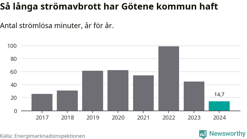 Antalet strömavbrott och total strömlös tid varierar något från år till år i Götene kommun. Mest tid utan ström (i alla fall under perioden 2017–2024) fick Göteneborna genomleva under 2022 – en timme och 39 minuter. Det är 49 minuter längre än under ett normalår.