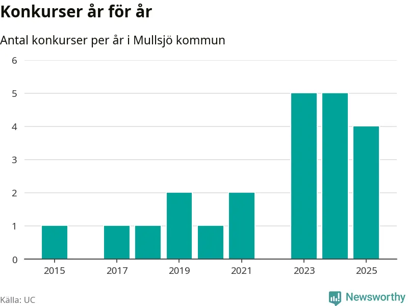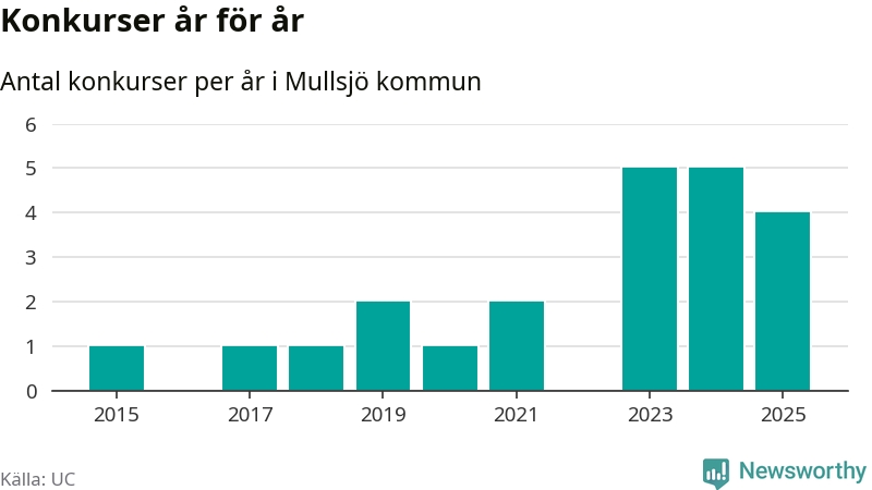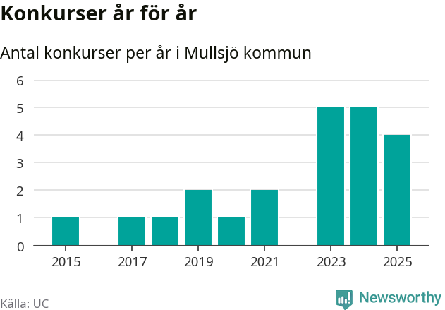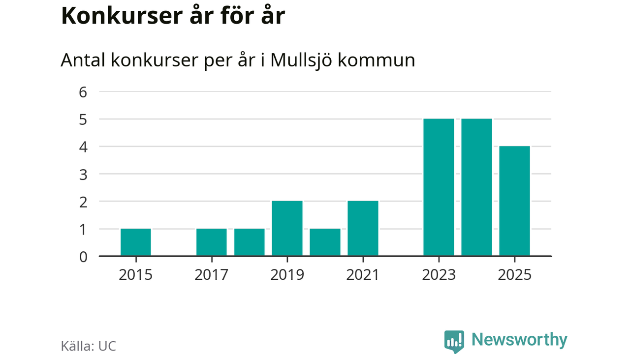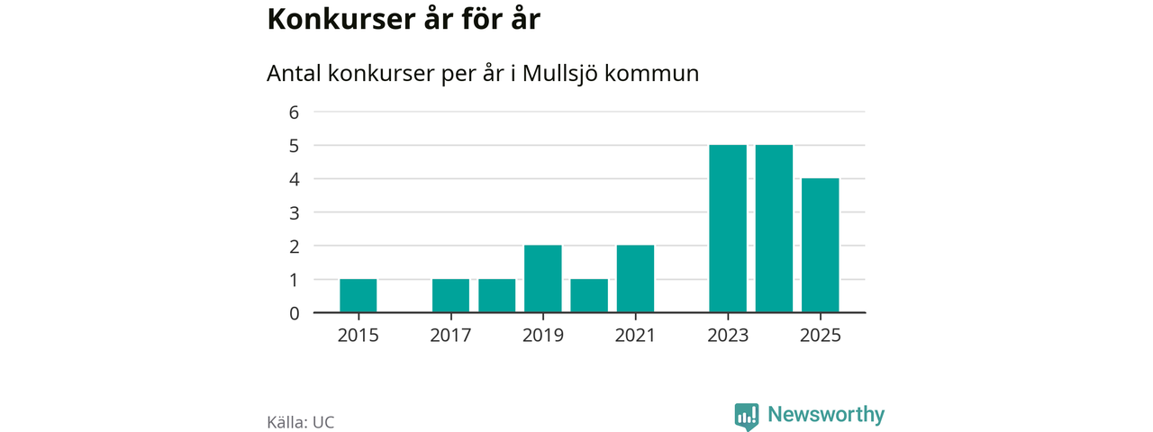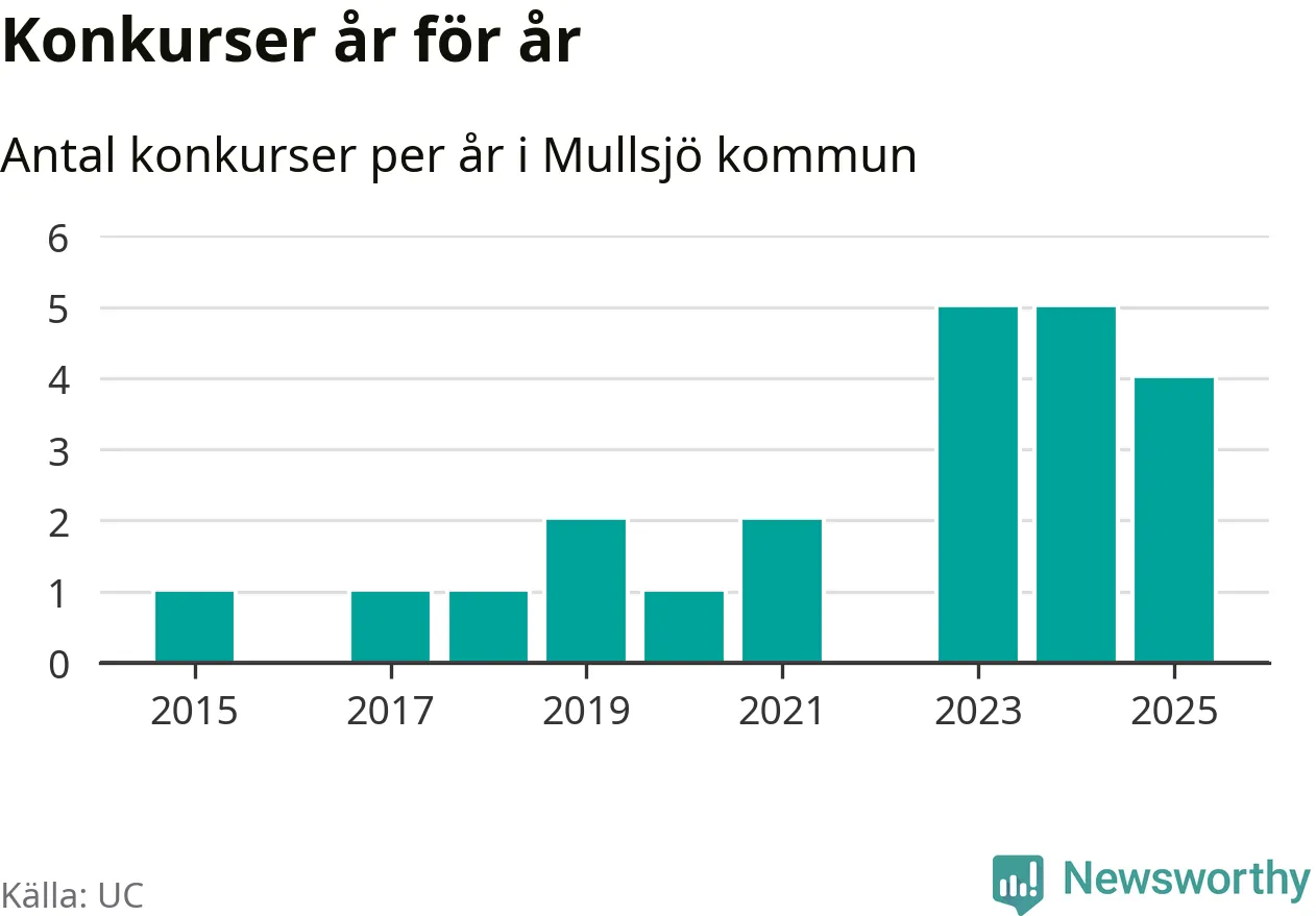 Under år 2025 gick sammanlagt fyra bolag med säte i Mullsjö kommun i konkurs. Det är ett färre än året innan. Toppåren, sedan 2015, var just 2023 och 2024 sett till antalet konkursföretag. Det visar ny statistik från UC.