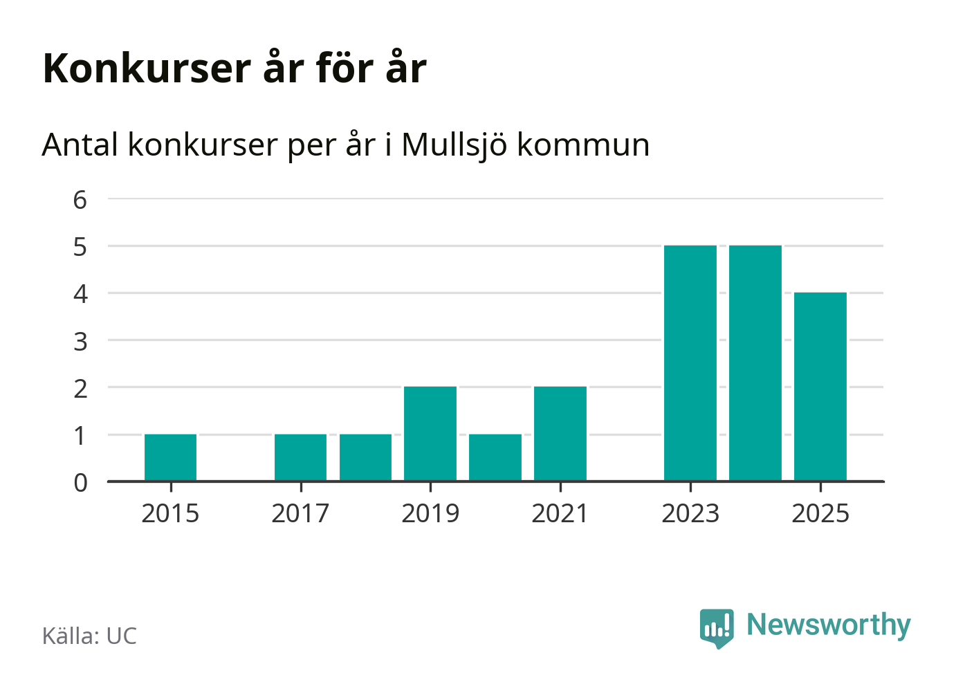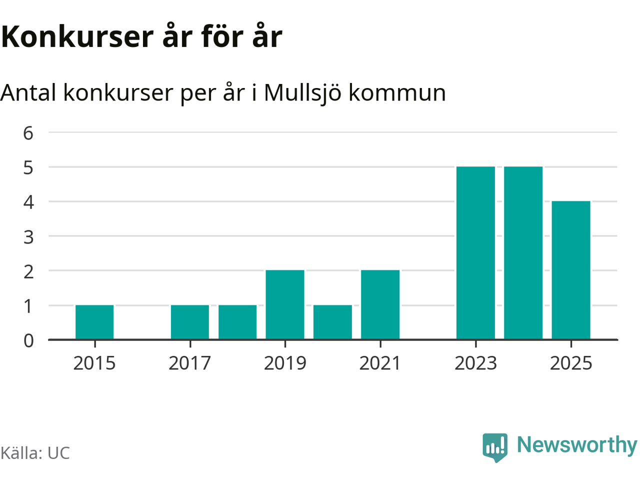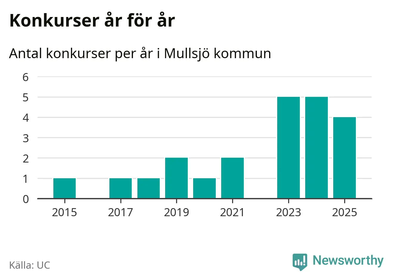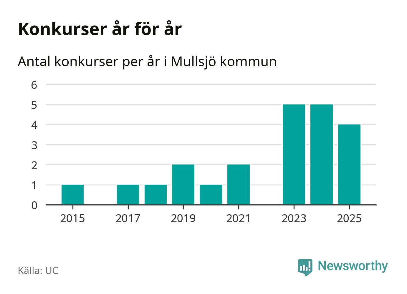 Under år 2025 gick sammanlagt fyra bolag med säte i Mullsjö kommun i konkurs. Det är ett färre än året innan. Toppåren, sedan 2015, var just 2023 och 2024 sett till antalet konkursföretag. Det visar ny statistik från UC.