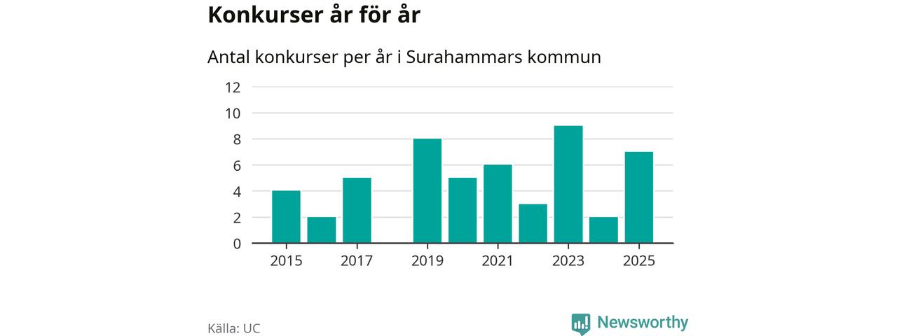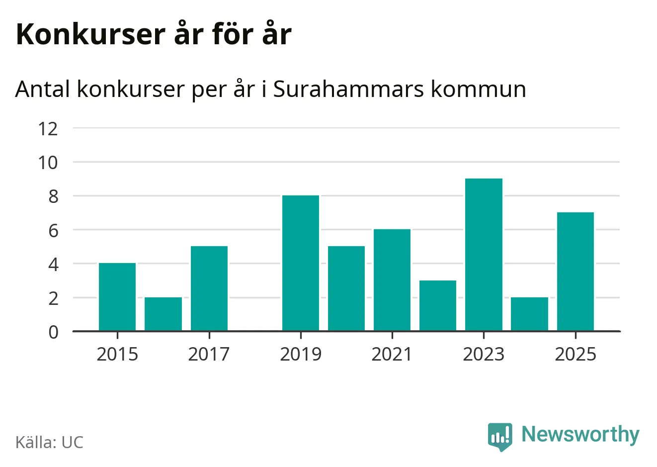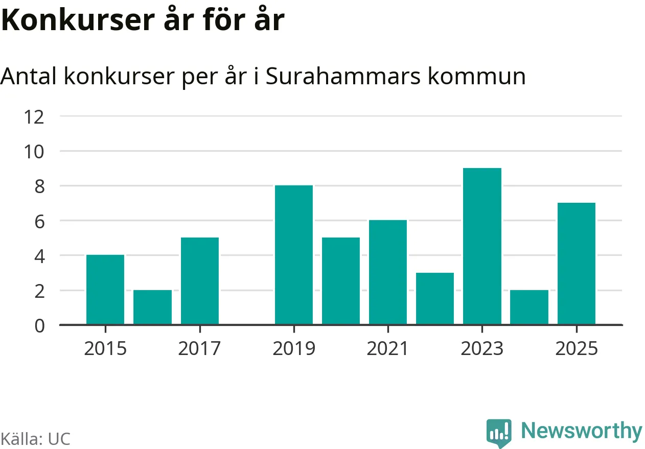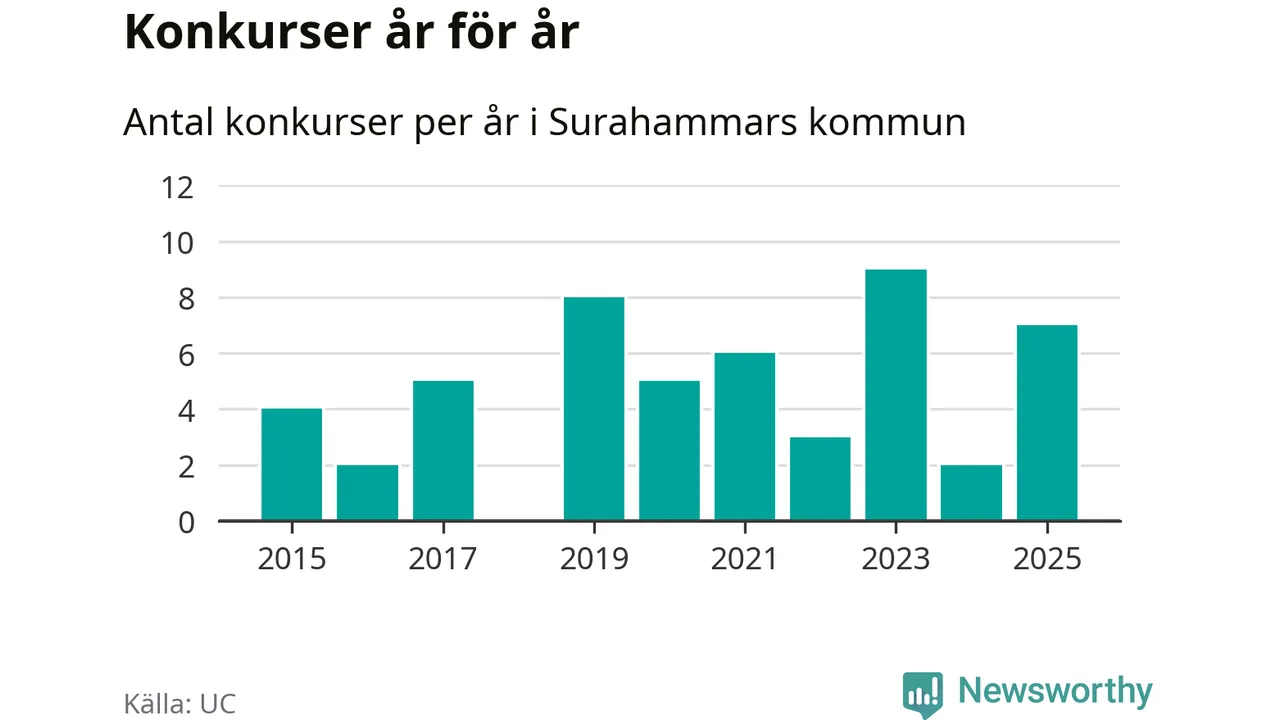 Under år 2025 gick sammanlagt sju bolag med säte i Surahammars kommun i konkurs. Det är fler än året innan, men samtidigt färre än toppåret 2023 då nio bolag gick i konkurs. Det visar ny statistik från UC.
