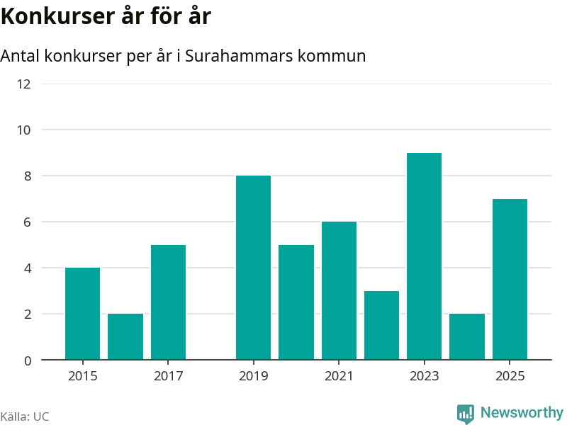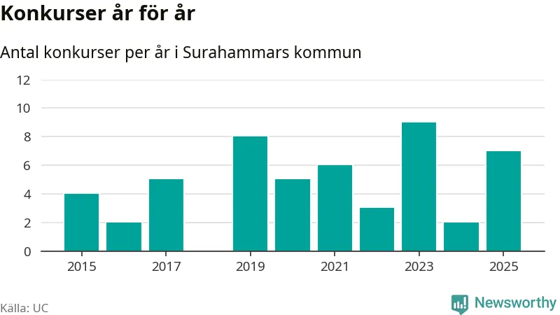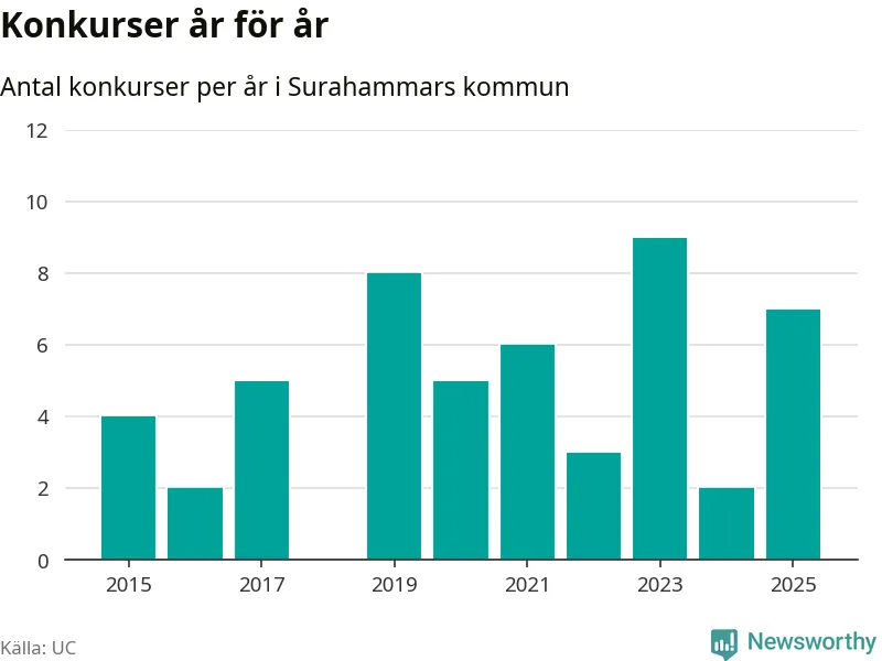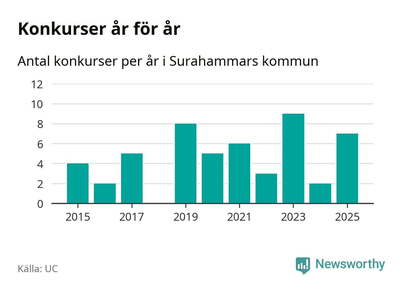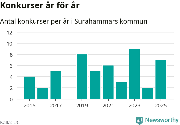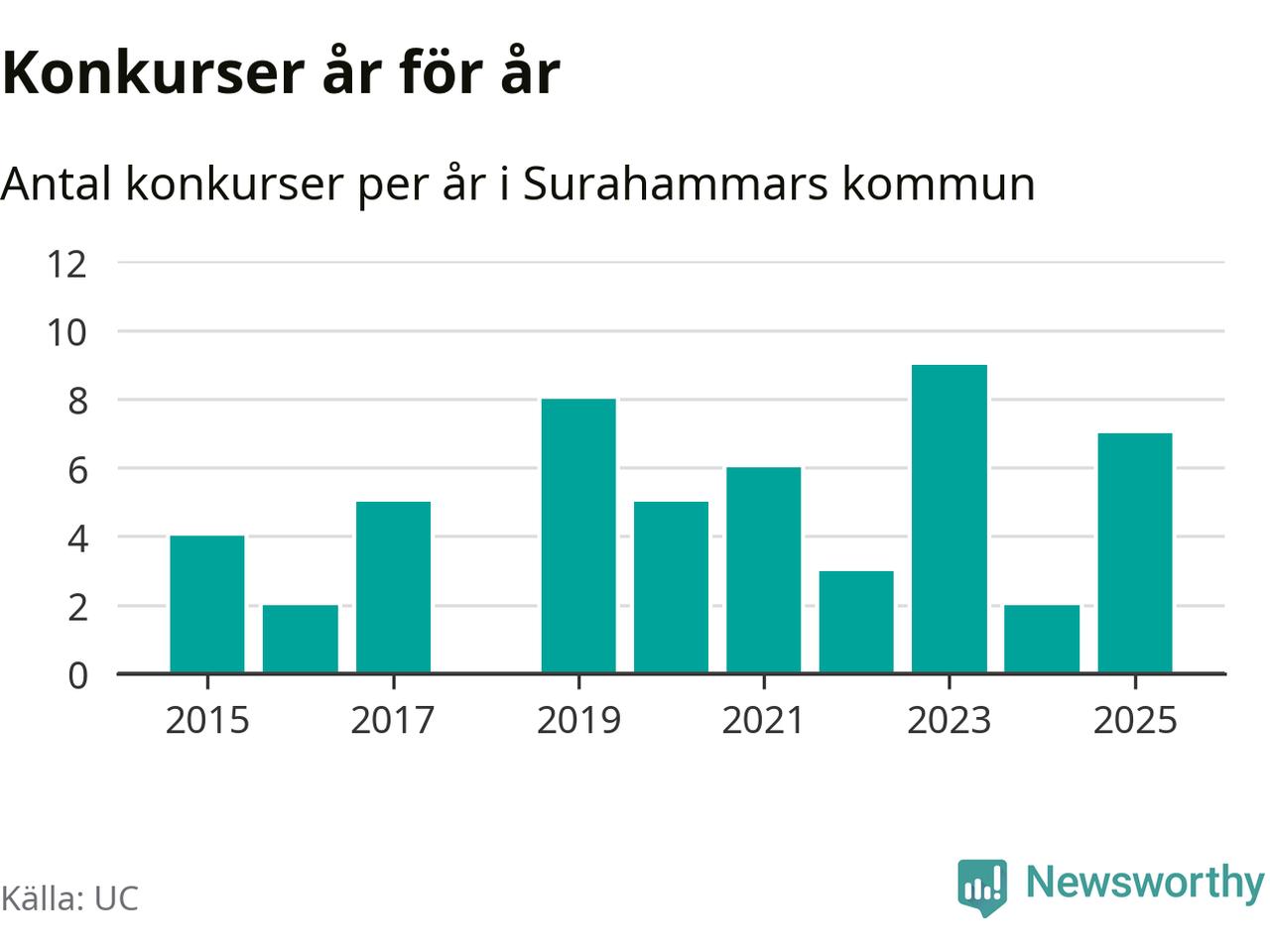 Under år 2025 gick sammanlagt sju bolag med säte i Surahammars kommun i konkurs. Det är fler än året innan, men samtidigt färre än toppåret 2023 då nio bolag gick i konkurs. Det visar ny statistik från UC.