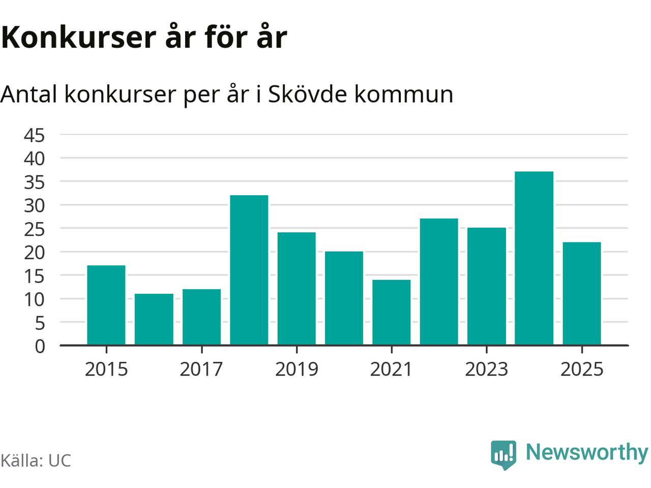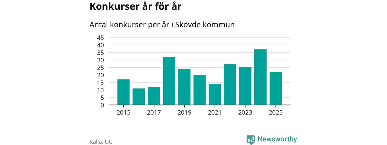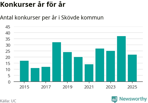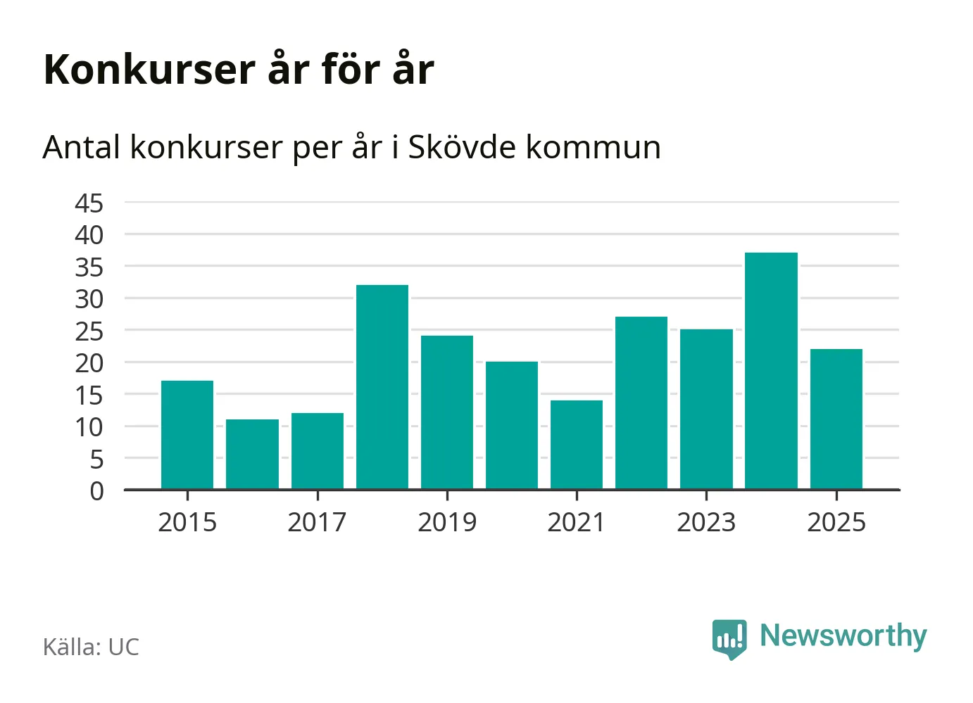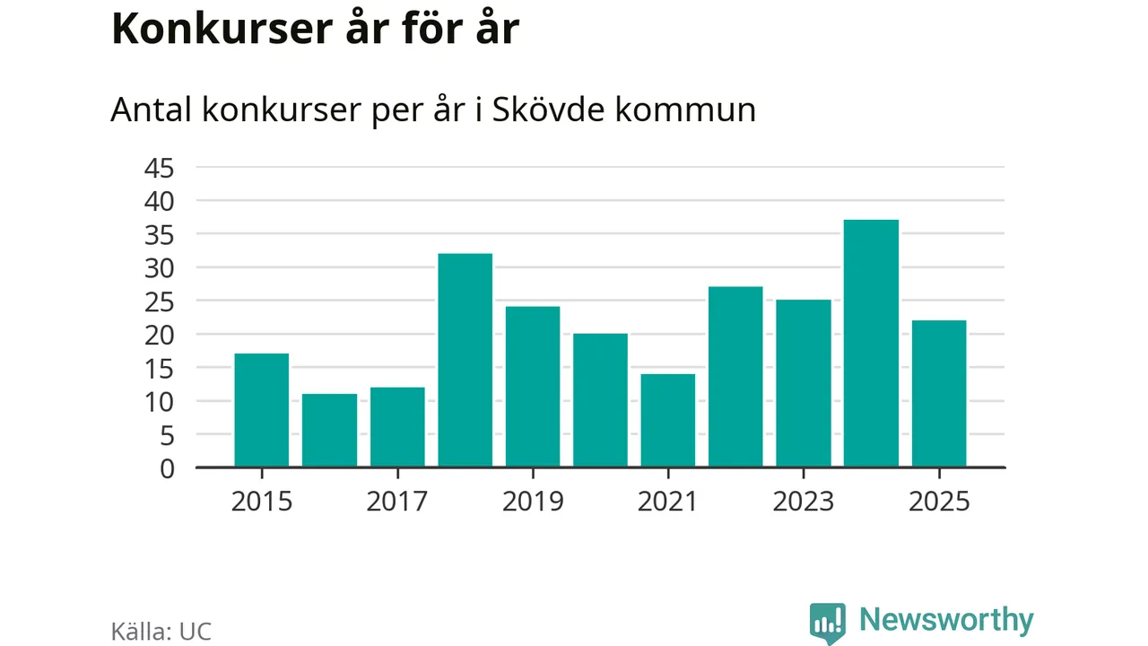 Under år 2025 gick sammanlagt 22 bolag med säte i Skövde kommun i konkurs. Det är 15 färre än året innan då 37 bolag gick i konkurs. Toppåret, sedan 2015, var just 2024 sett till antalet konkursföretag. Det visar ny statistik från UC.