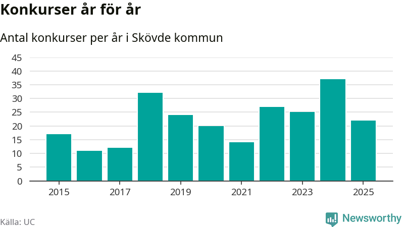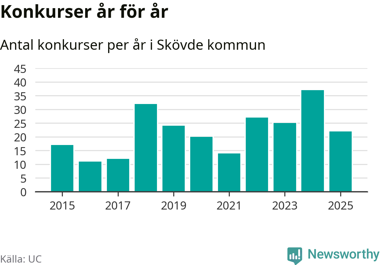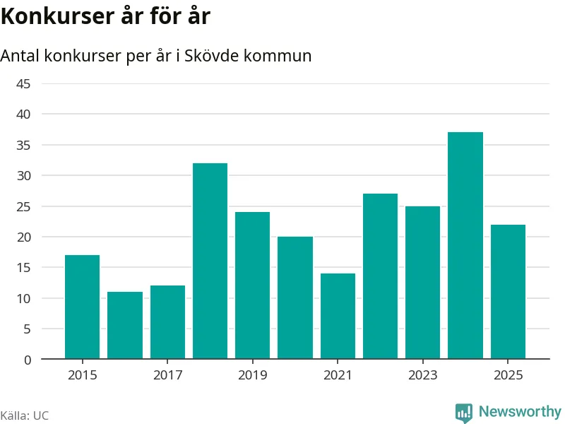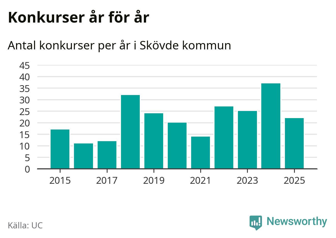 Under år 2025 gick sammanlagt 22 bolag med säte i Skövde kommun i konkurs. Det är 15 färre än året innan då 37 bolag gick i konkurs. Toppåret, sedan 2015, var just 2024 sett till antalet konkursföretag. Det visar ny statistik från UC.
