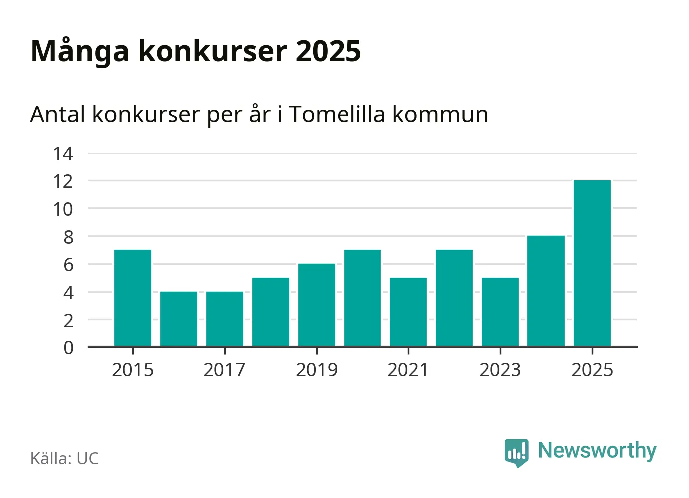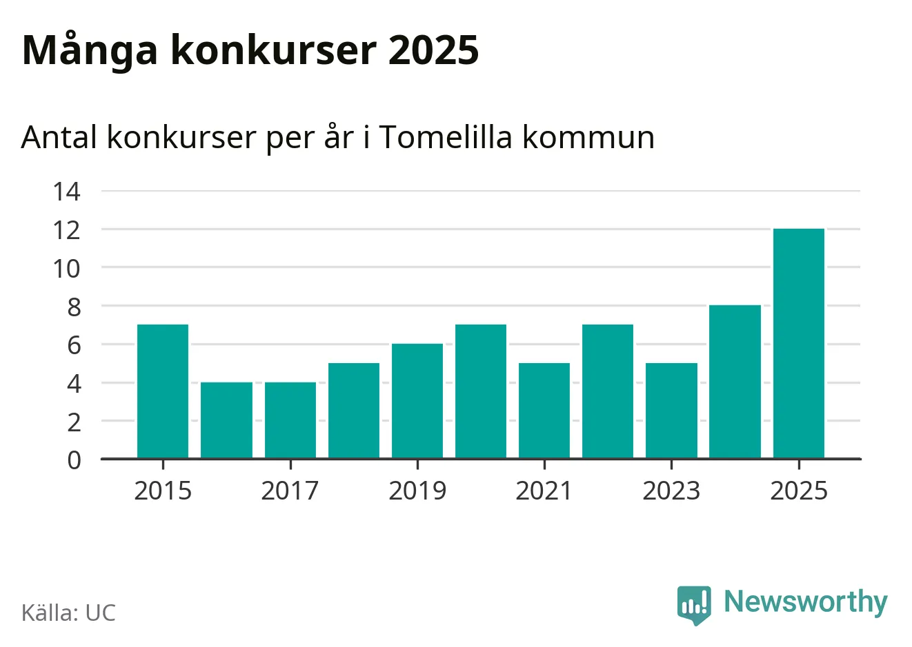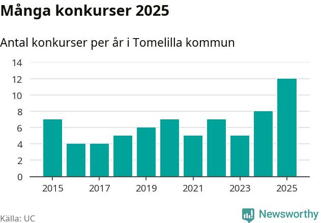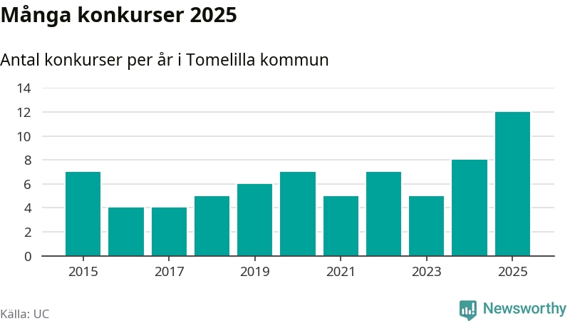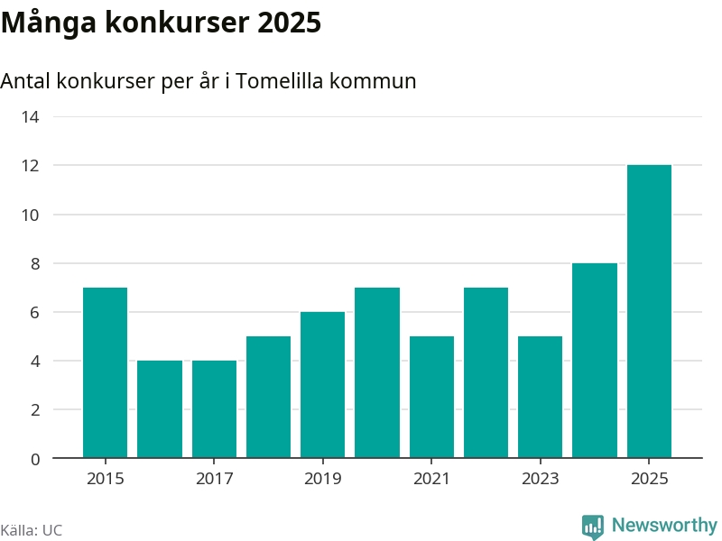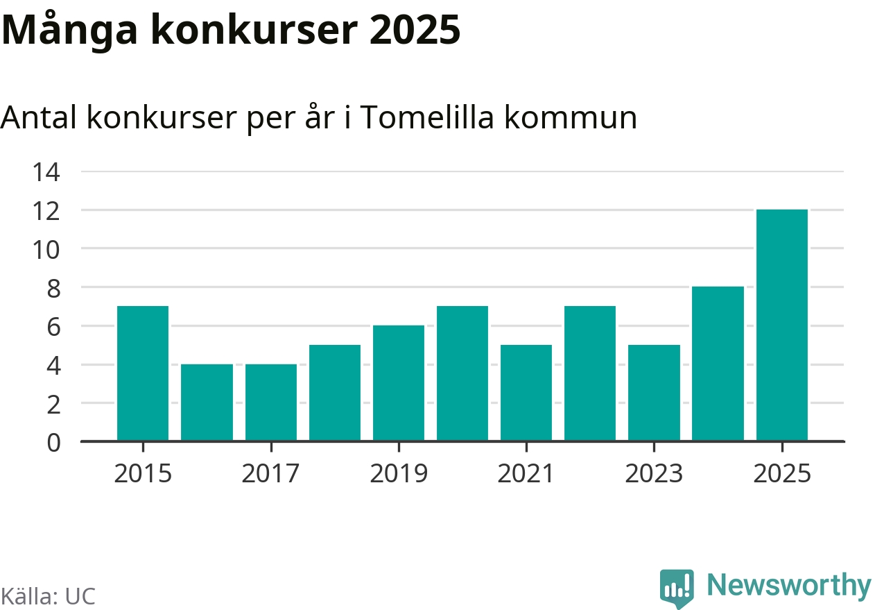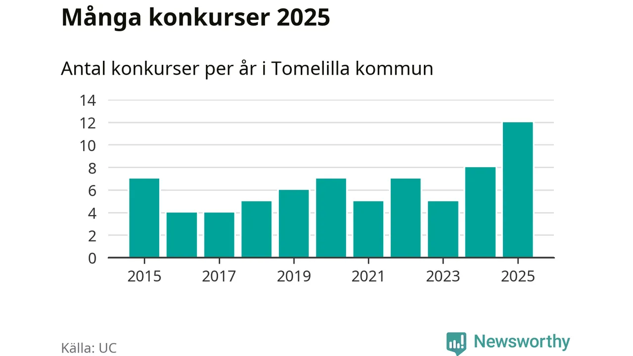 Under år 2025 gick sammanlagt tolv bolag med säte i Tomelilla kommun i konkurs. Det är det högsta antalet sedan åtminstone år 2015. Det visar ny statistik från UC.