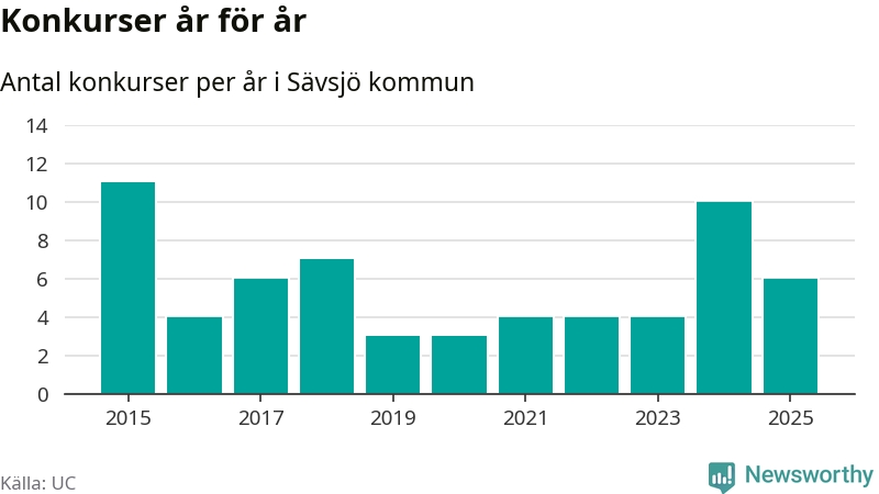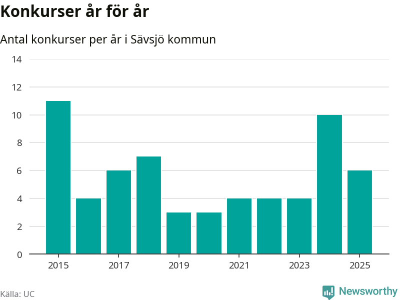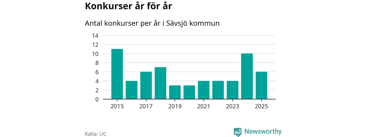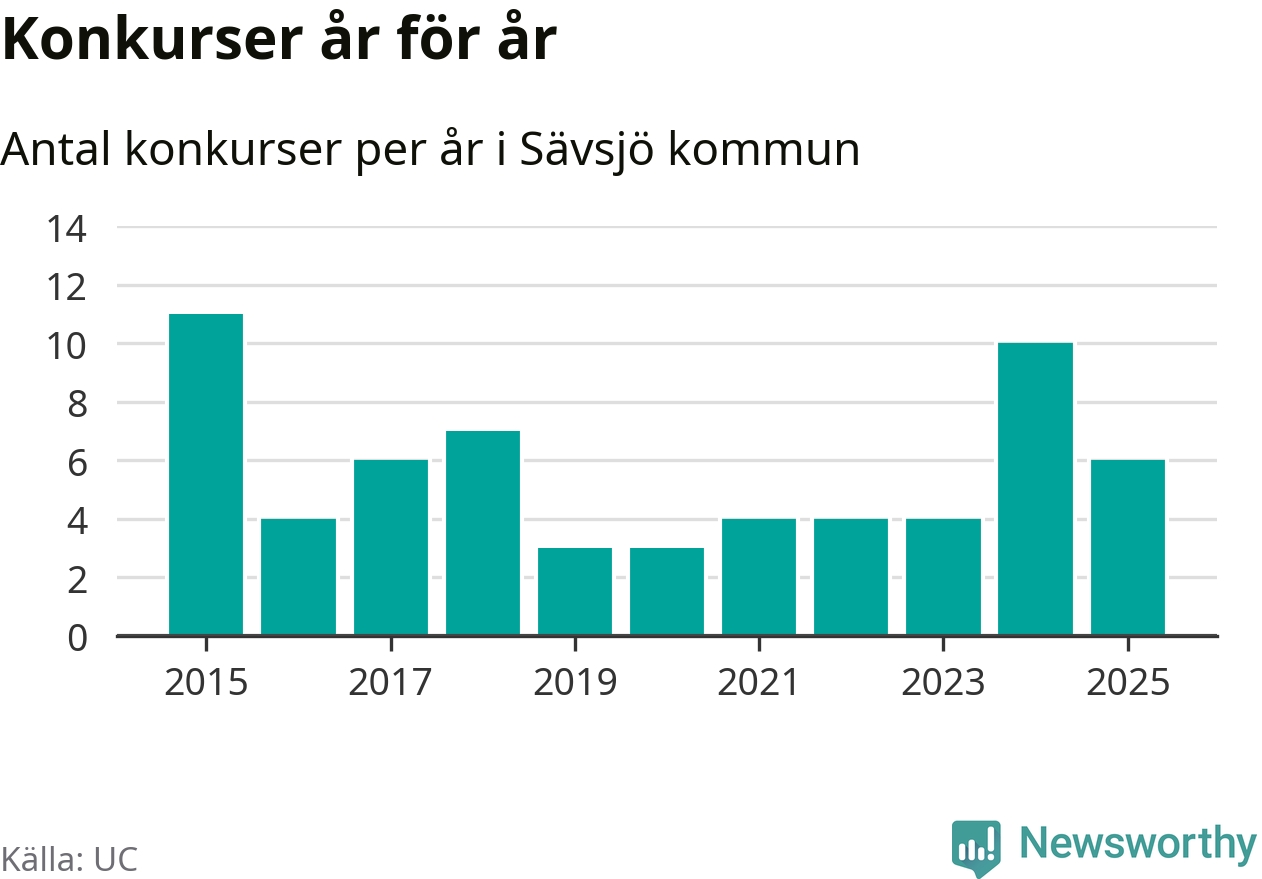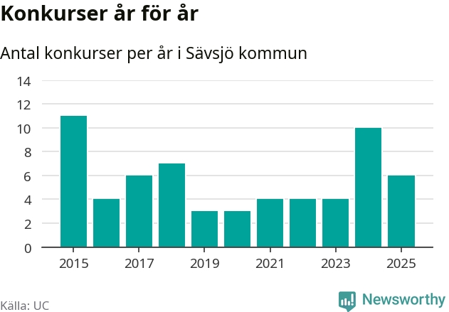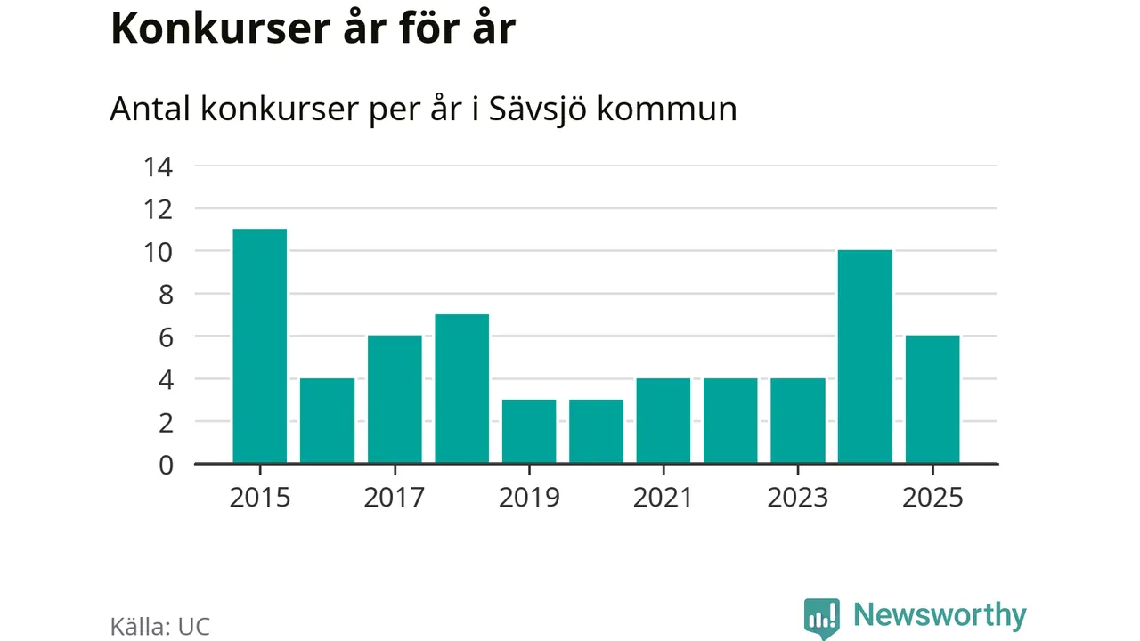 Under år 2025 gick sammanlagt sex bolag med säte i Sävsjö kommun i konkurs. Det är fyra färre än året innan då tio bolag gick i konkurs. Toppåret, sedan 2015, var 2015 då elva bolag gick i konkurs. Det visar ny statistik från UC.