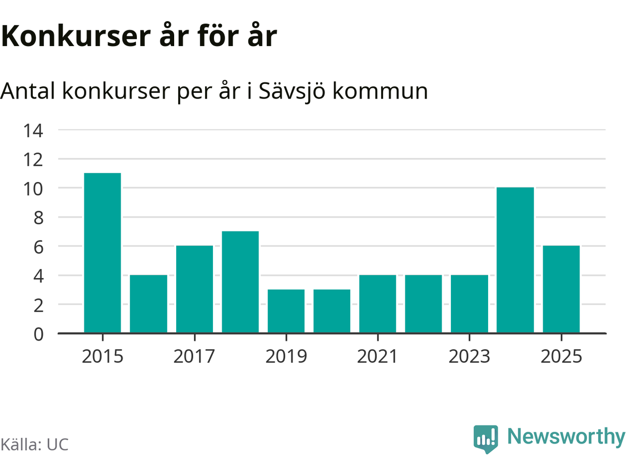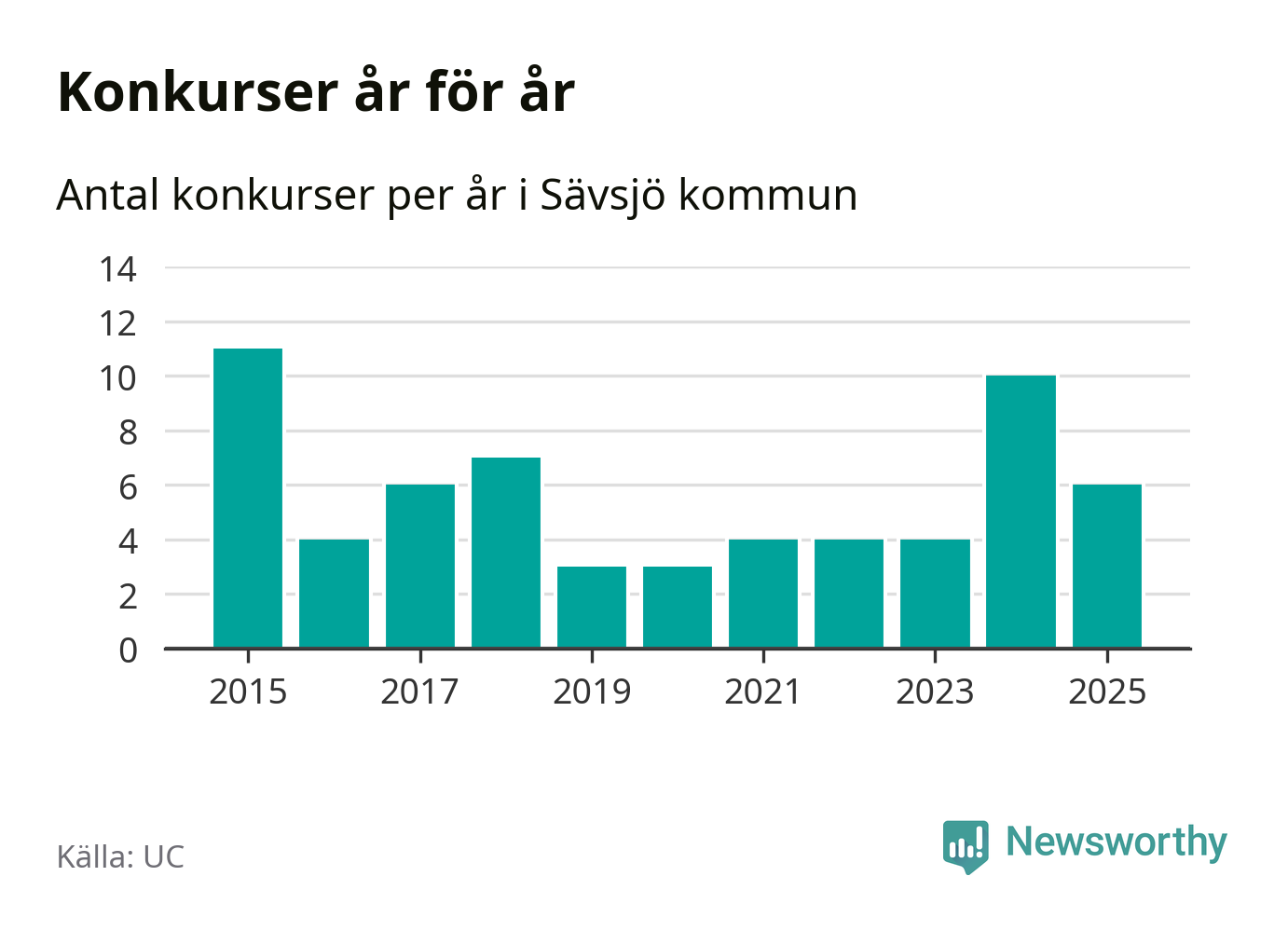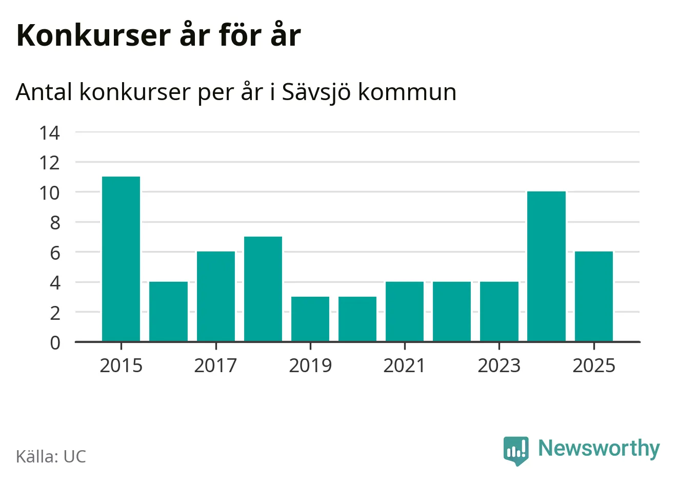 Under år 2025 gick sammanlagt sex bolag med säte i Sävsjö kommun i konkurs. Det är fyra färre än året innan då tio bolag gick i konkurs. Toppåret, sedan 2015, var 2015 då elva bolag gick i konkurs. Det visar ny statistik från UC.