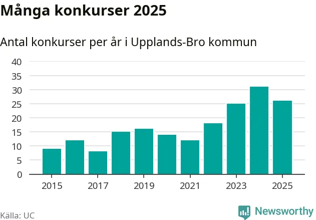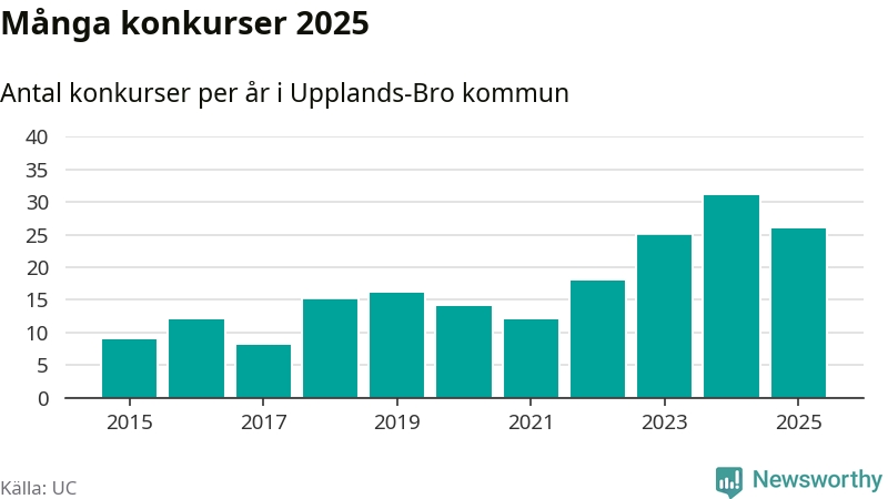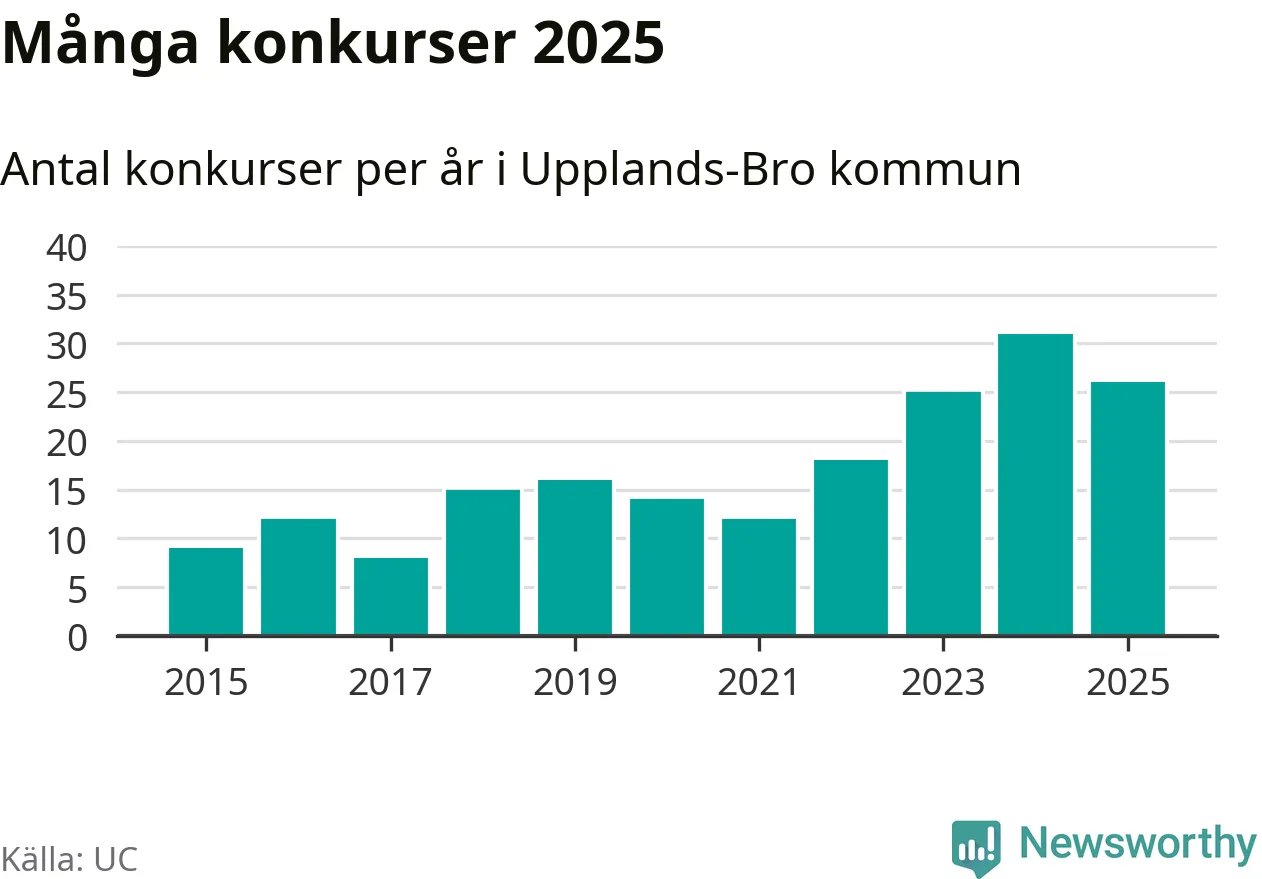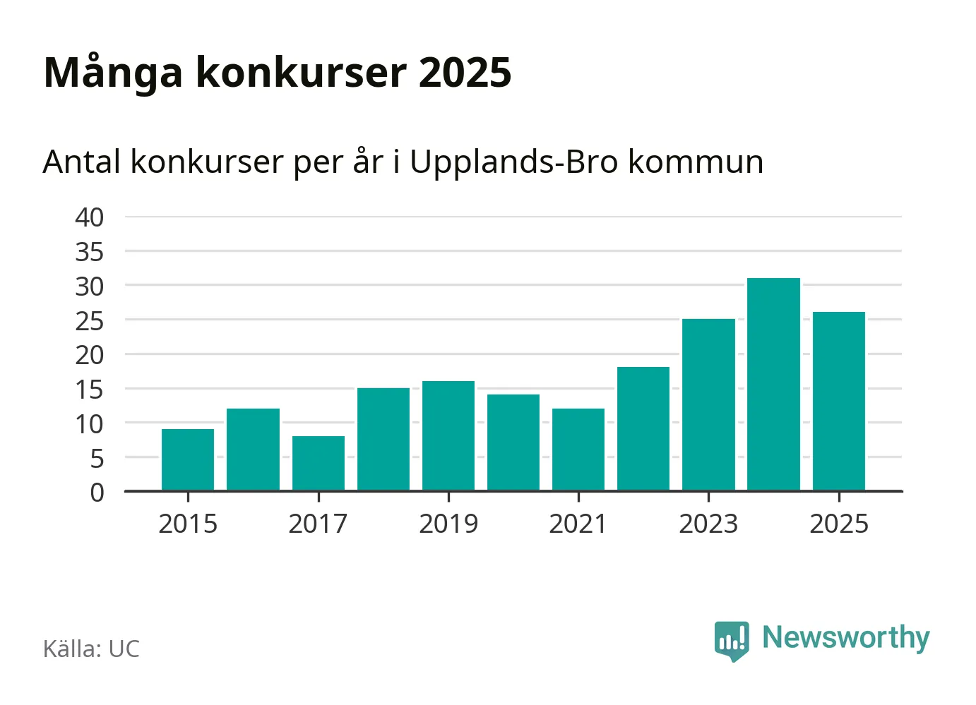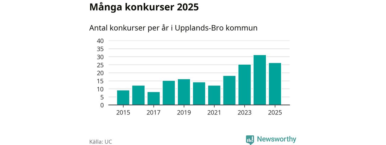Under år 2025 gick sammanlagt 26 bolag med säte i Upplands-Bro kommun i konkurs. Det är fem färre än året innan då 31 bolag gick i konkurs. Toppåret, sedan 2015, var just 2024 sett till antalet konkursföretag. Det visar ny statistik från UC.