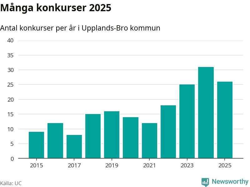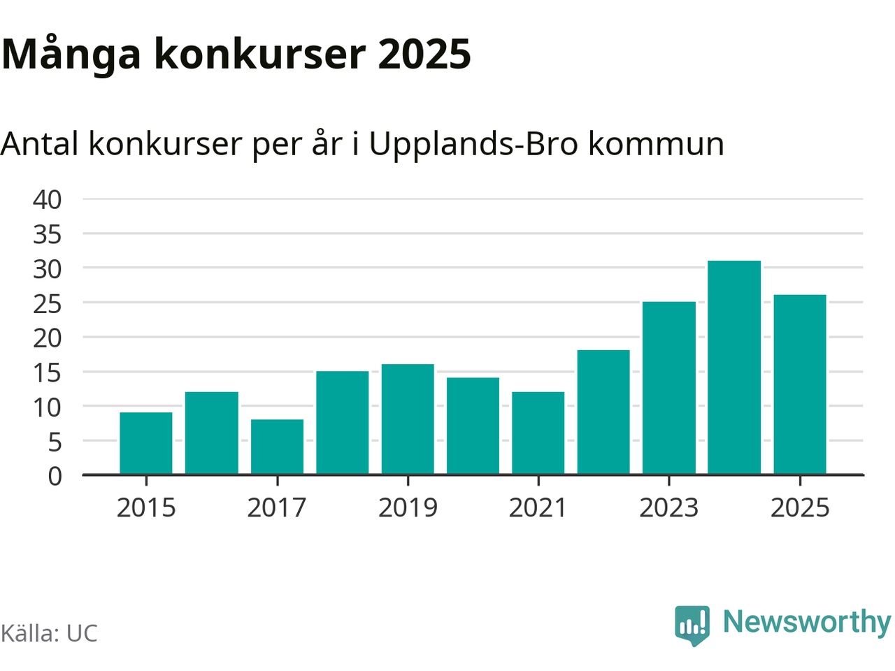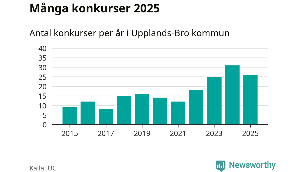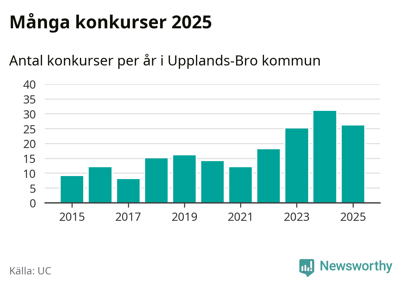 Under år 2025 gick sammanlagt 26 bolag med säte i Upplands-Bro kommun i konkurs. Det är fem färre än året innan då 31 bolag gick i konkurs. Toppåret, sedan 2015, var just 2024 sett till antalet konkursföretag. Det visar ny statistik från UC.