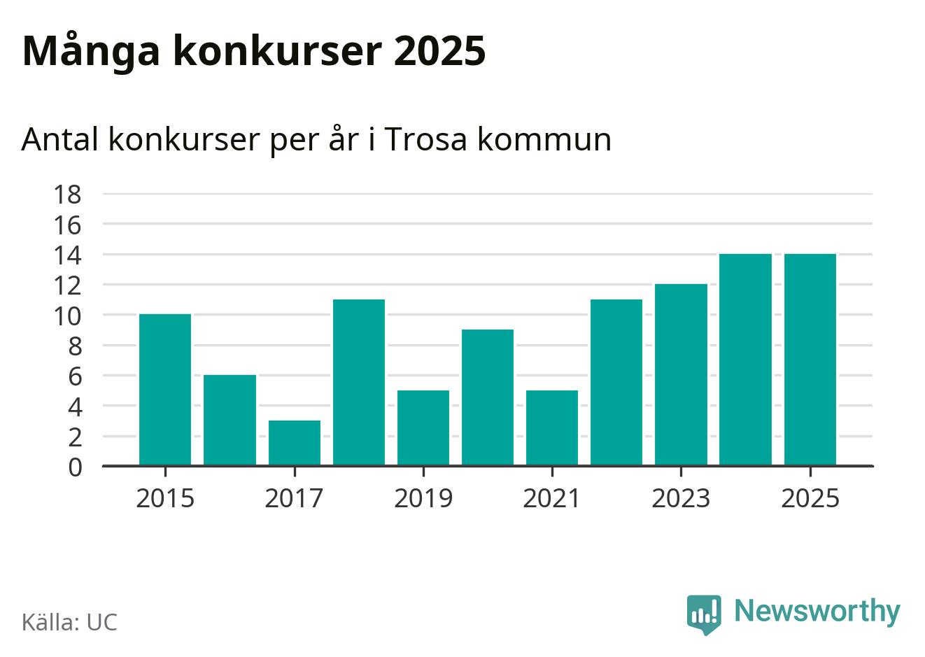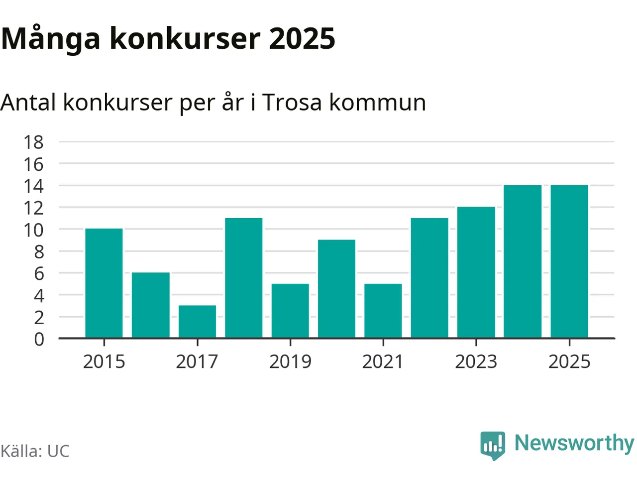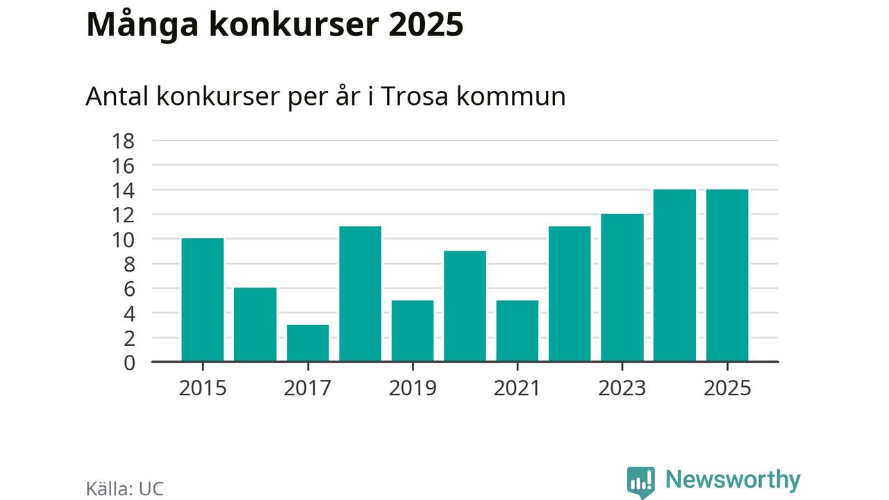 Under år 2025 gick sammanlagt 14 bolag med säte i Trosa kommun i konkurs. Det är, tillsammans med 2024, det högsta antalet sedan åtminstone år 2015. Det visar ny statistik från UC.