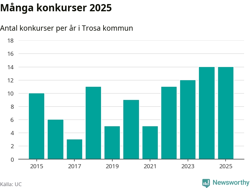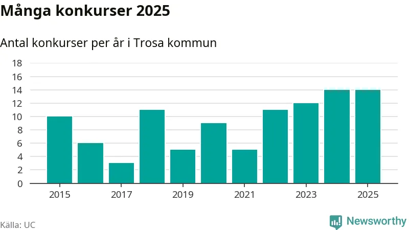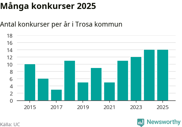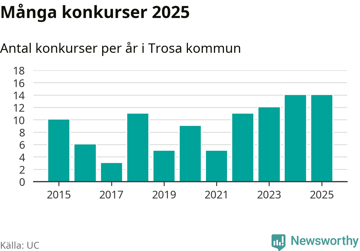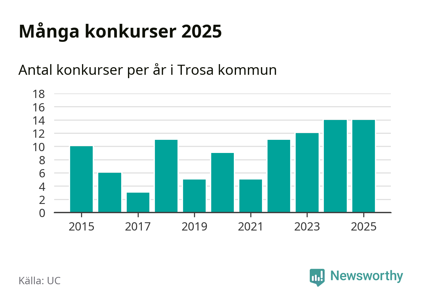 Under år 2025 gick sammanlagt 14 bolag med säte i Trosa kommun i konkurs. Det är, tillsammans med 2024, det högsta antalet sedan åtminstone år 2015. Det visar ny statistik från UC.