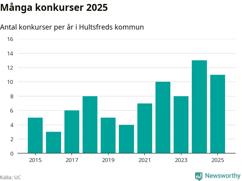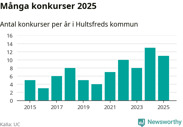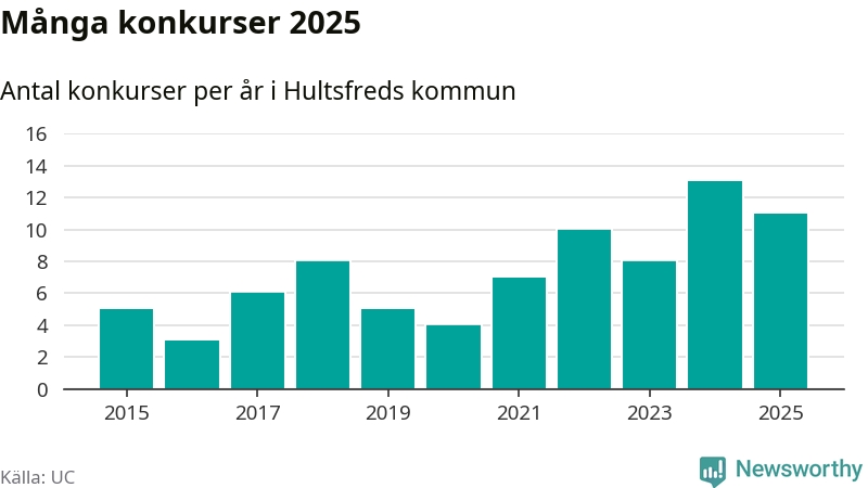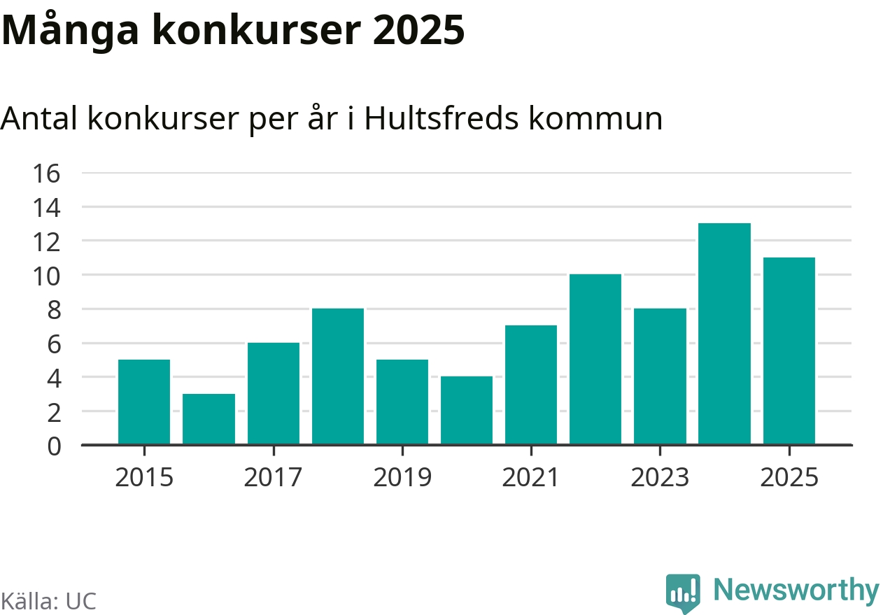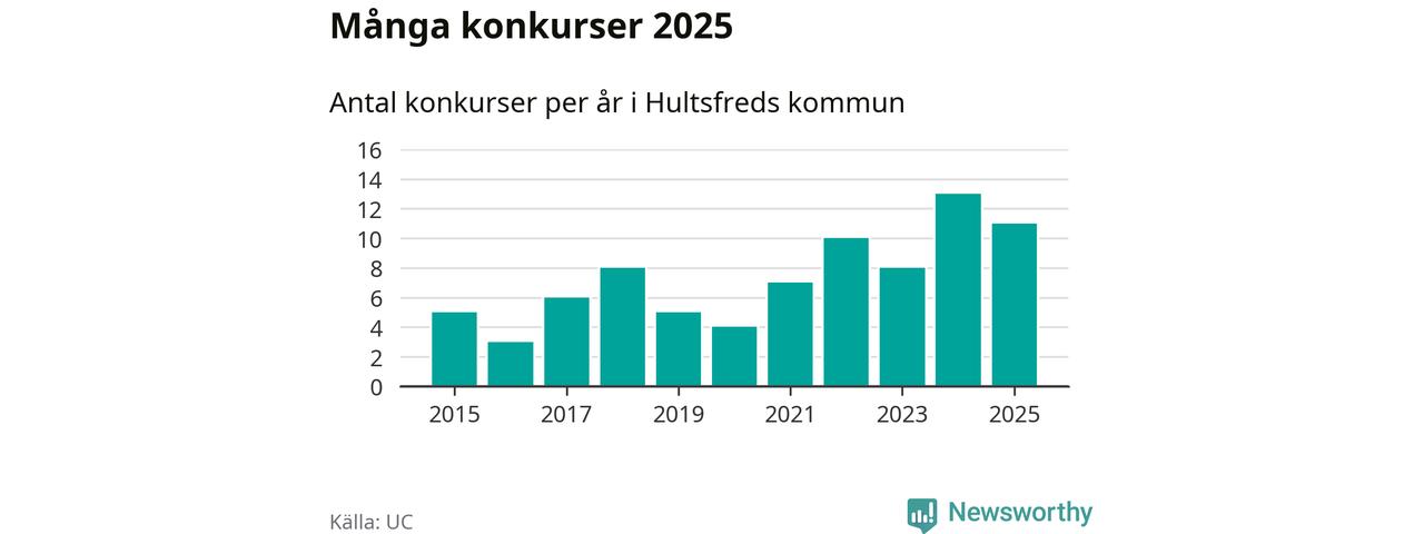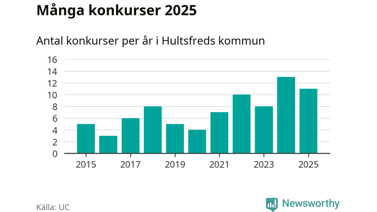 Under år 2025 gick sammanlagt elva bolag med säte i Hultsfreds kommun i konkurs. Det är två färre än året innan. Toppåret, sedan 2015, var just 2024 sett till antalet konkursföretag. Det visar ny statistik från UC.