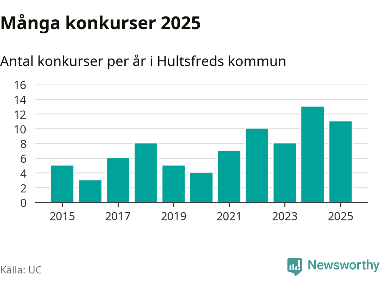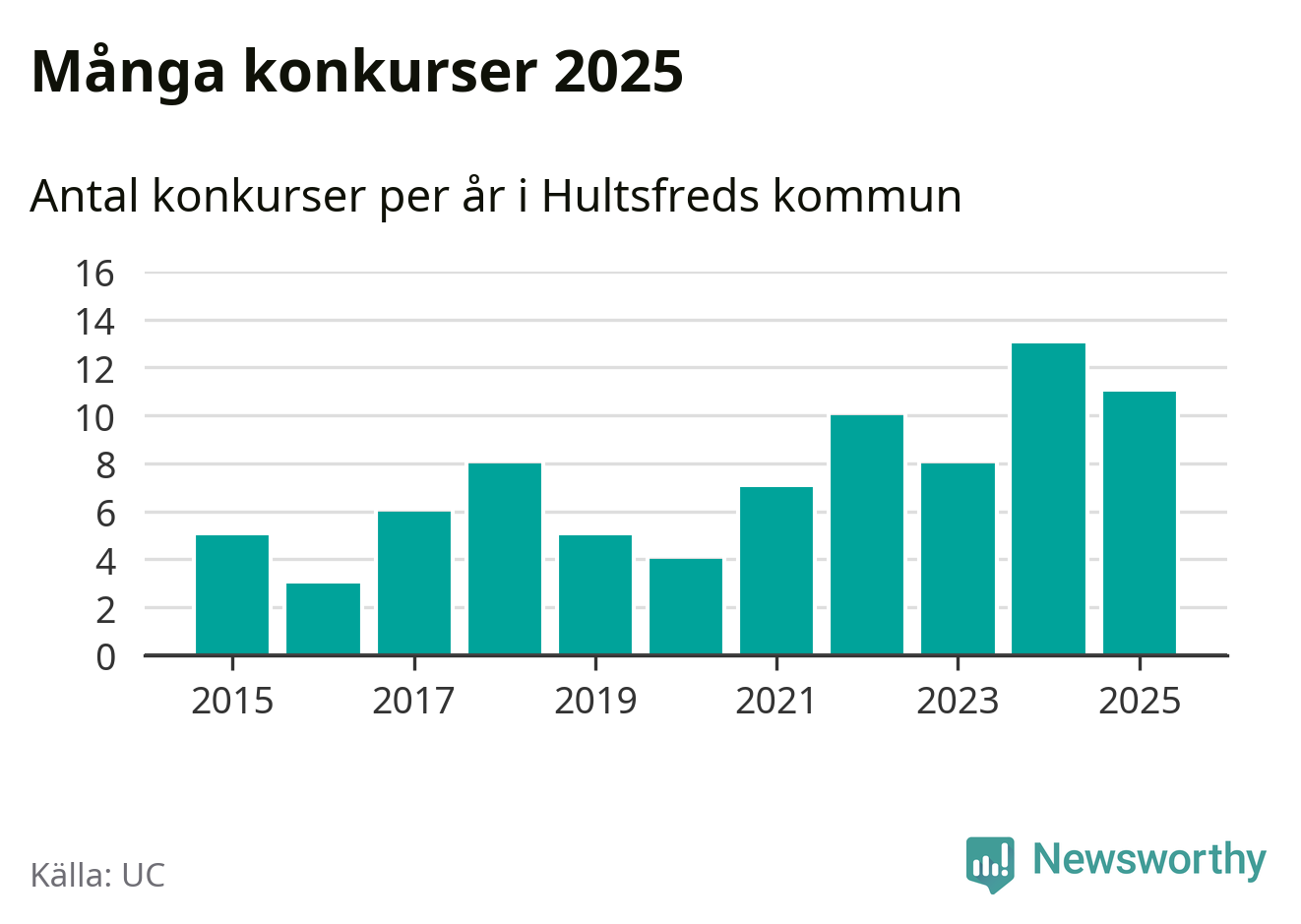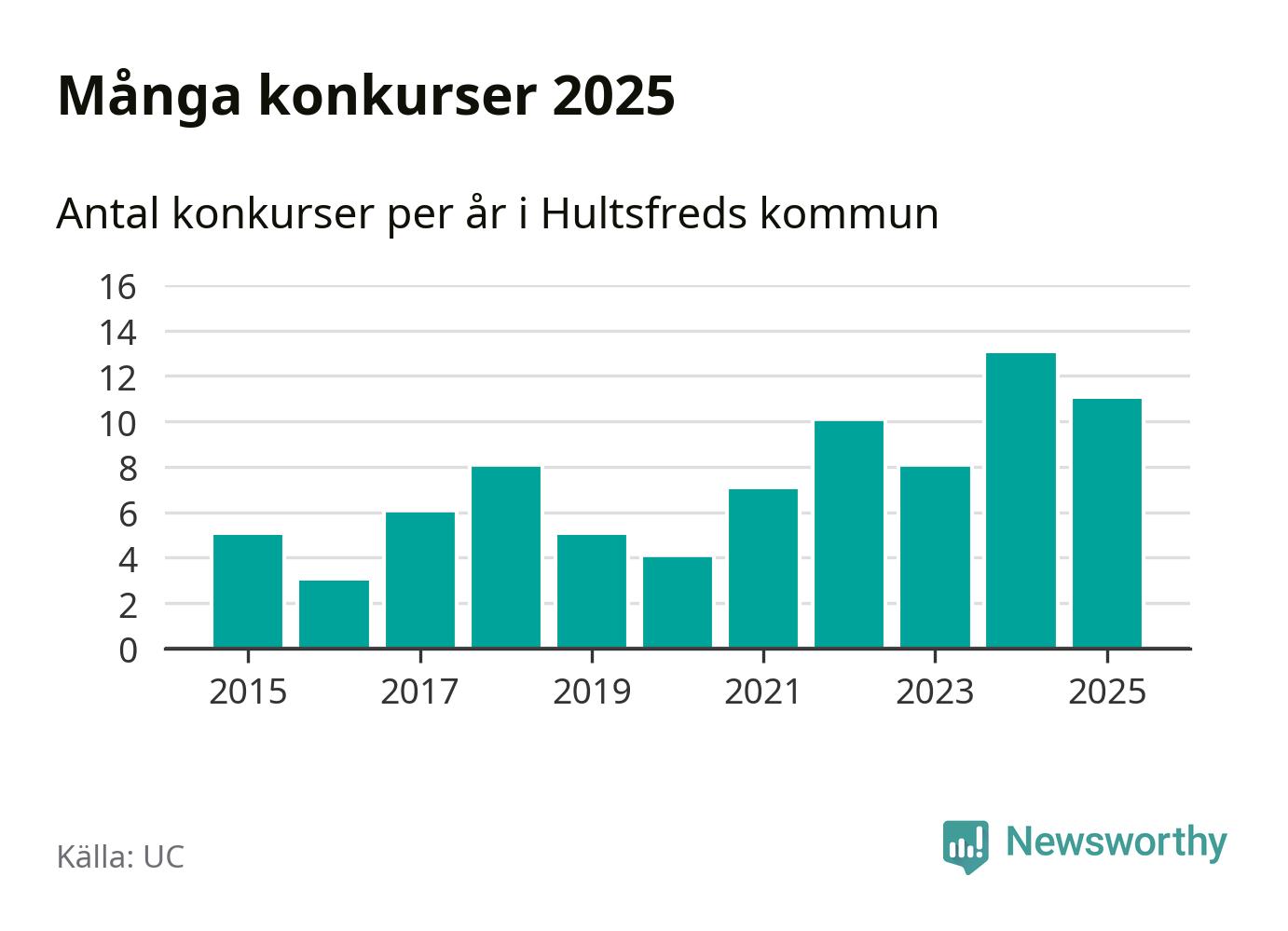 Under år 2025 gick sammanlagt elva bolag med säte i Hultsfreds kommun i konkurs. Det är två färre än året innan. Toppåret, sedan 2015, var just 2024 sett till antalet konkursföretag. Det visar ny statistik från UC.
