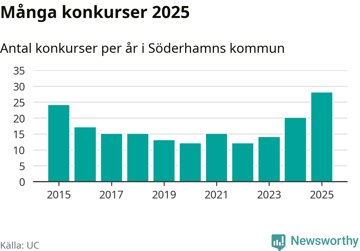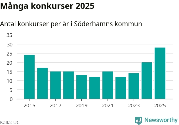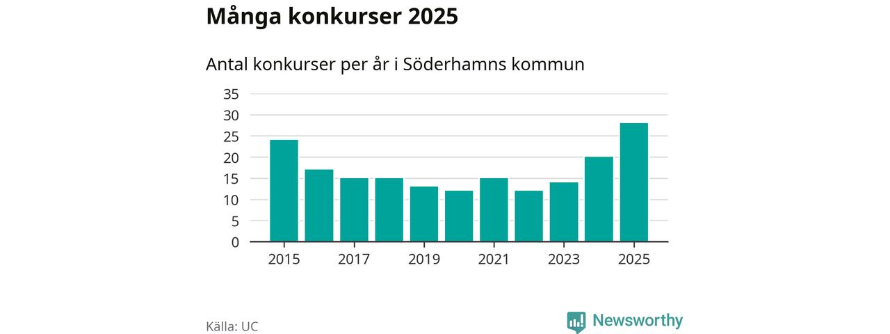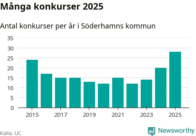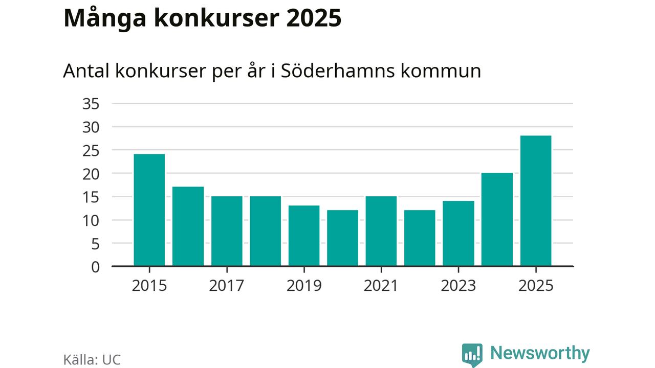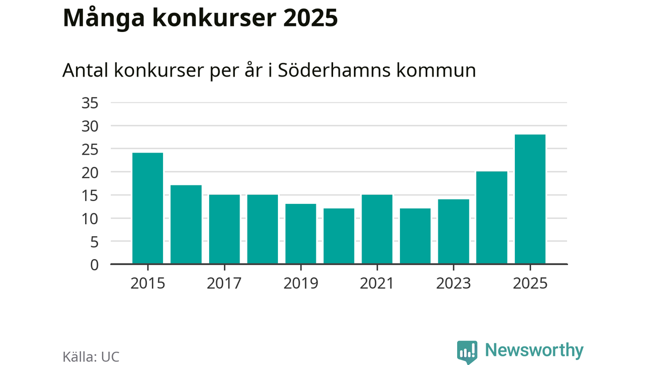 Under år 2025 gick sammanlagt 28 bolag med säte i Söderhamns kommun i konkurs. Det är det högsta antalet sedan åtminstone år 2015. Det visar ny statistik från UC.