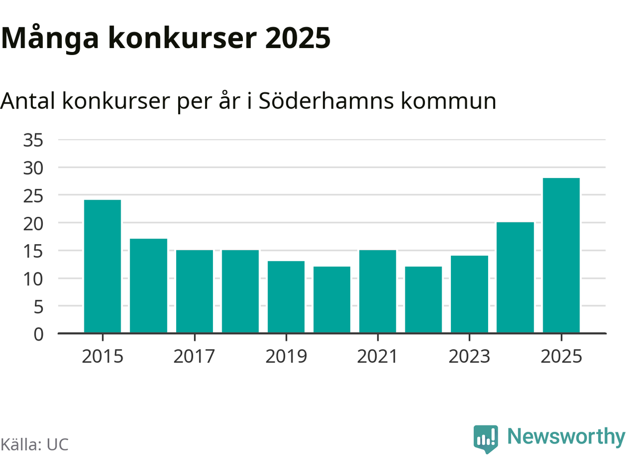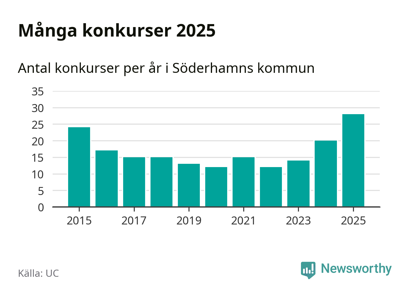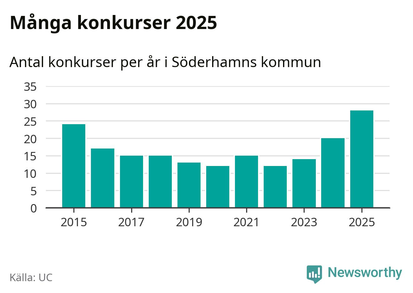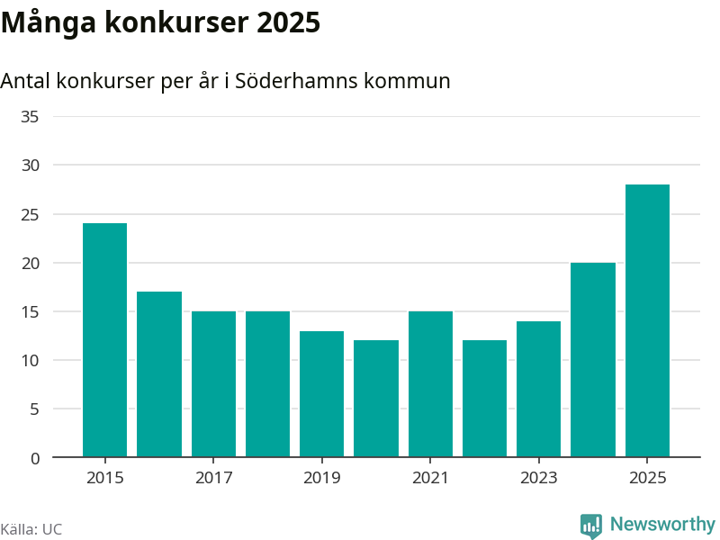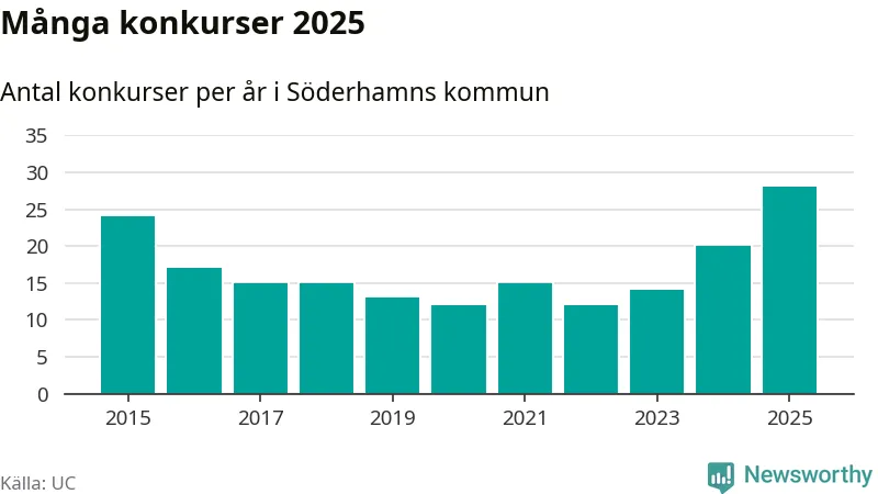 Under år 2025 gick sammanlagt 28 bolag med säte i Söderhamns kommun i konkurs. Det är det högsta antalet sedan åtminstone år 2015. Det visar ny statistik från UC.