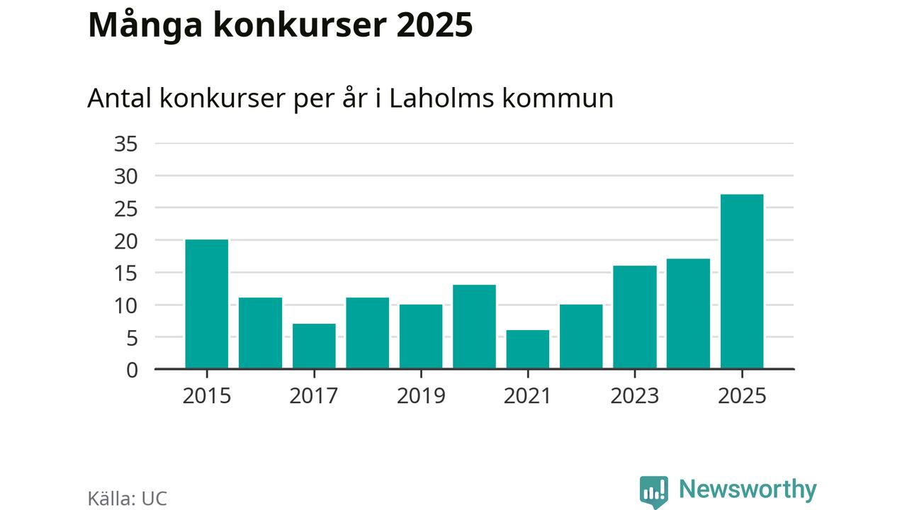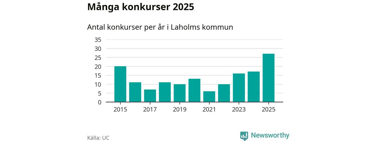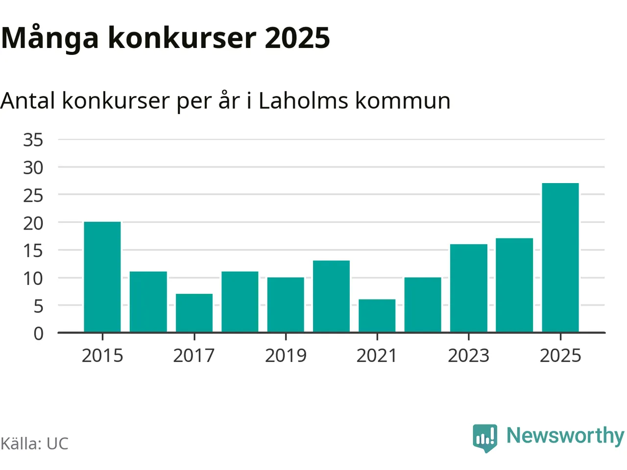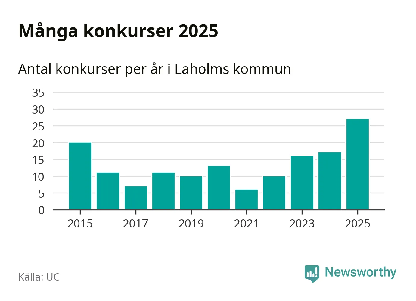 Under år 2025 gick sammanlagt 27 bolag med säte i Laholms kommun i konkurs. Det är det högsta antalet sedan åtminstone år 2015. Det visar ny statistik från UC.