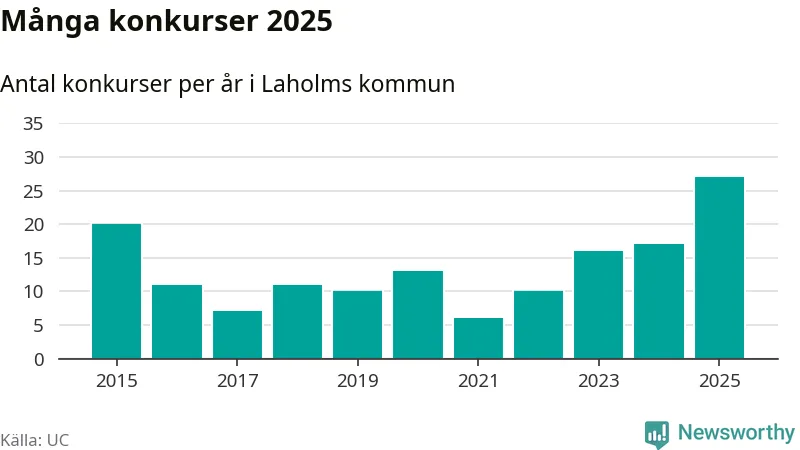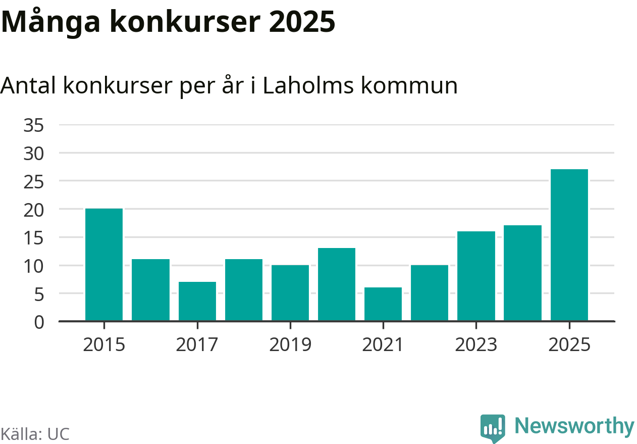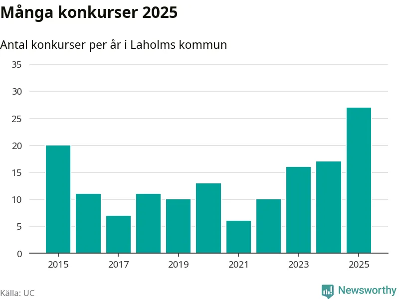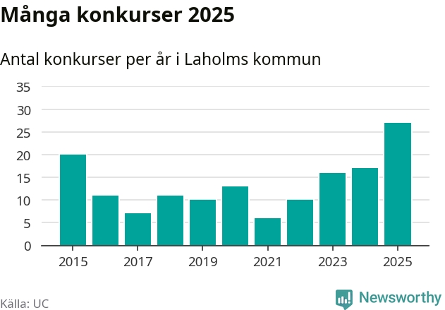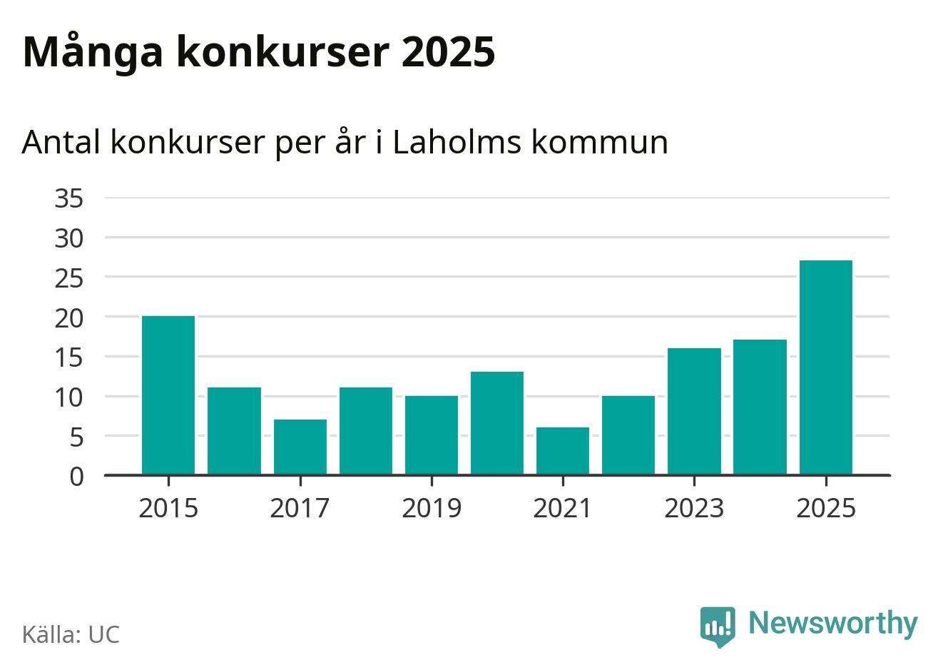 Under år 2025 gick sammanlagt 27 bolag med säte i Laholms kommun i konkurs. Det är det högsta antalet sedan åtminstone år 2015. Det visar ny statistik från UC.