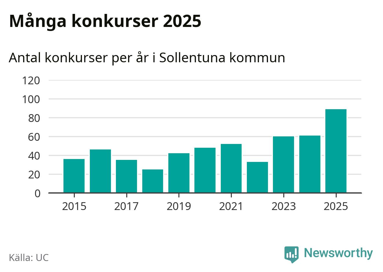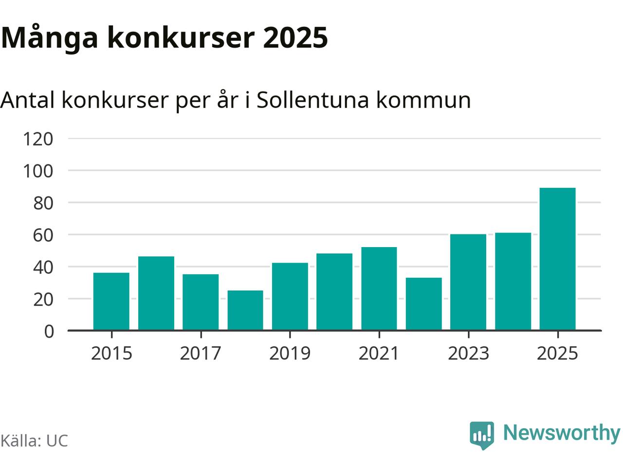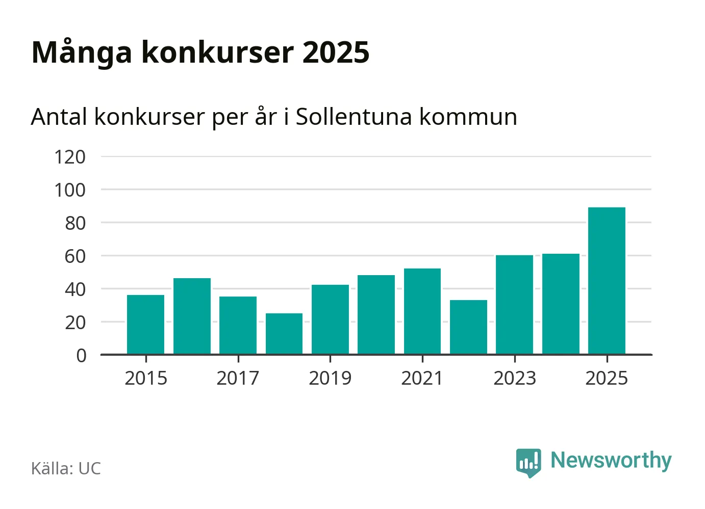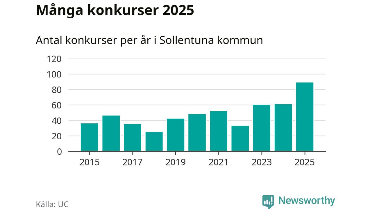 Under år 2025 gick sammanlagt 89 bolag med säte i Sollentuna kommun i konkurs. Det är det högsta antalet sedan åtminstone år 2015. Det visar ny statistik från UC.