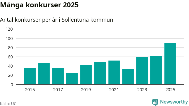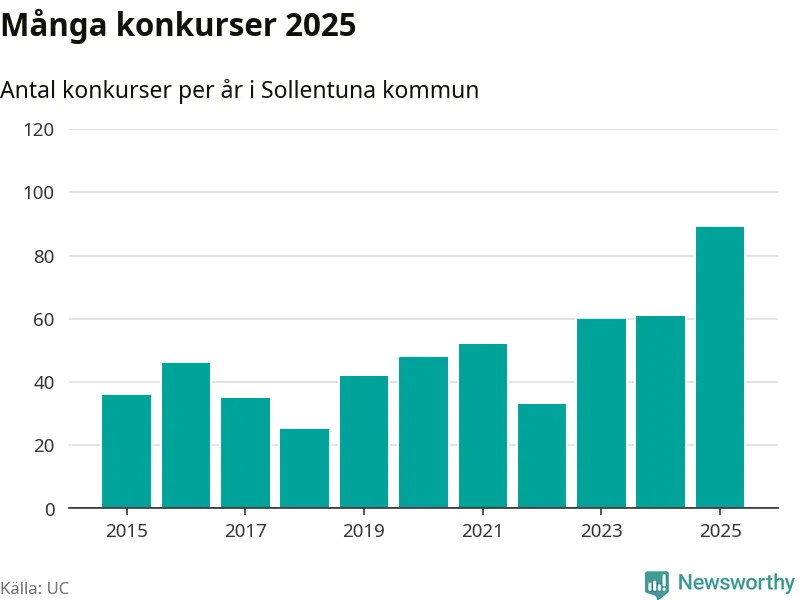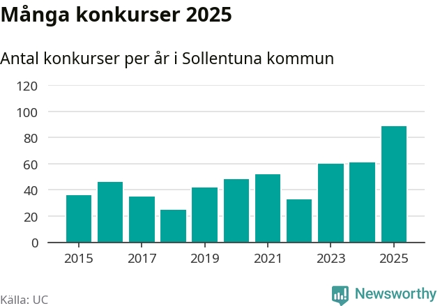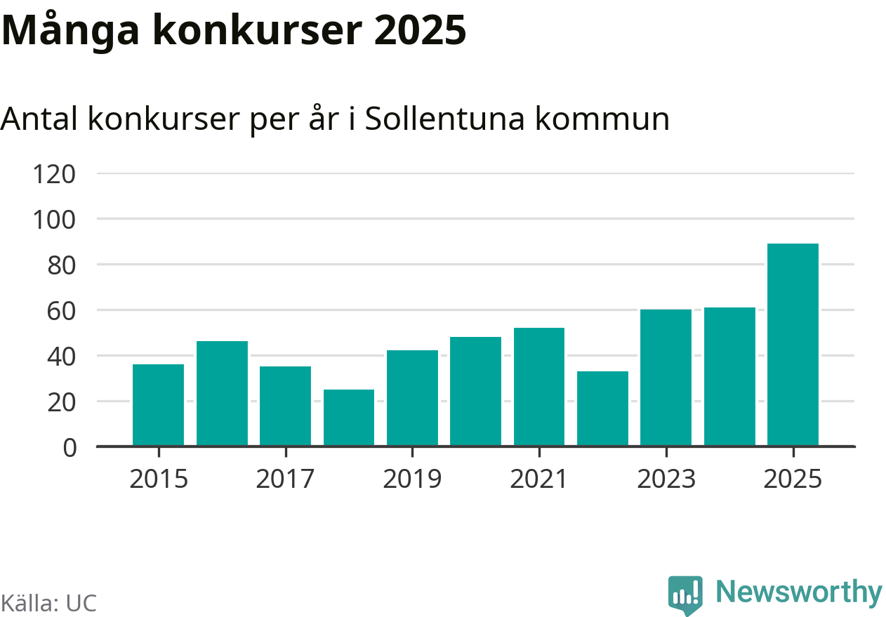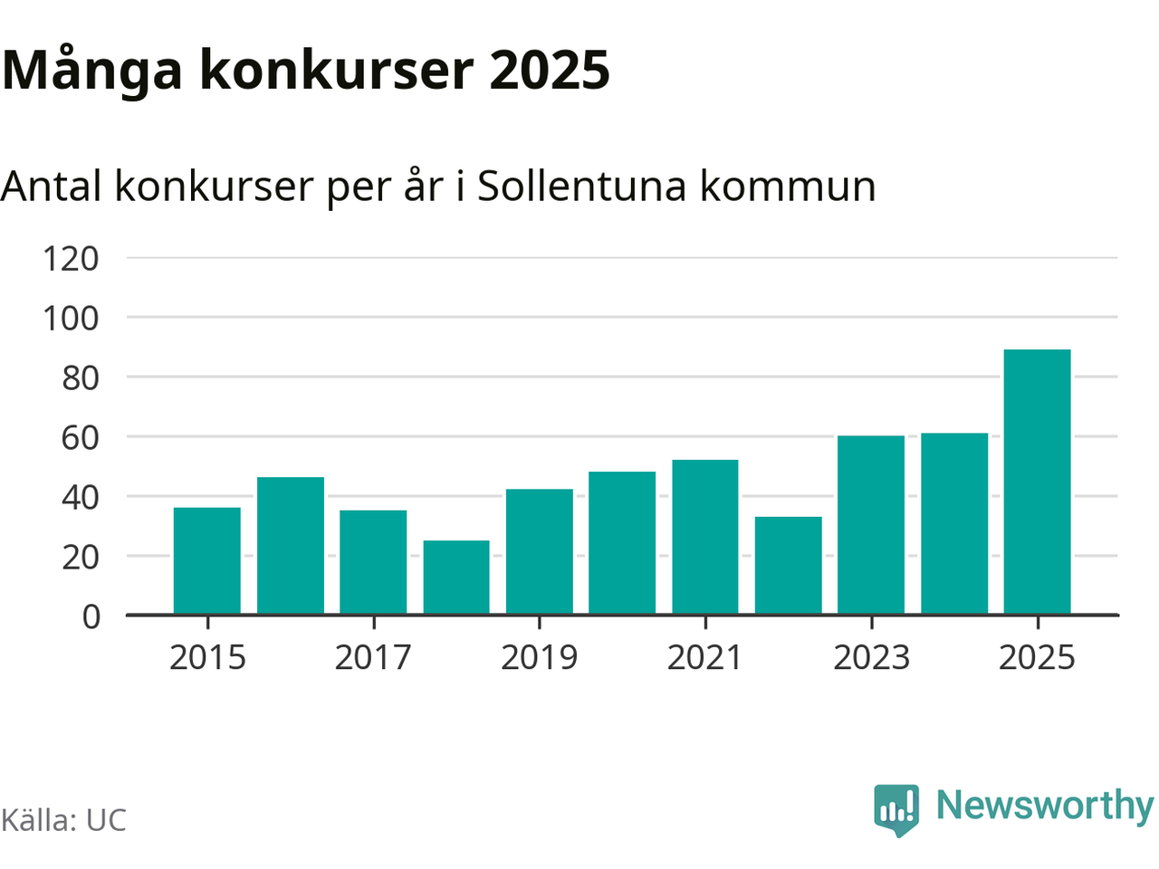 Under år 2025 gick sammanlagt 89 bolag med säte i Sollentuna kommun i konkurs. Det är det högsta antalet sedan åtminstone år 2015. Det visar ny statistik från UC.