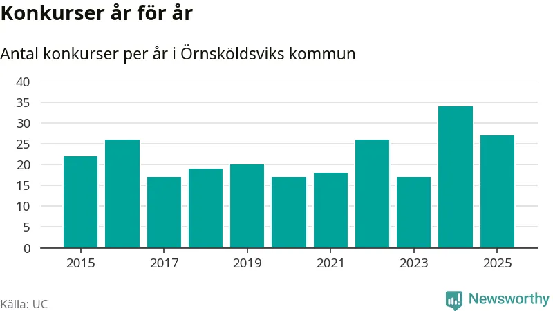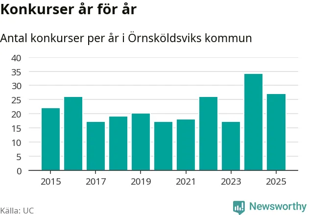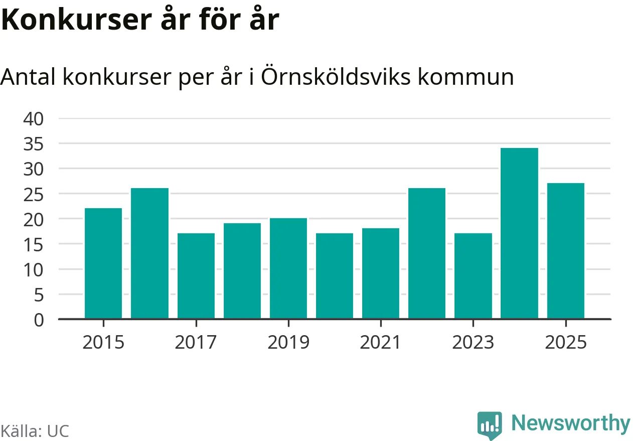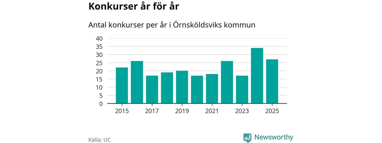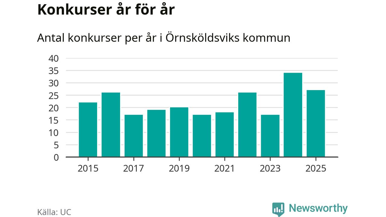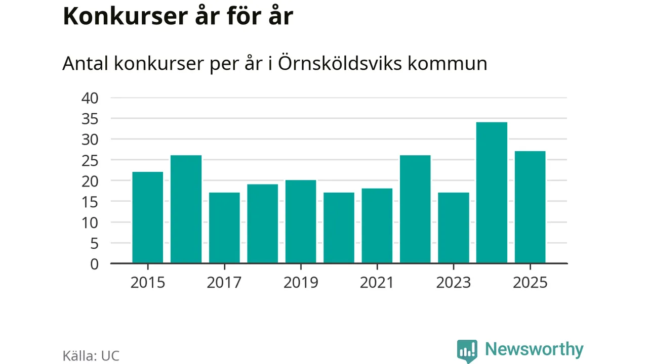 Under år 2025 gick sammanlagt 27 bolag med säte i Örnsköldsviks kommun i konkurs. Det är sju färre än året innan då 34 bolag gick i konkurs. Toppåret, sedan 2015, var just 2024 sett till antalet konkursföretag. Det visar ny statistik från UC.