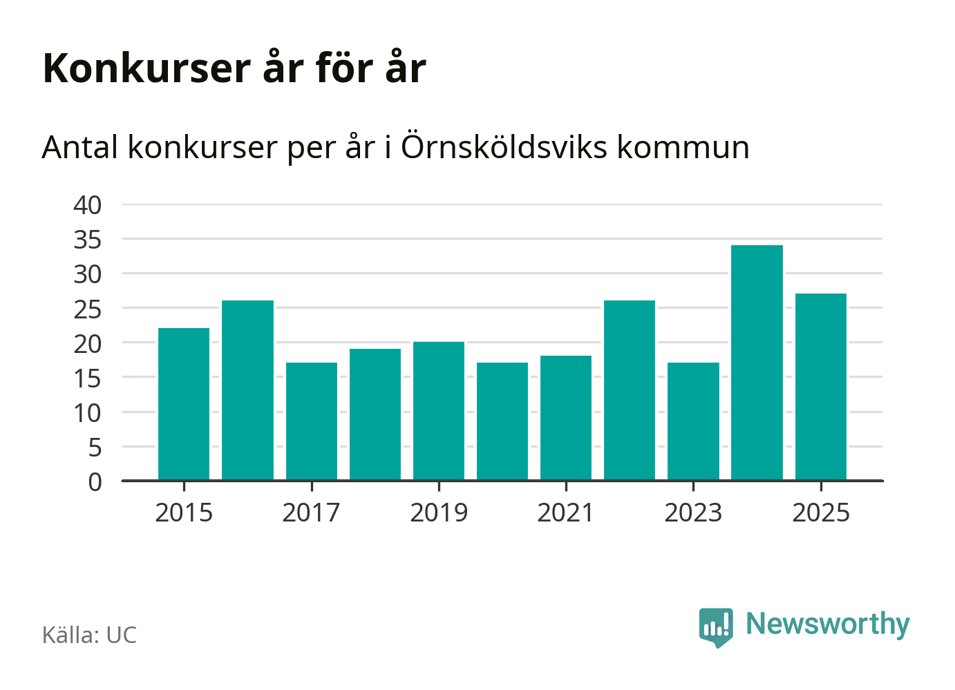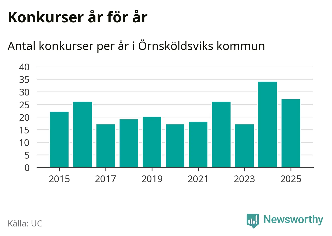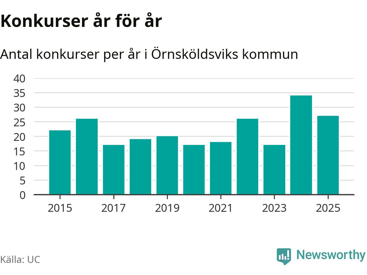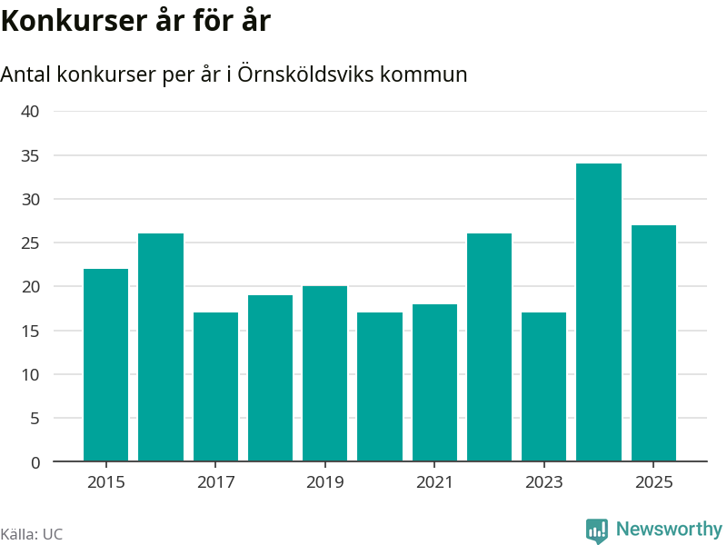 Under år 2025 gick sammanlagt 27 bolag med säte i Örnsköldsviks kommun i konkurs. Det är sju färre än året innan då 34 bolag gick i konkurs. Toppåret, sedan 2015, var just 2024 sett till antalet konkursföretag. Det visar ny statistik från UC.