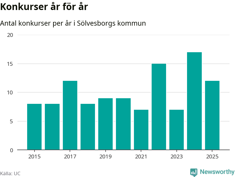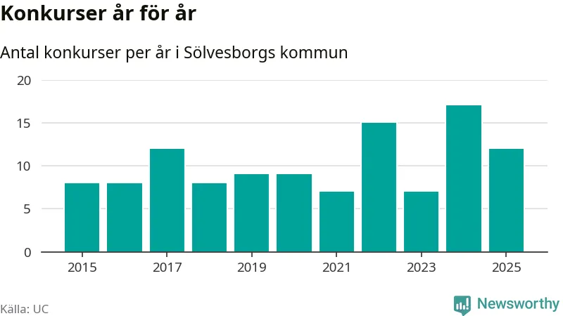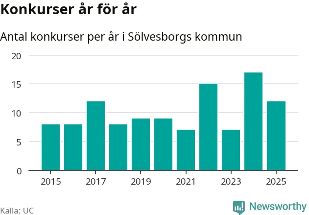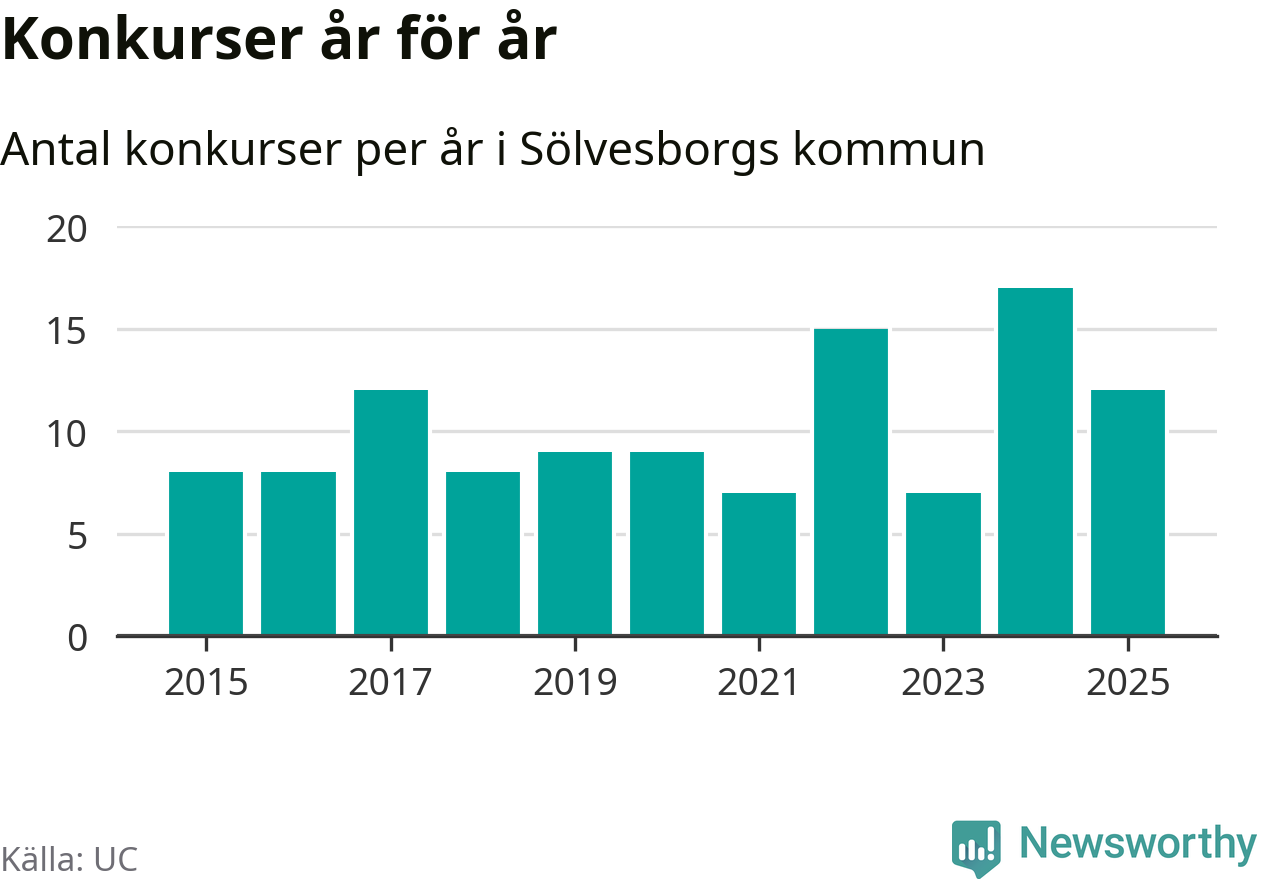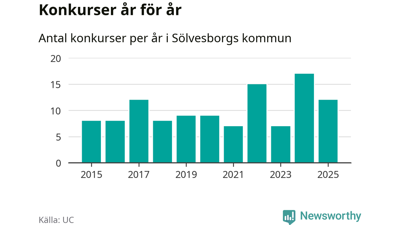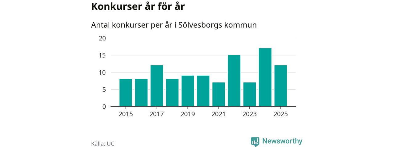 Under år 2025 gick sammanlagt tolv bolag med säte i Sölvesborgs kommun i konkurs. Det är fem färre än året innan då 17 bolag gick i konkurs. Toppåret, sedan 2015, var just 2024 sett till antalet konkursföretag. Det visar ny statistik från UC.