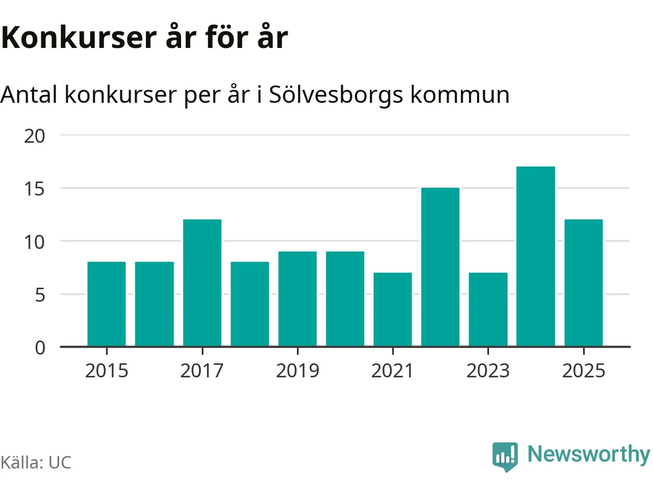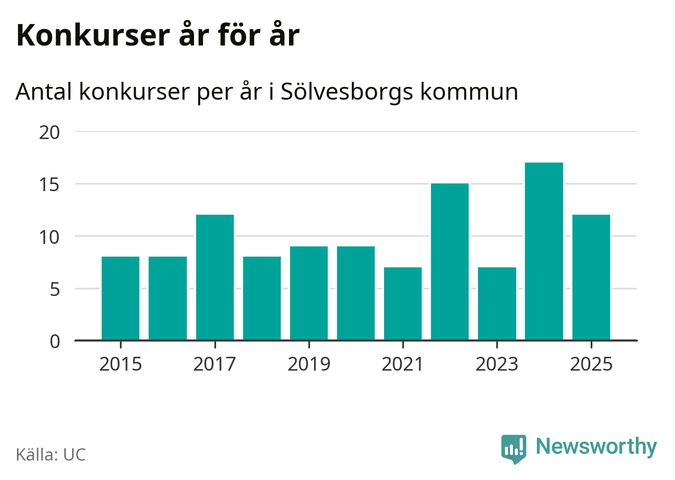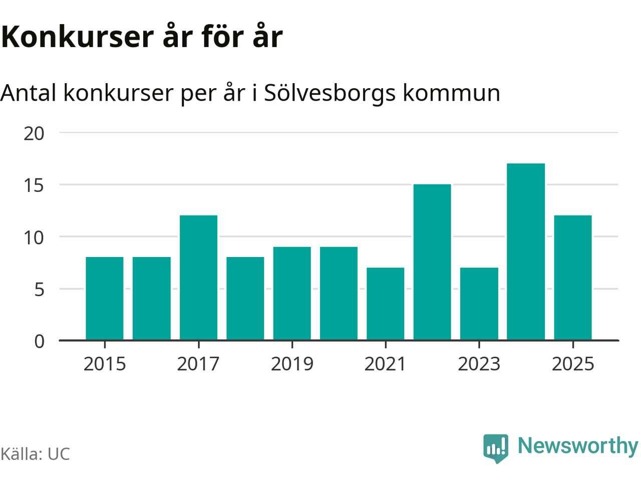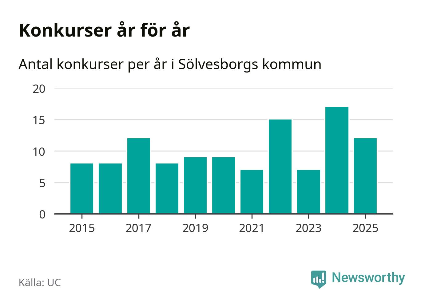 Under år 2025 gick sammanlagt tolv bolag med säte i Sölvesborgs kommun i konkurs. Det är fem färre än året innan då 17 bolag gick i konkurs. Toppåret, sedan 2015, var just 2024 sett till antalet konkursföretag. Det visar ny statistik från UC.