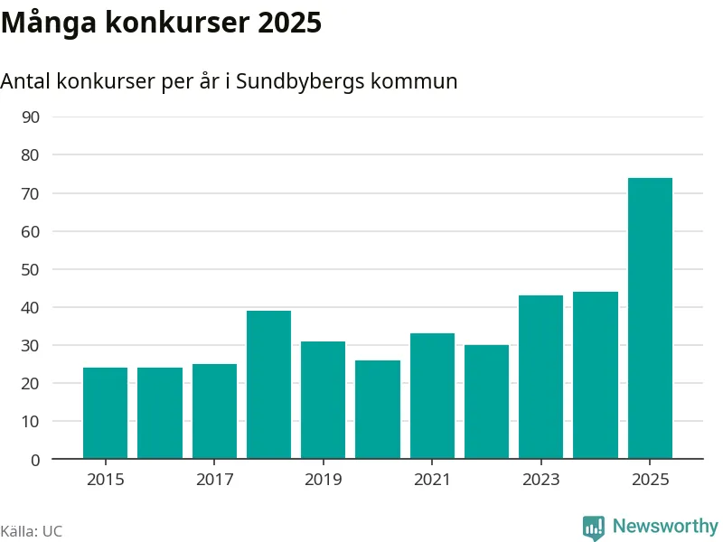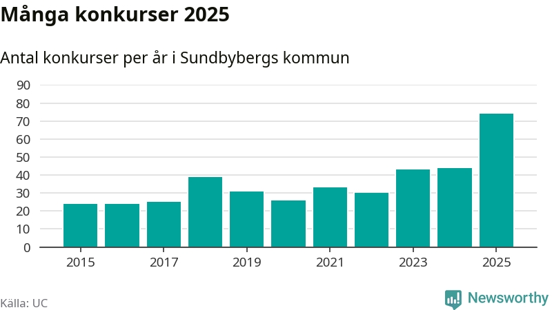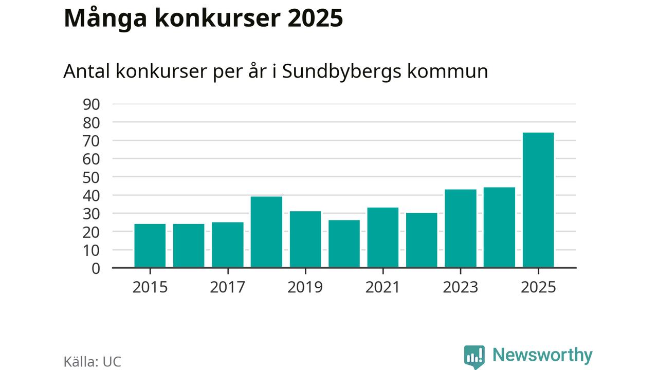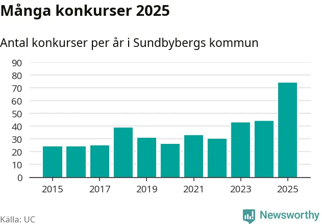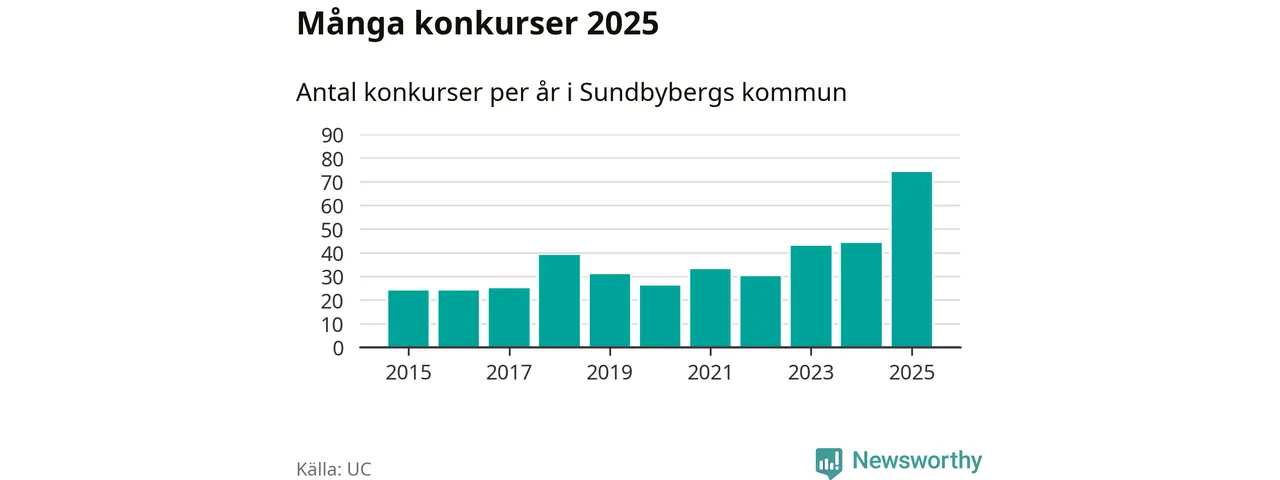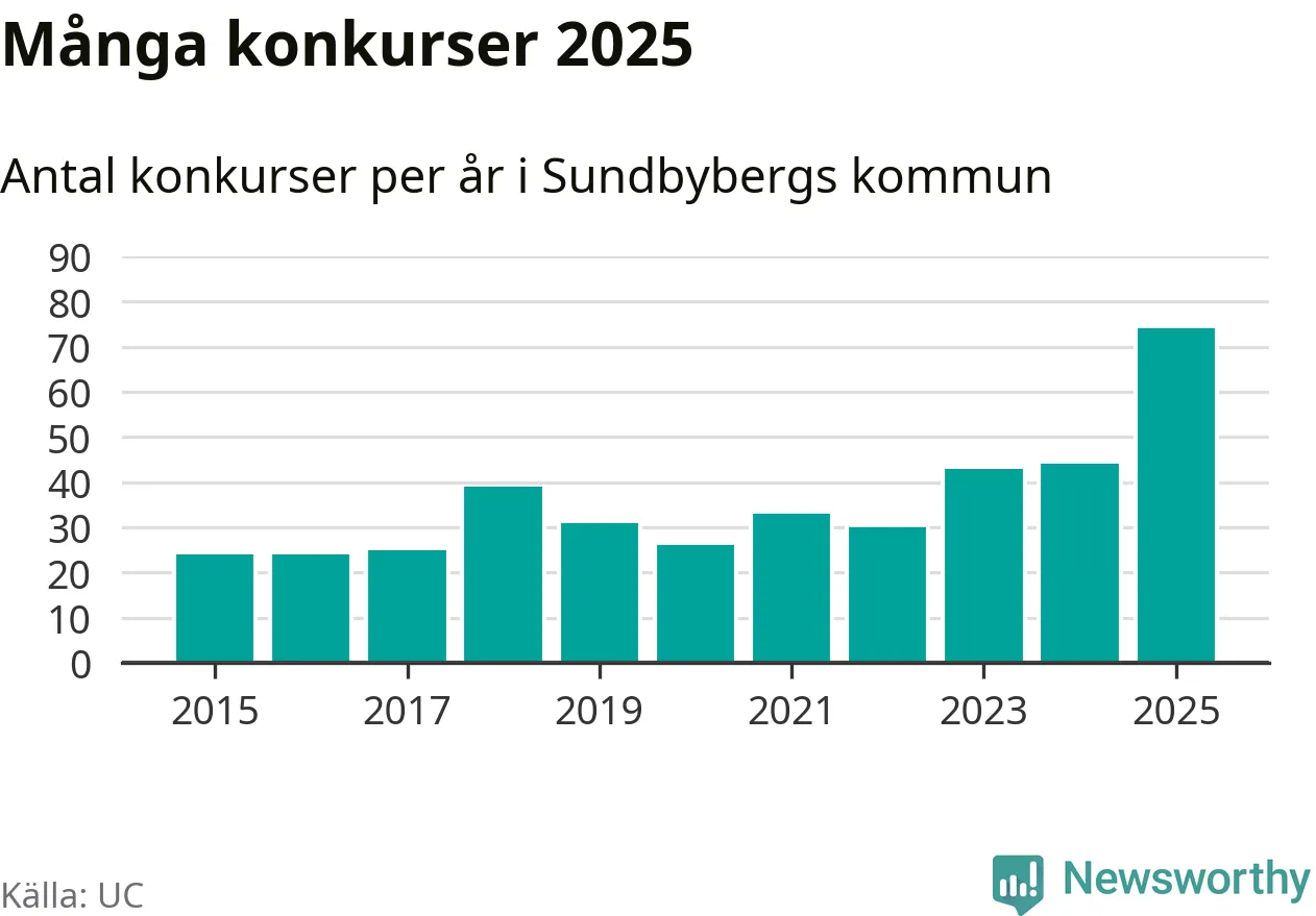 Under år 2025 gick sammanlagt 74 bolag med säte i Sundbybergs kommun i konkurs. Det är det högsta antalet sedan åtminstone år 2015. Det visar ny statistik från UC.