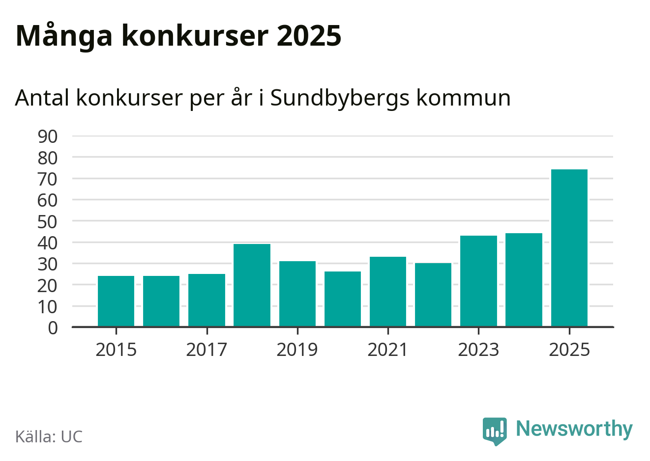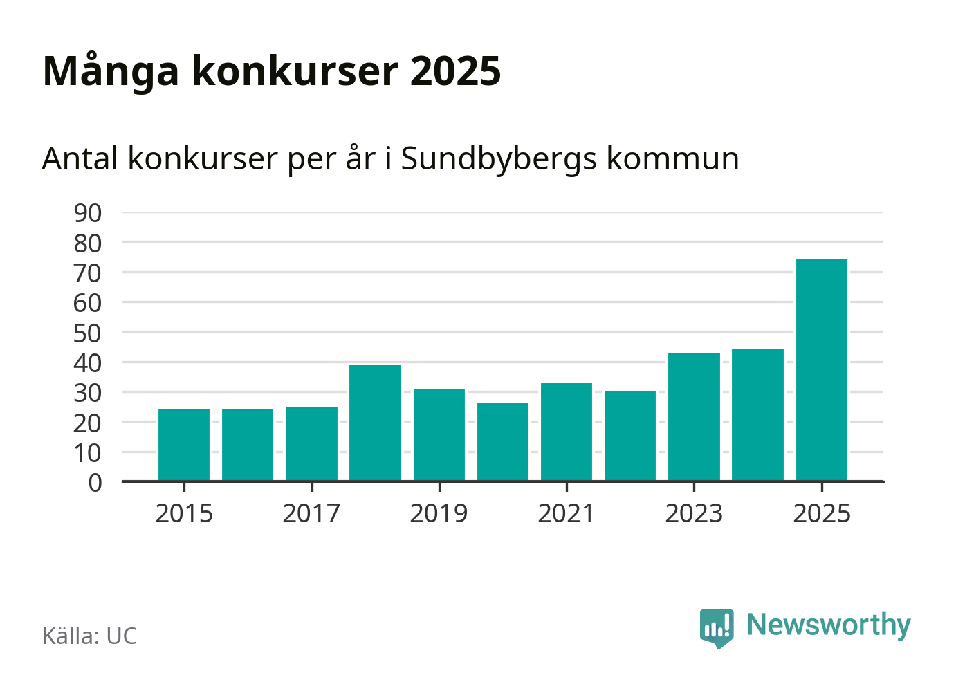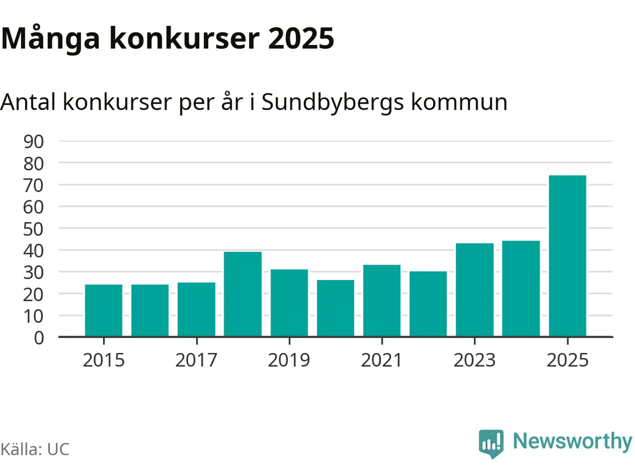 Under år 2025 gick sammanlagt 74 bolag med säte i Sundbybergs kommun i konkurs. Det är det högsta antalet sedan åtminstone år 2015. Det visar ny statistik från UC.