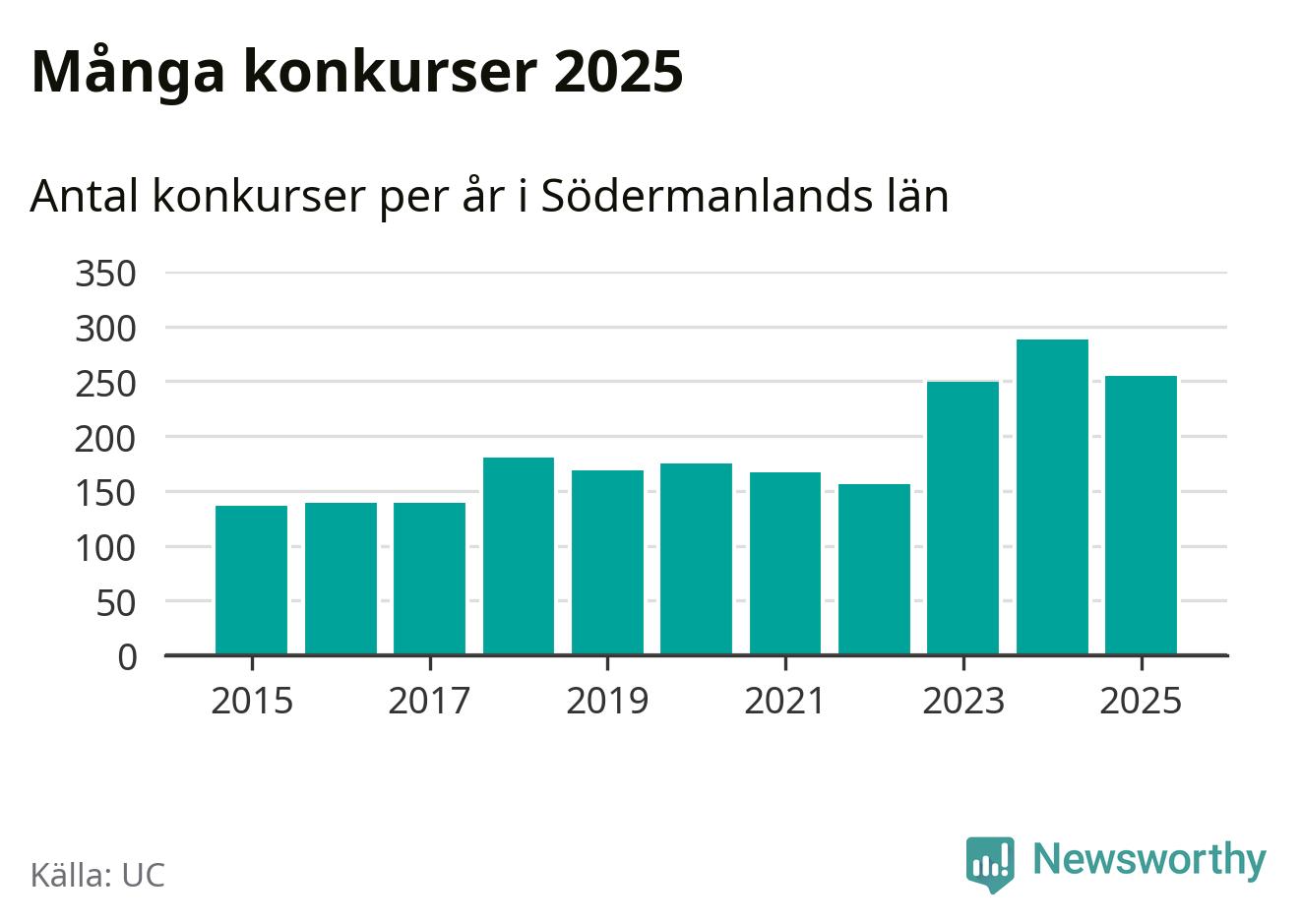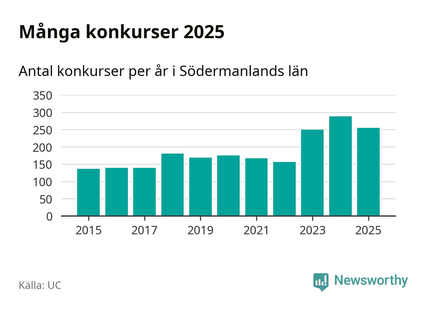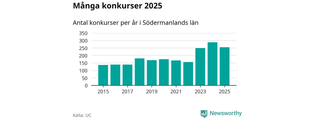 Under år 2025 gick sammanlagt 255 bolag med säte i Södermanlands län i konkurs. Det är 33 färre än året innan då 288 bolag gick i konkurs. Toppåret, sedan 2015, var just 2024 sett till antalet konkursföretag. Det visar ny statistik från UC.