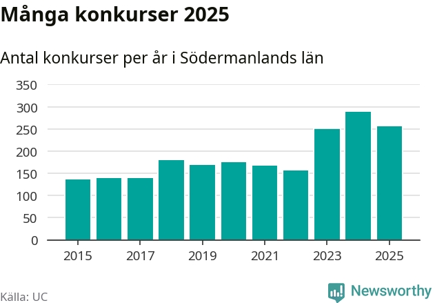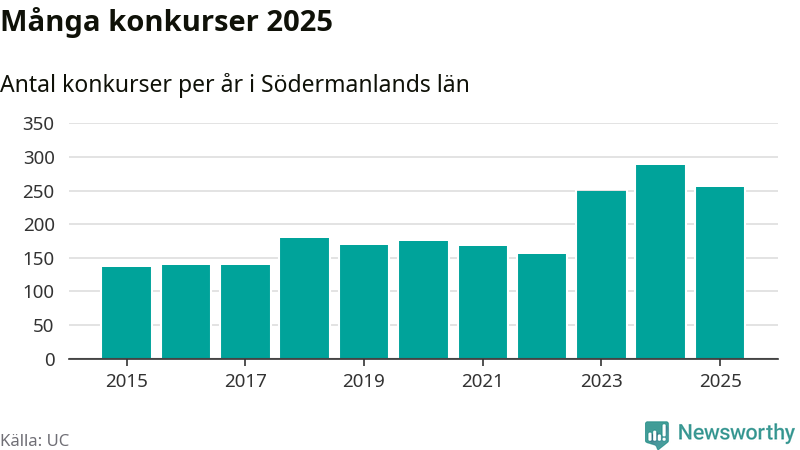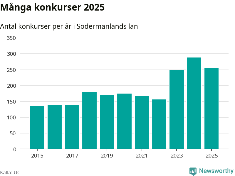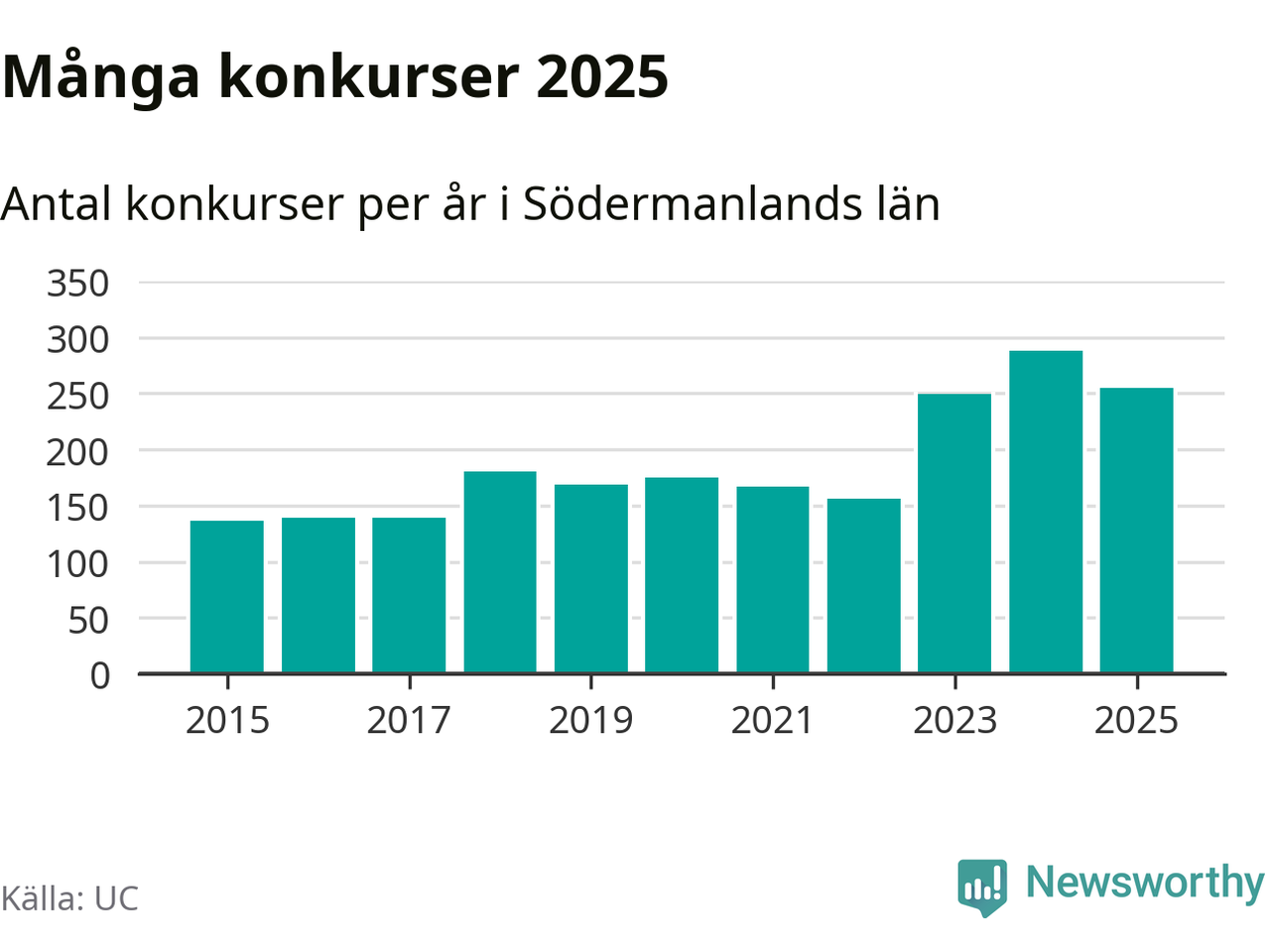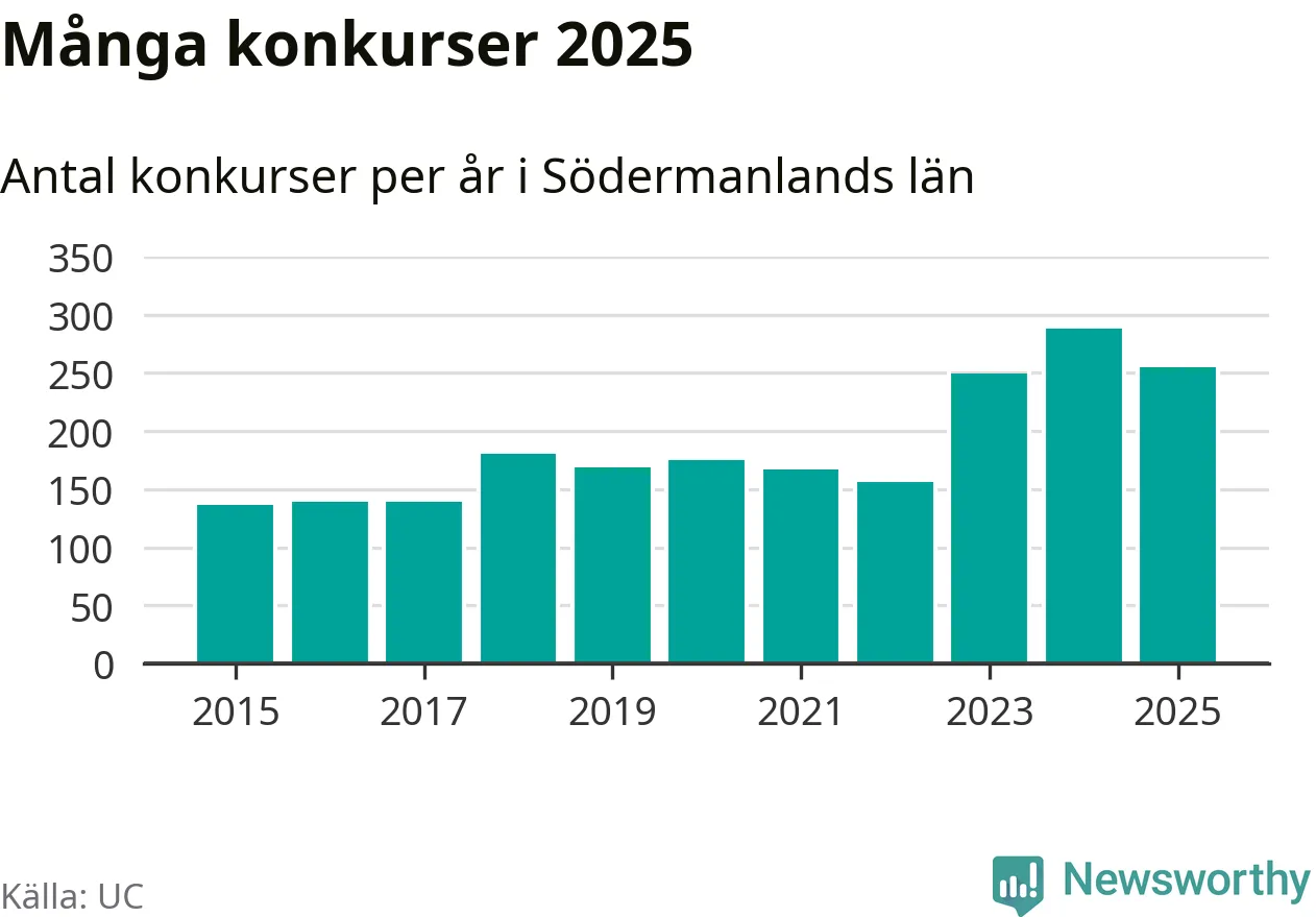 Under år 2025 gick sammanlagt 255 bolag med säte i Södermanlands län i konkurs. Det är 33 färre än året innan då 288 bolag gick i konkurs. Toppåret, sedan 2015, var just 2024 sett till antalet konkursföretag. Det visar ny statistik från UC.