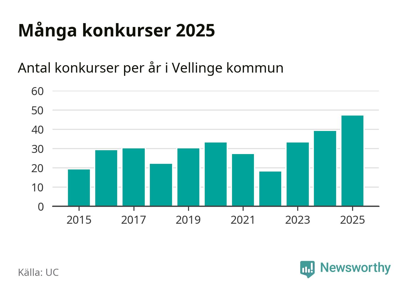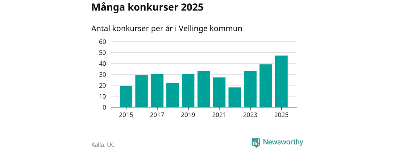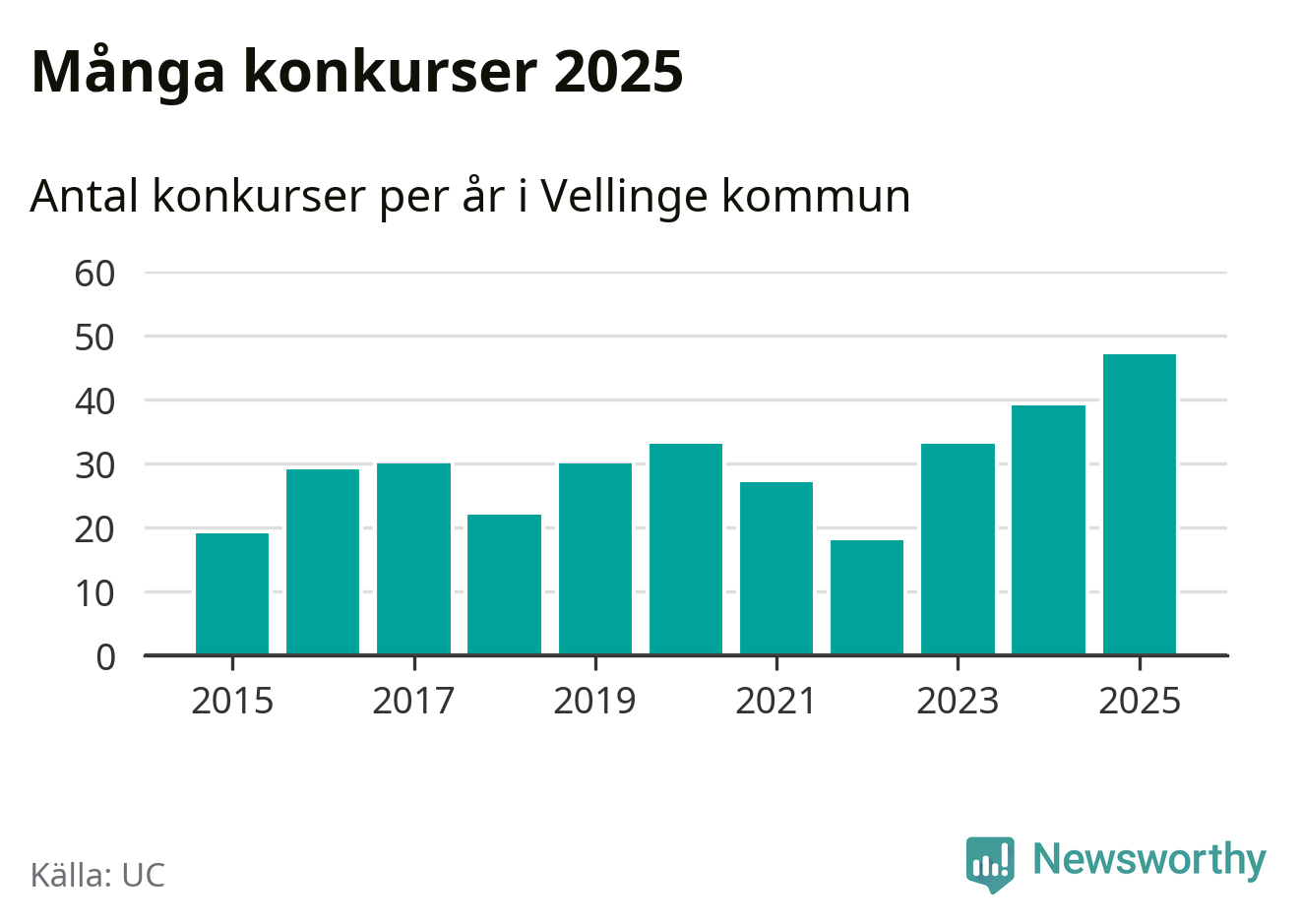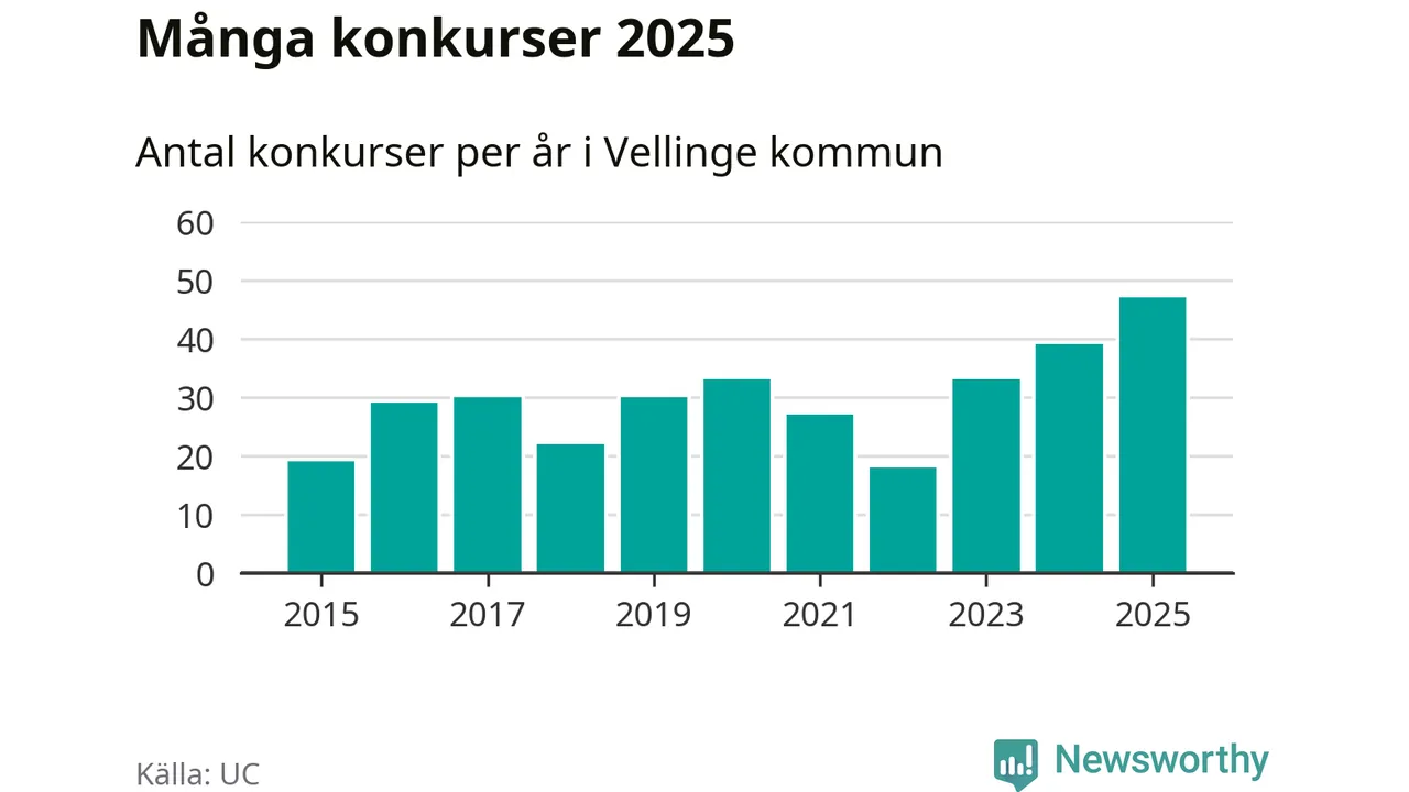 Under år 2025 gick sammanlagt 47 bolag med säte i Vellinge kommun i konkurs. Det är det högsta antalet sedan åtminstone år 2015. Det visar ny statistik från UC.