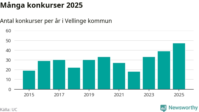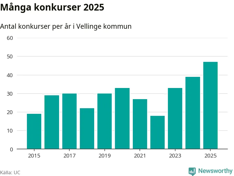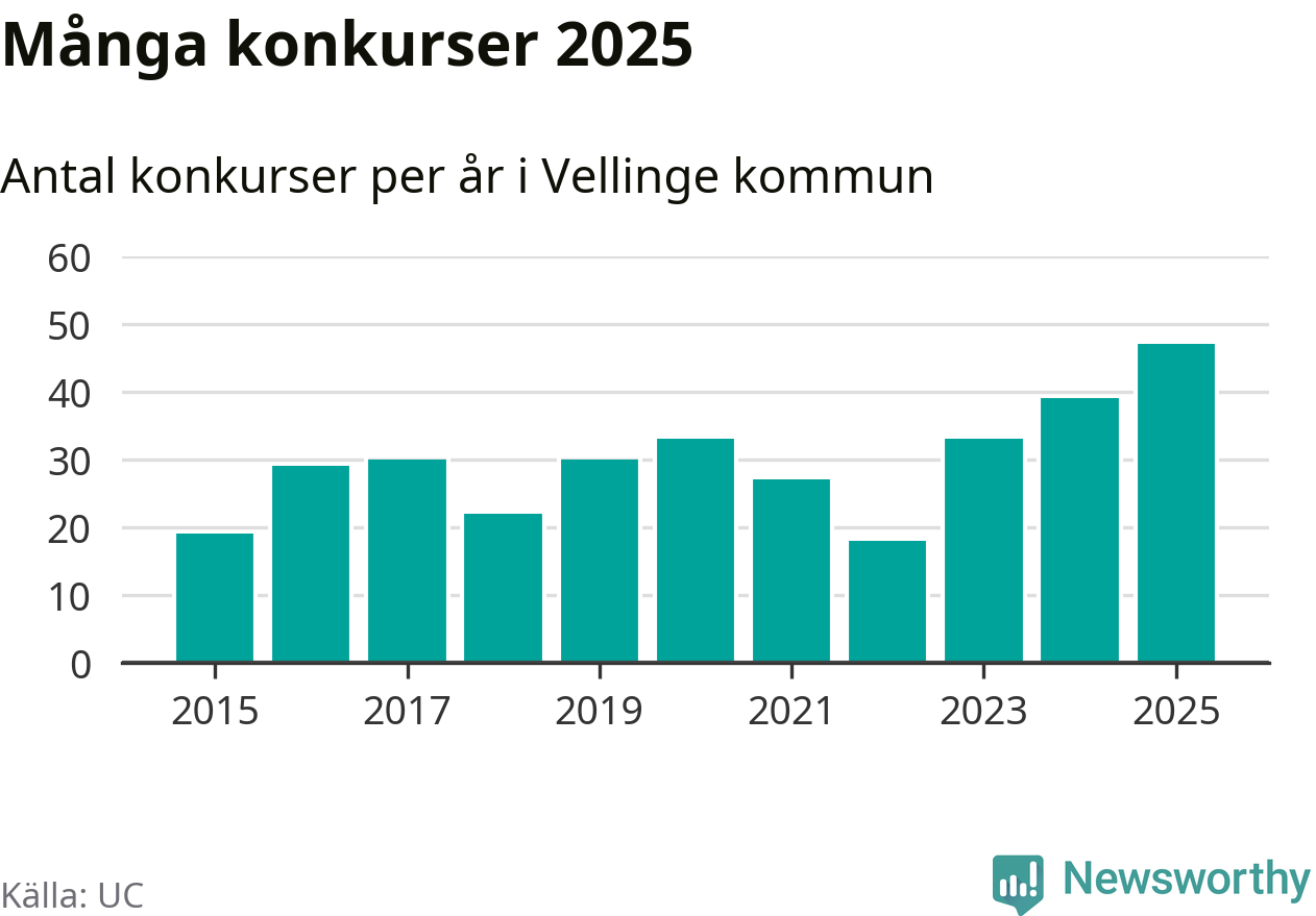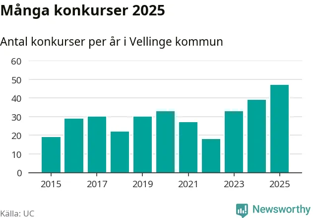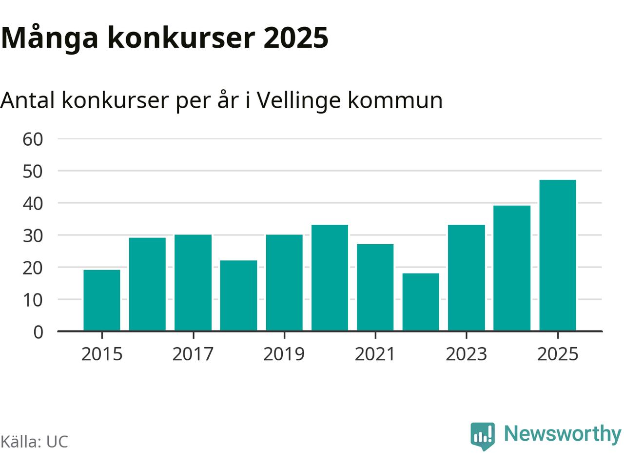 Under år 2025 gick sammanlagt 47 bolag med säte i Vellinge kommun i konkurs. Det är det högsta antalet sedan åtminstone år 2015. Det visar ny statistik från UC.