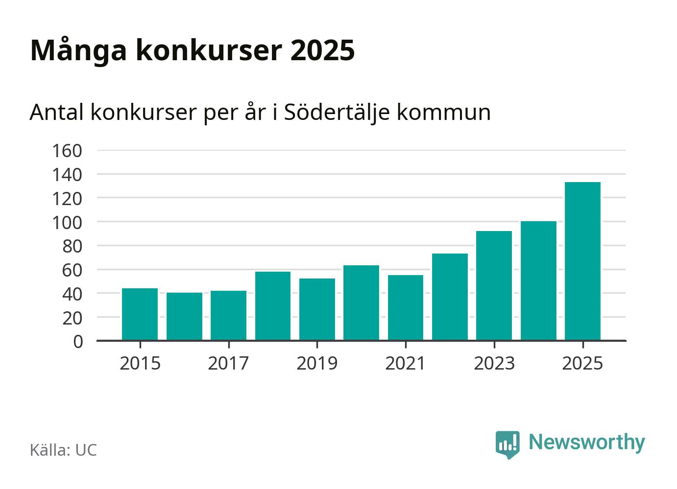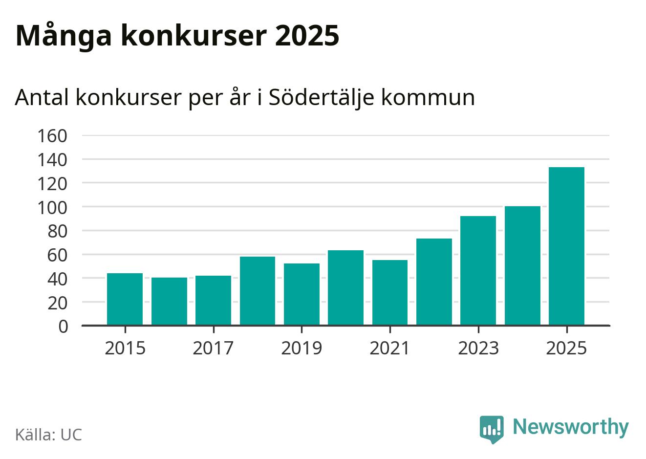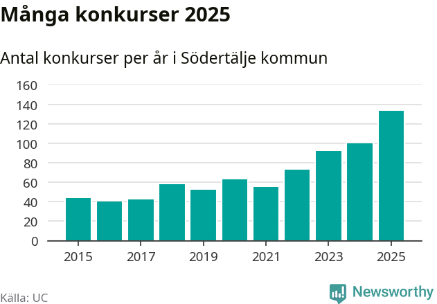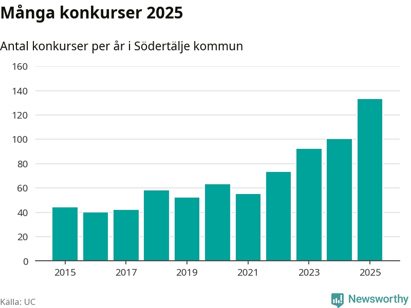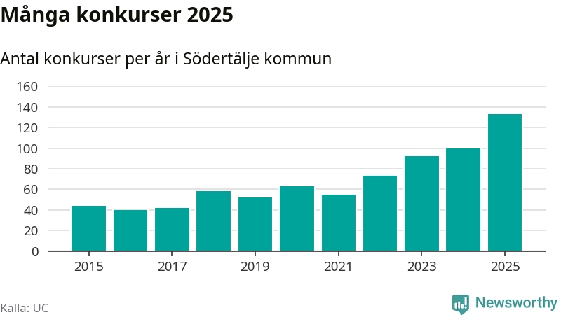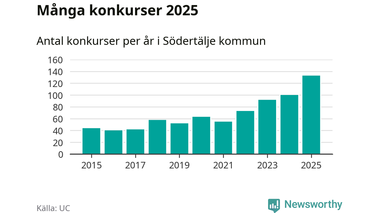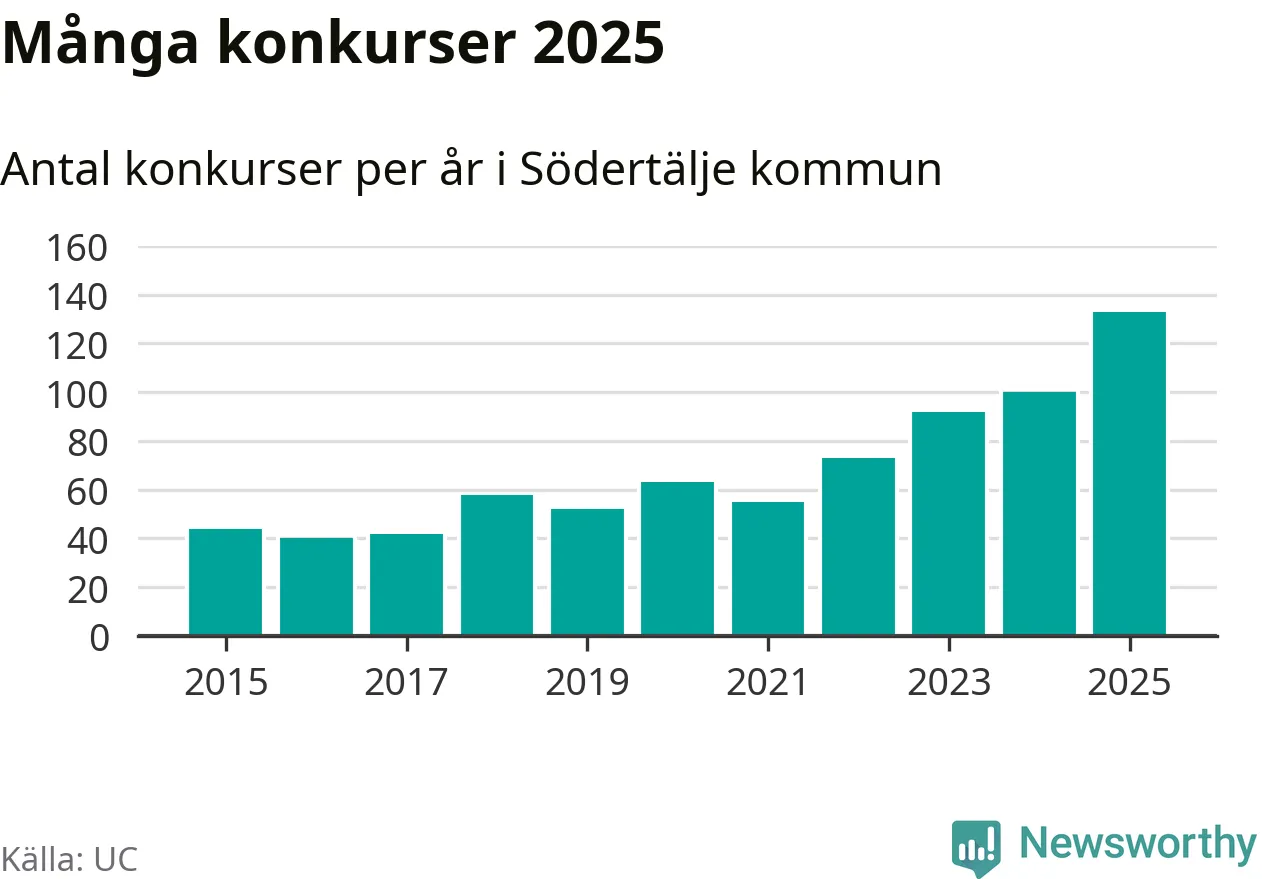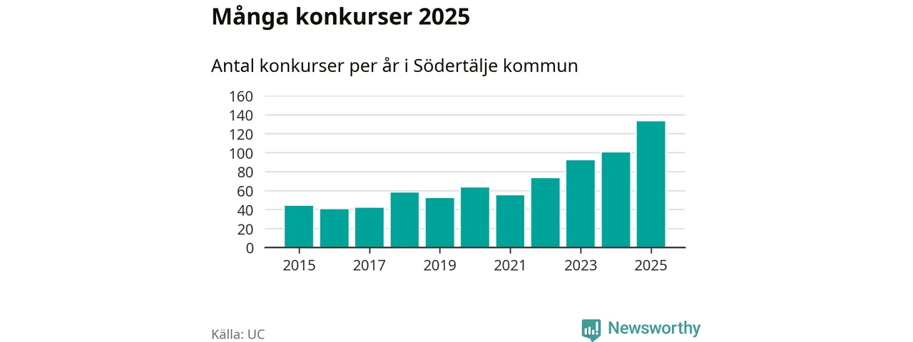 Under år 2025 gick sammanlagt 133 bolag med säte i Södertälje kommun i konkurs. Det är det högsta antalet sedan åtminstone år 2015. Det visar ny statistik från UC.