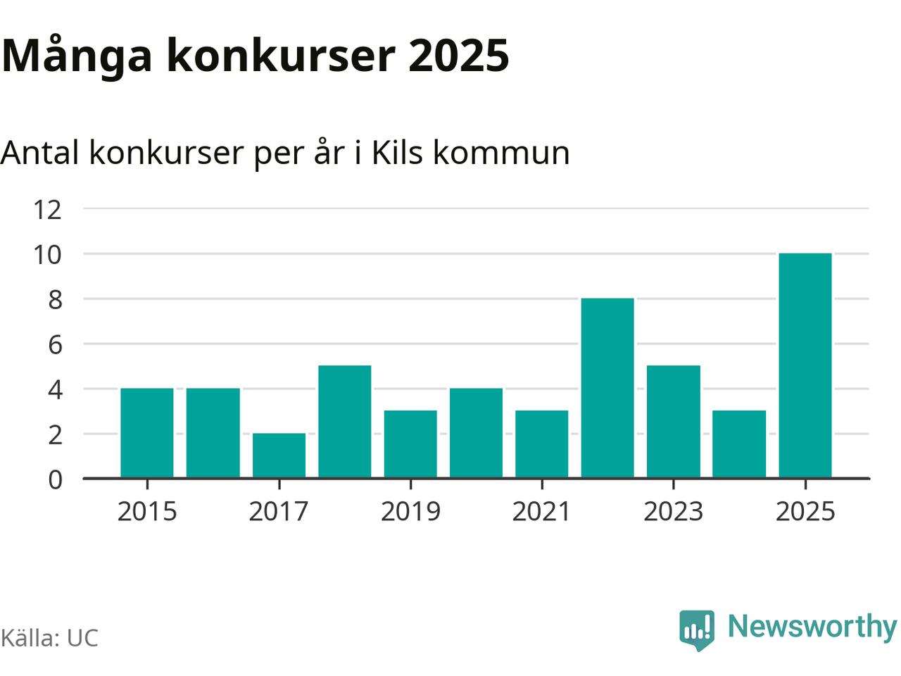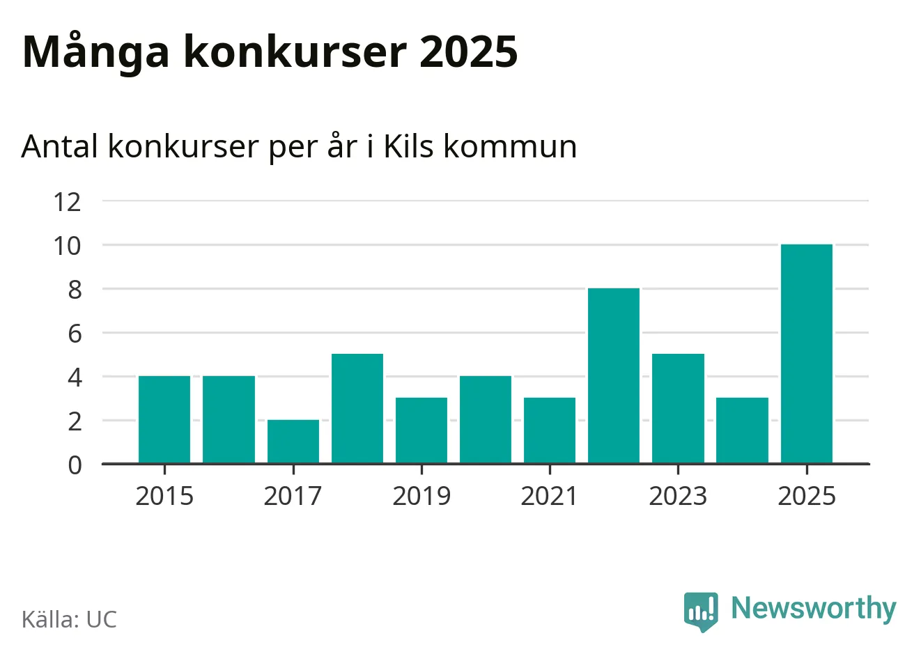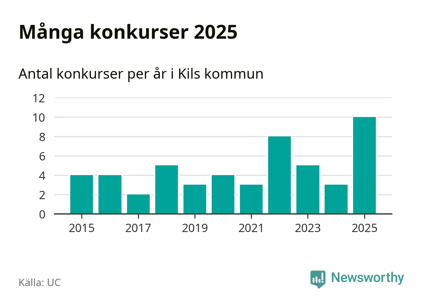 Under år 2025 gick sammanlagt tio bolag med säte i Kils kommun i konkurs. Det är det högsta antalet sedan åtminstone år 2015. Det visar ny statistik från UC.