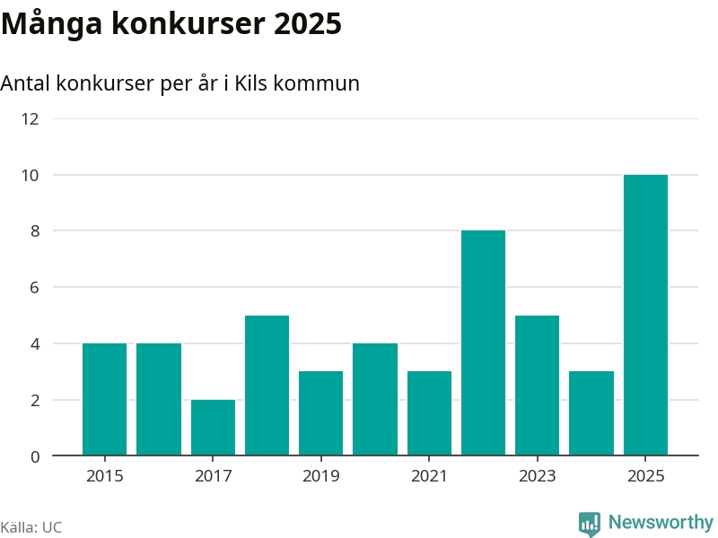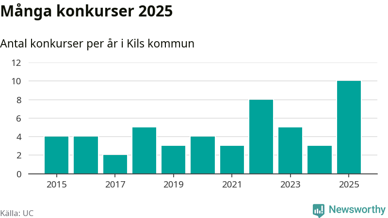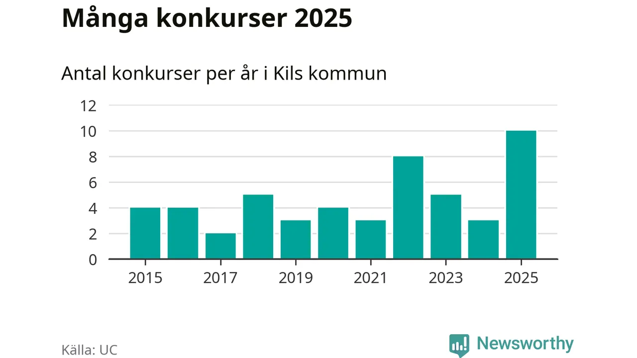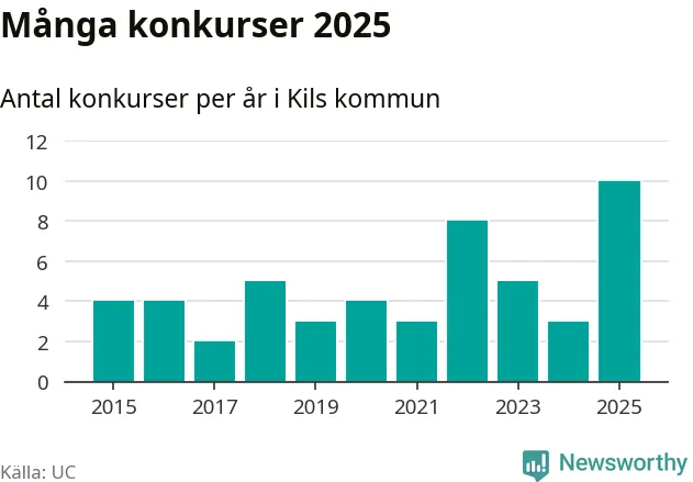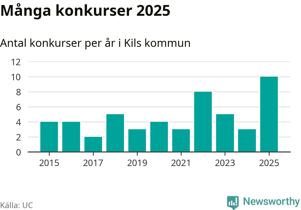 Under år 2025 gick sammanlagt tio bolag med säte i Kils kommun i konkurs. Det är det högsta antalet sedan åtminstone år 2015. Det visar ny statistik från UC.
