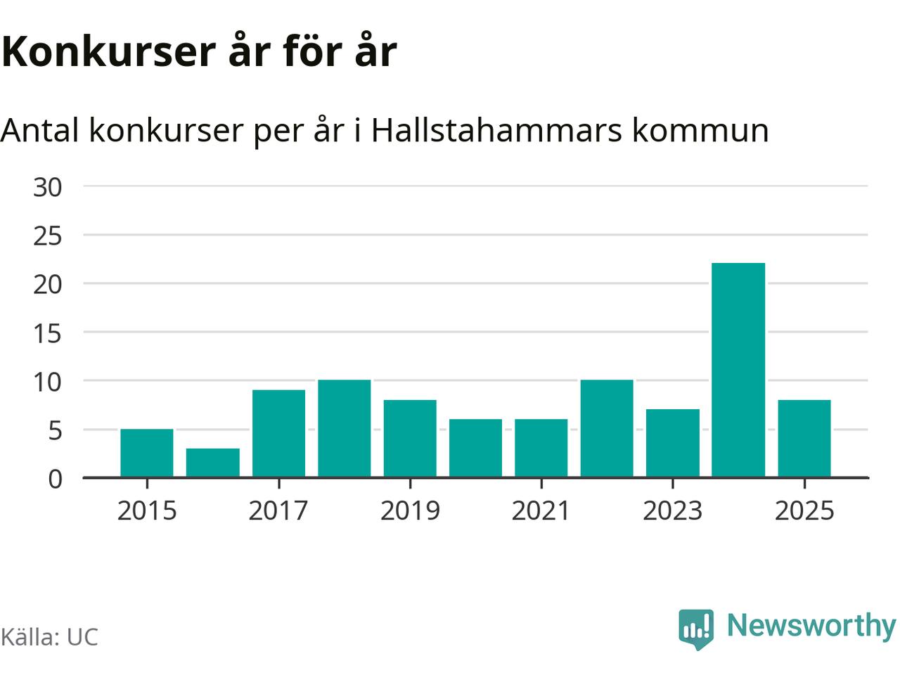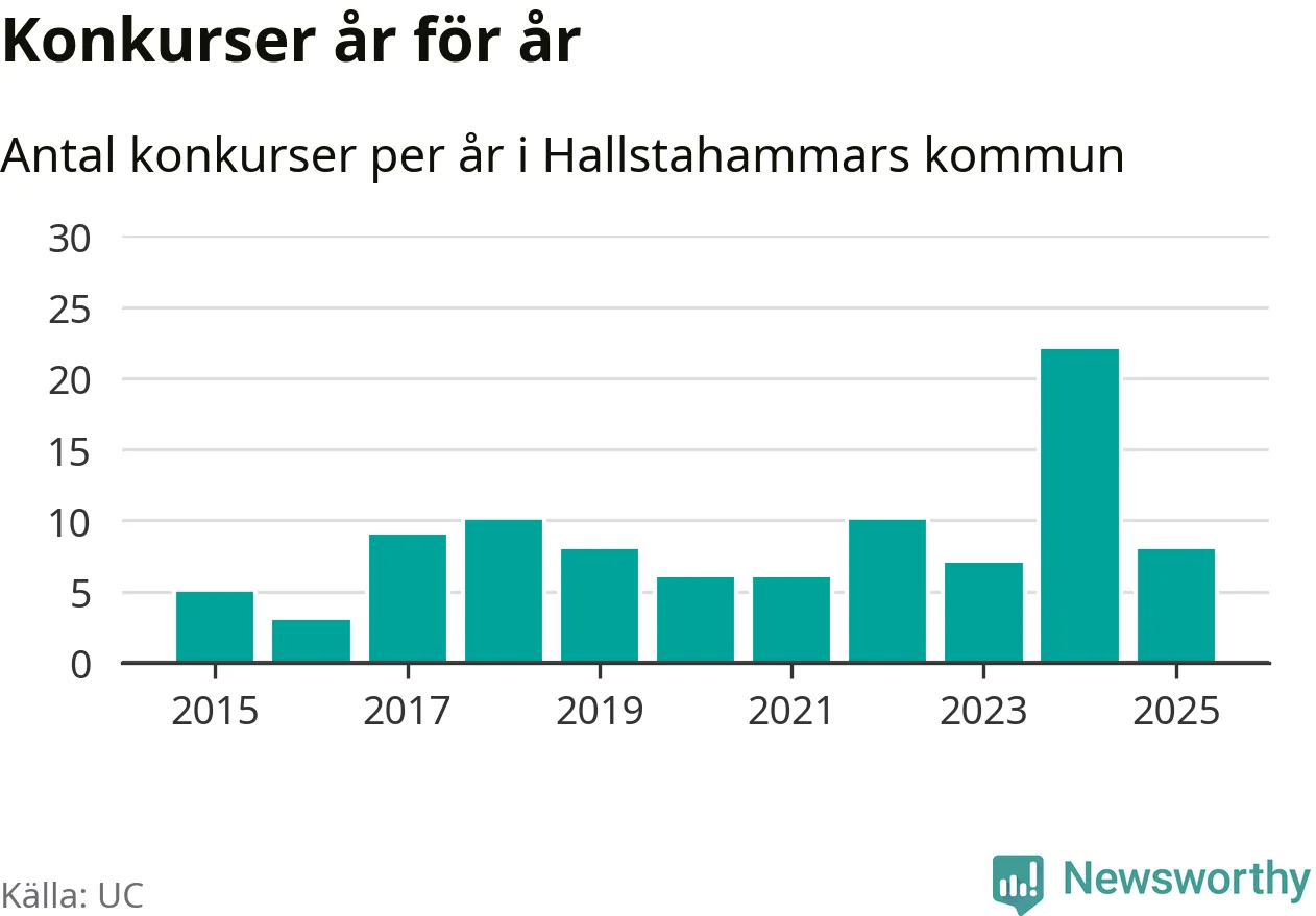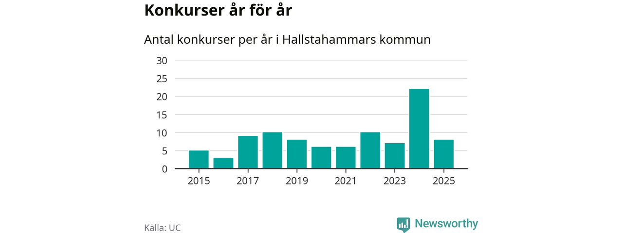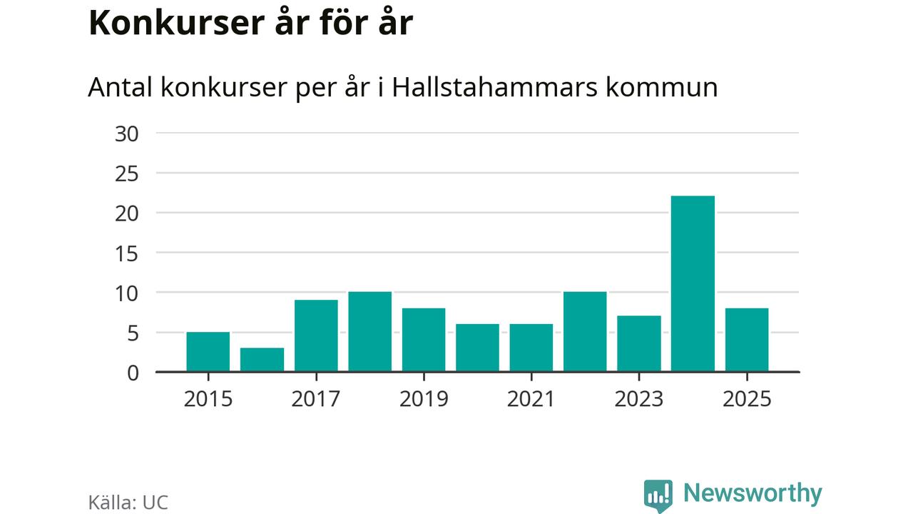 Under år 2025 gick sammanlagt åtta bolag med säte i Hallstahammars kommun i konkurs. Det är 14 färre än året innan då 22 bolag gick i konkurs. Toppåret, sedan 2015, var just 2024 sett till antalet konkursföretag. Det visar ny statistik från UC.