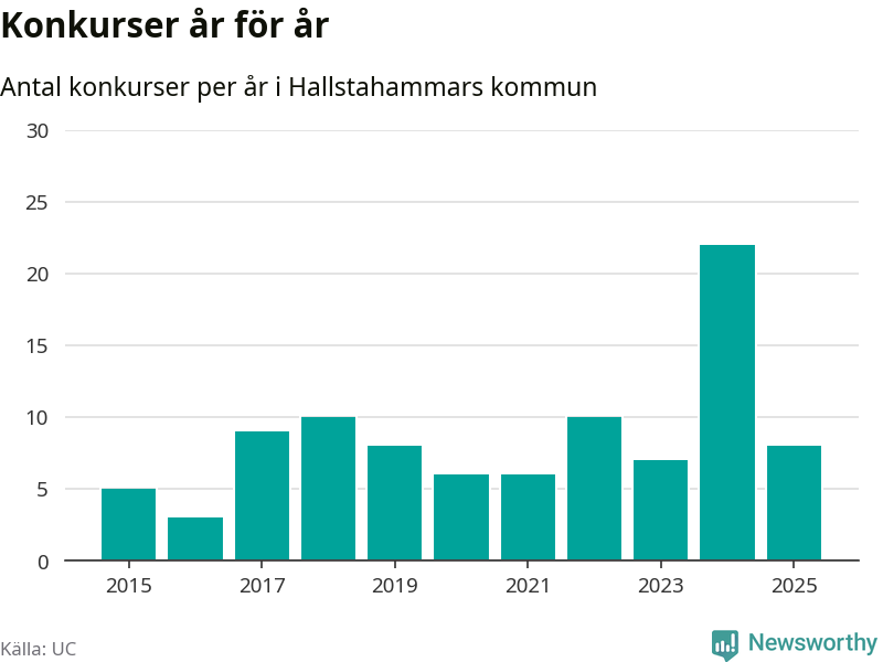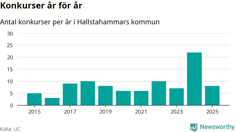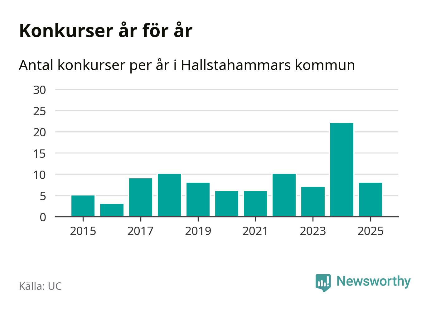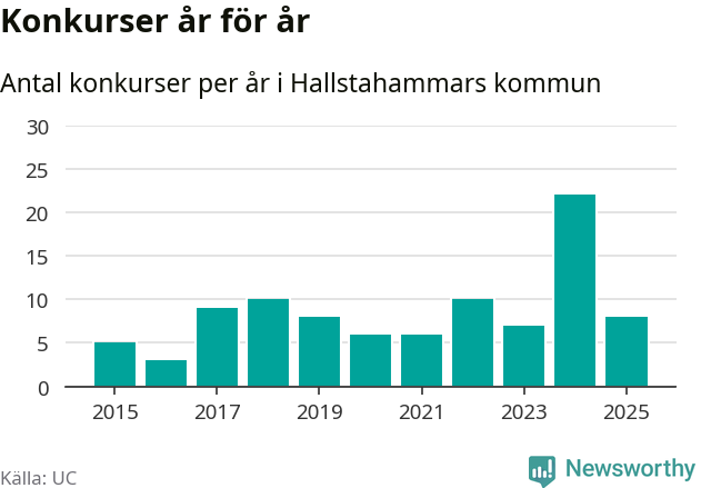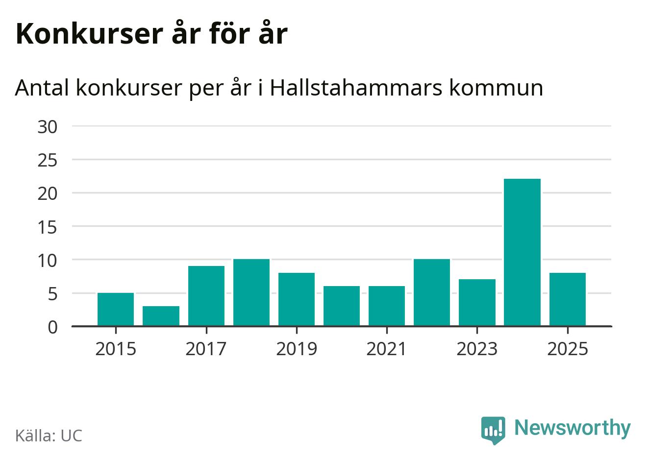 Under år 2025 gick sammanlagt åtta bolag med säte i Hallstahammars kommun i konkurs. Det är 14 färre än året innan då 22 bolag gick i konkurs. Toppåret, sedan 2015, var just 2024 sett till antalet konkursföretag. Det visar ny statistik från UC.