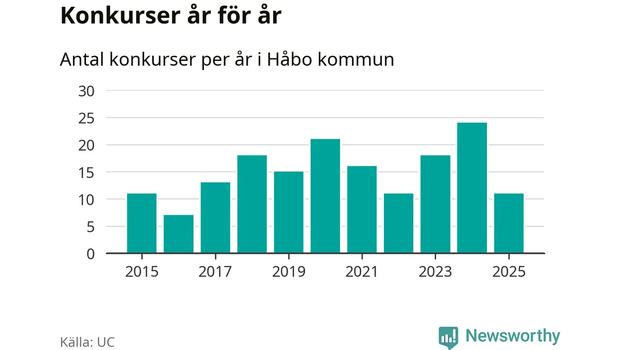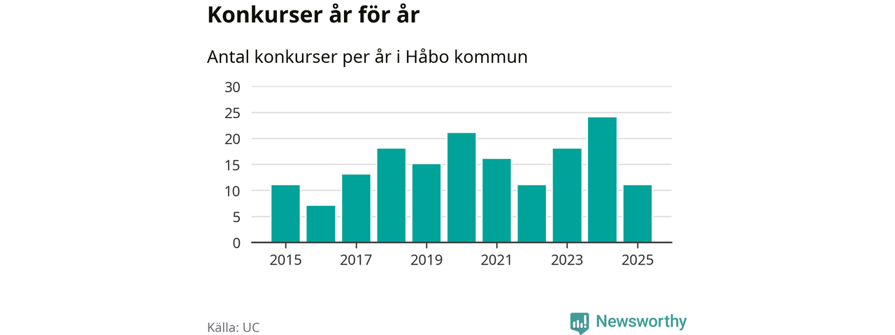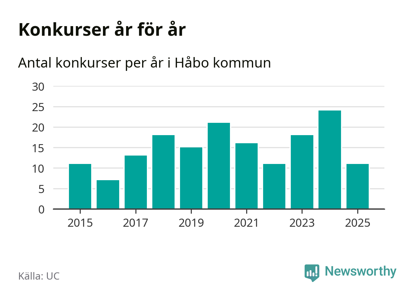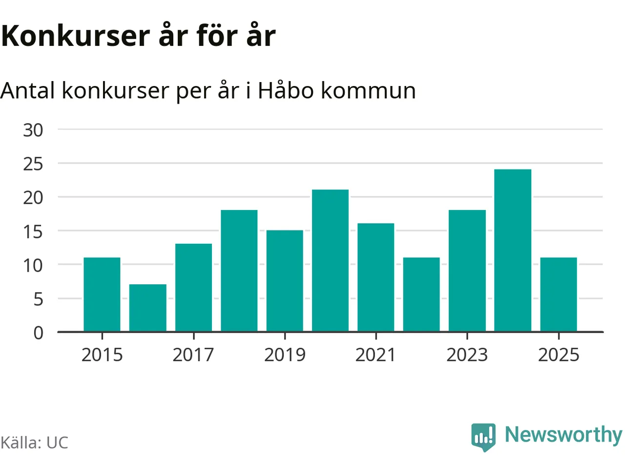 Under år 2025 gick sammanlagt elva bolag med säte i Håbo kommun i konkurs. Det är 13 färre än året innan då 24 bolag gick i konkurs. Toppåret, sedan 2015, var just 2024 sett till antalet konkursföretag. Det visar ny statistik från UC.
