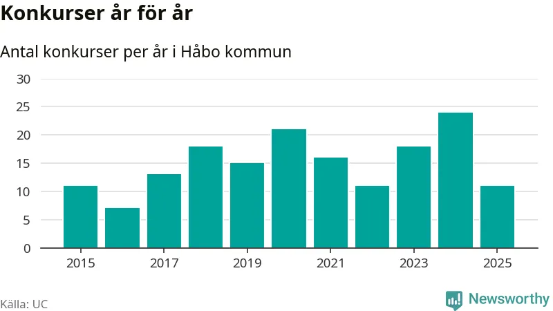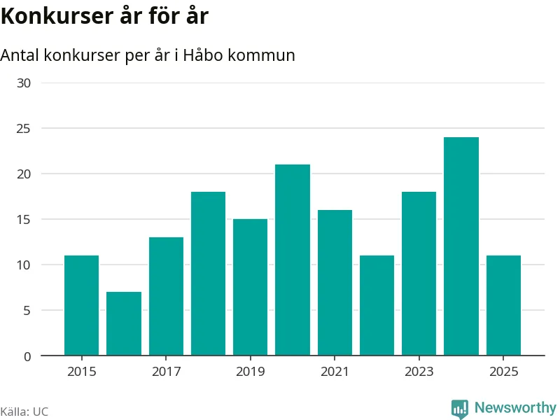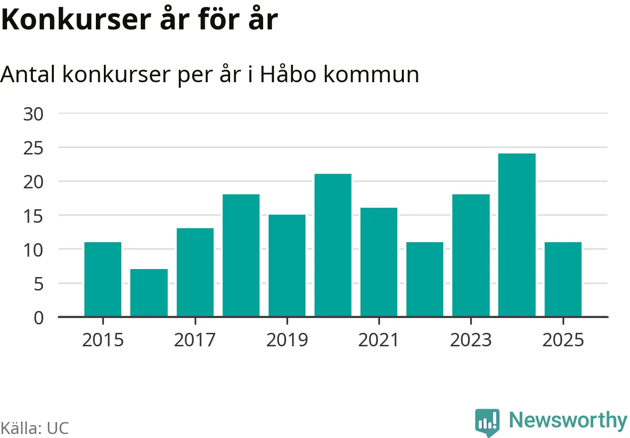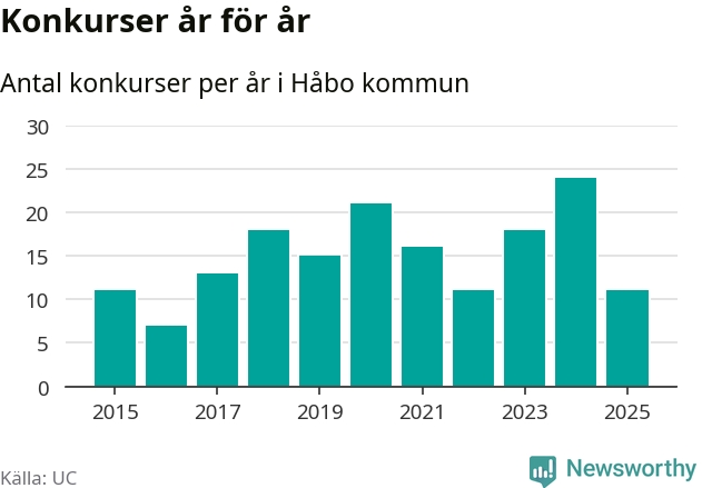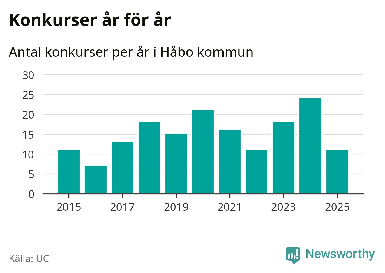 Under år 2025 gick sammanlagt elva bolag med säte i Håbo kommun i konkurs. Det är 13 färre än året innan då 24 bolag gick i konkurs. Toppåret, sedan 2015, var just 2024 sett till antalet konkursföretag. Det visar ny statistik från UC.